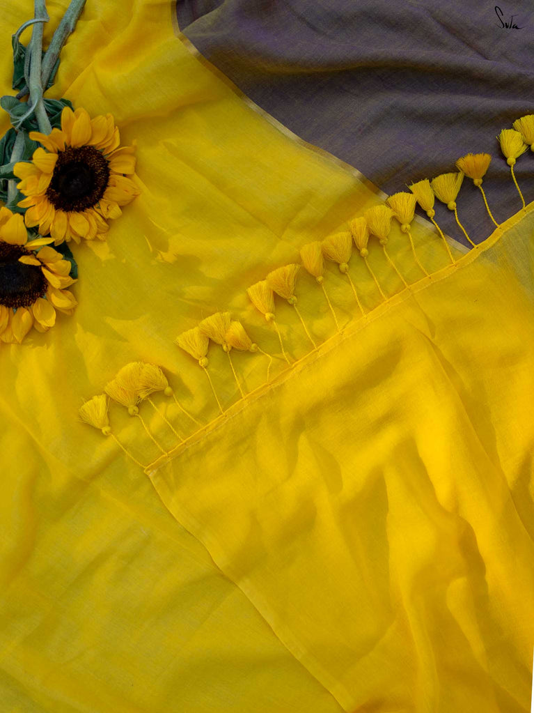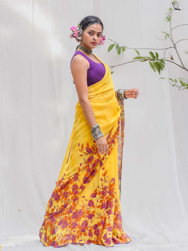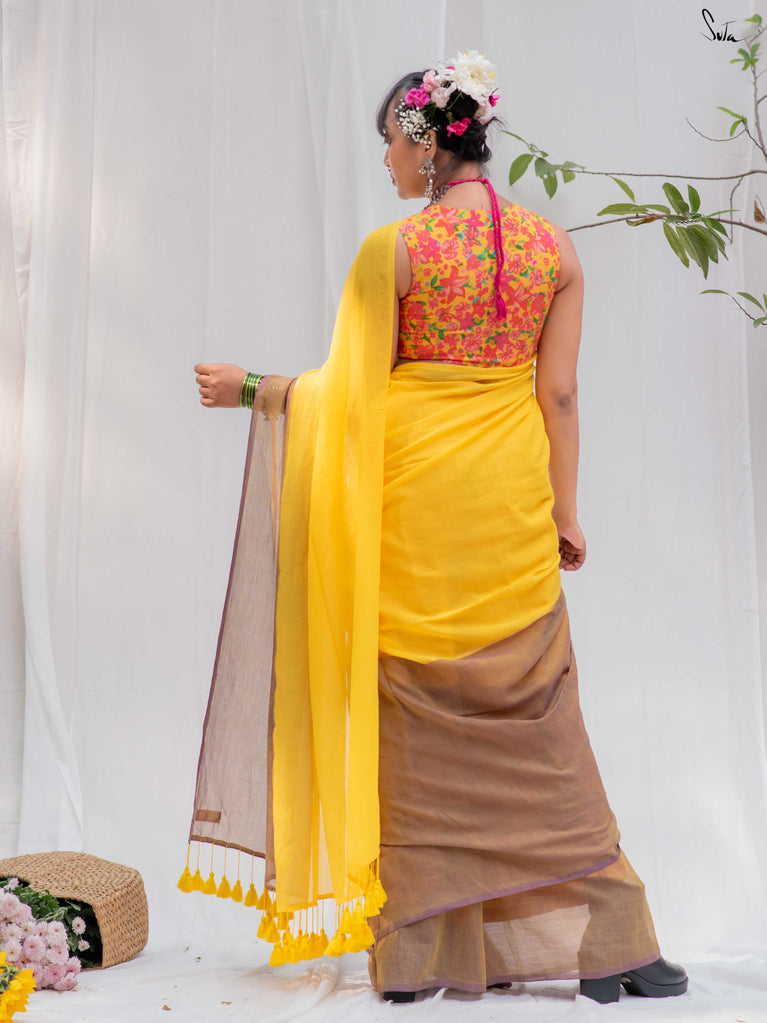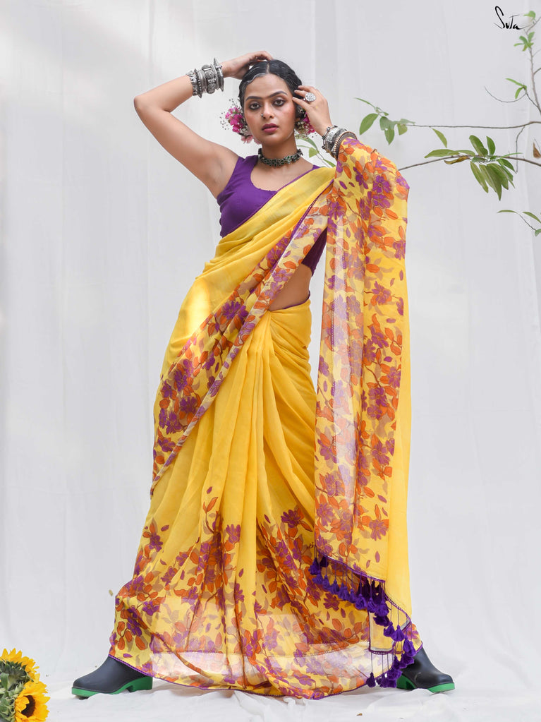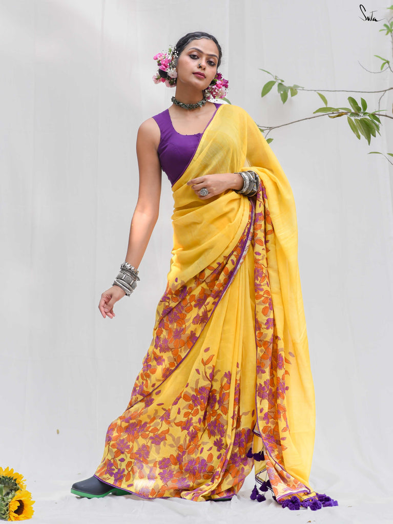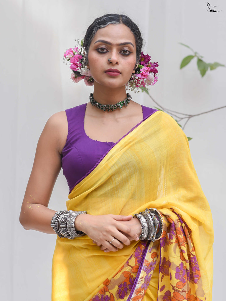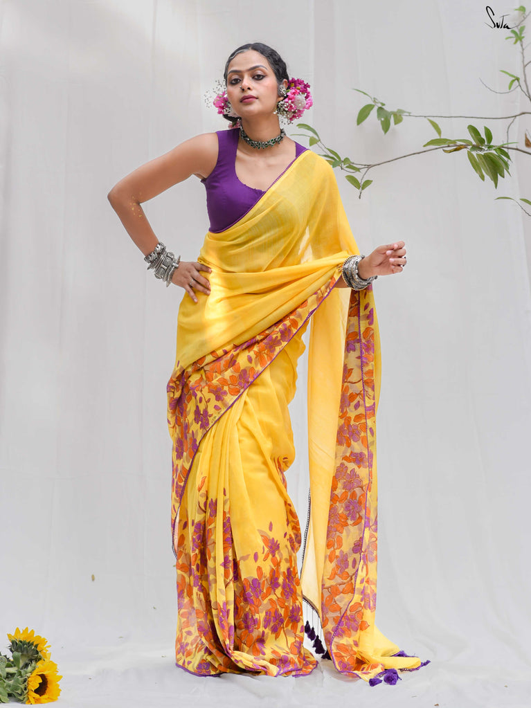 Inspired by the striking semal bloom, this saree brings together the warmth of yellow with bold, blossoming purples. The mul-modal drape is soft, fluid, and effortless, while the crochet lace and tassels add a handcrafted charm that stands out beautifully.