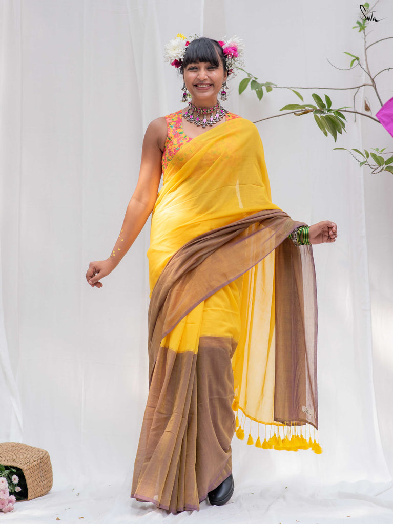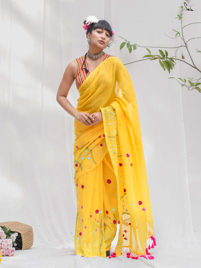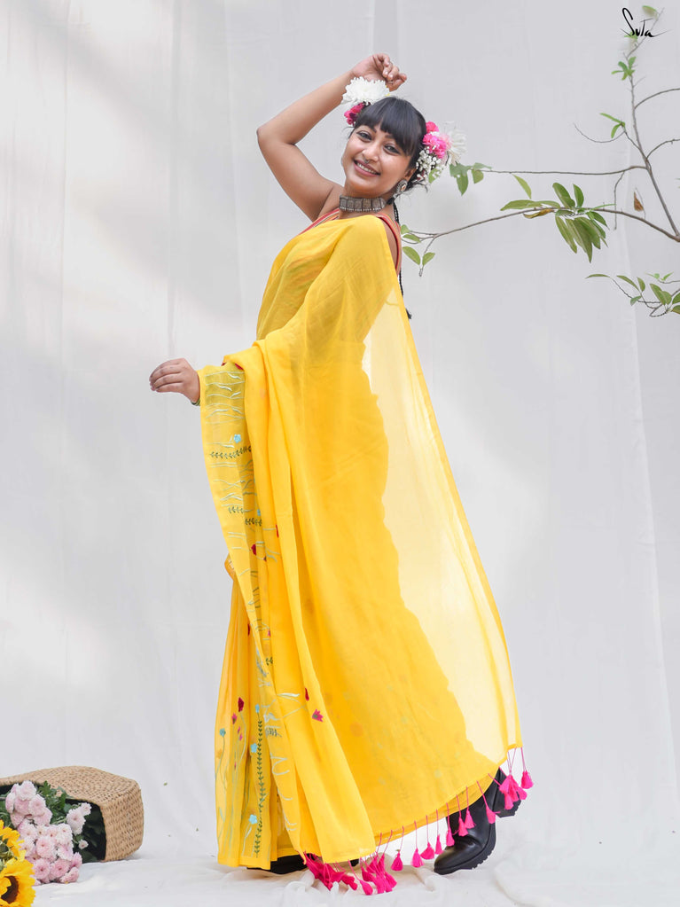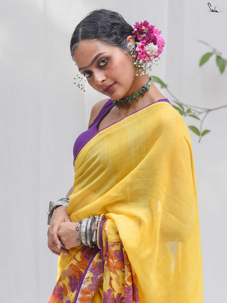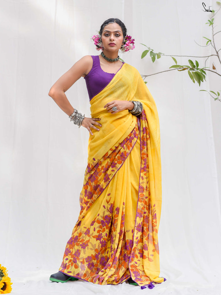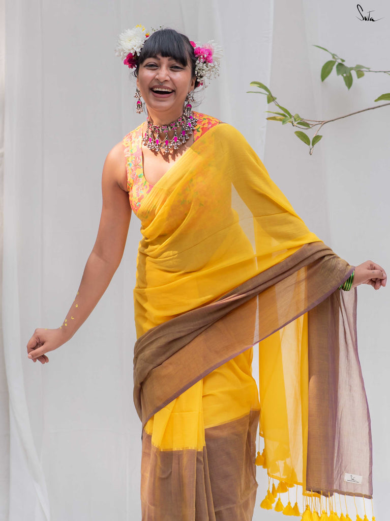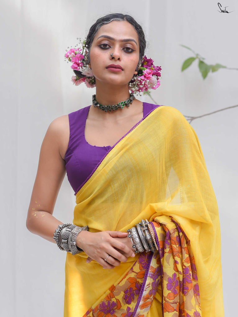 Inspired by the striking semal bloom, this saree brings together the warmth of yellow with bold, blossoming purples. The mul-modal drape is soft, fluid, and effortless, while the crochet lace and tassels add a handcrafted charm that stands out beautifully.