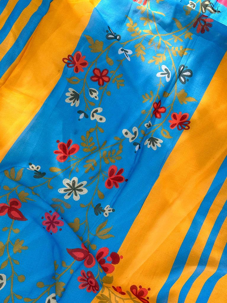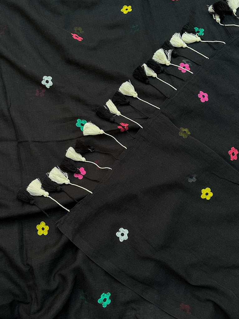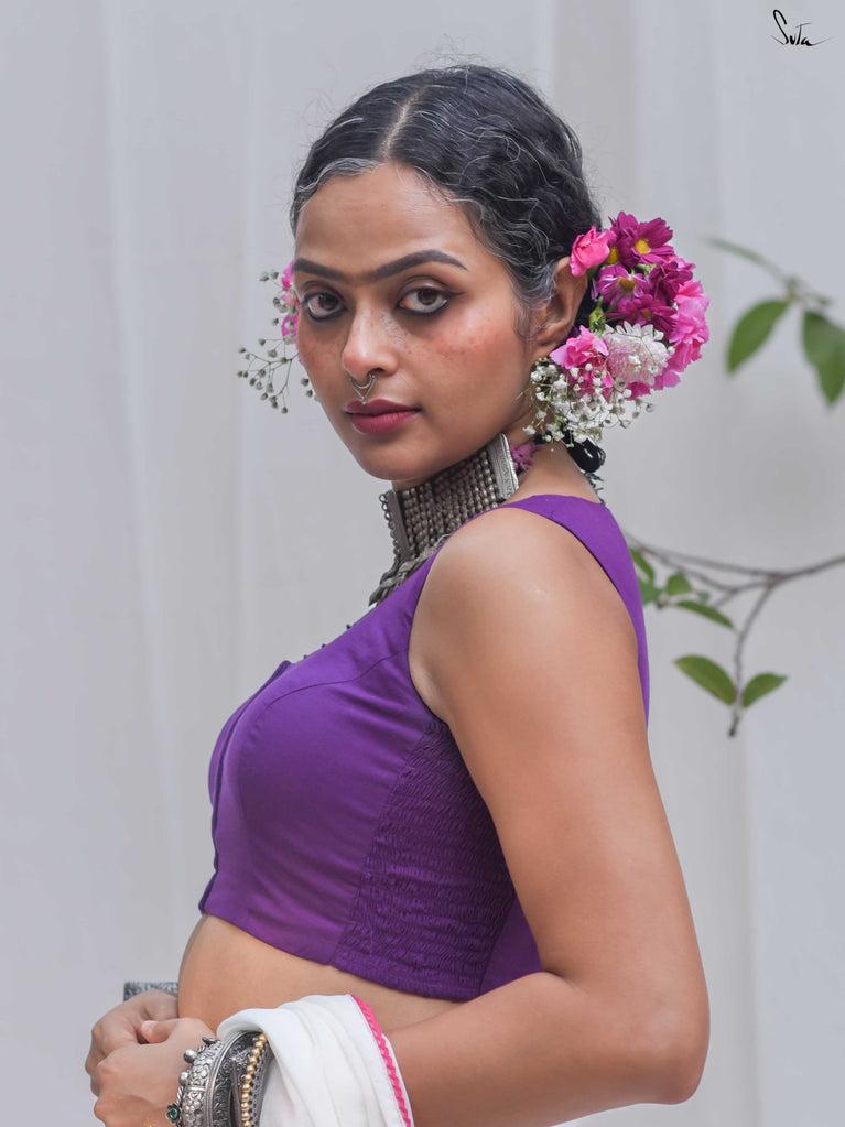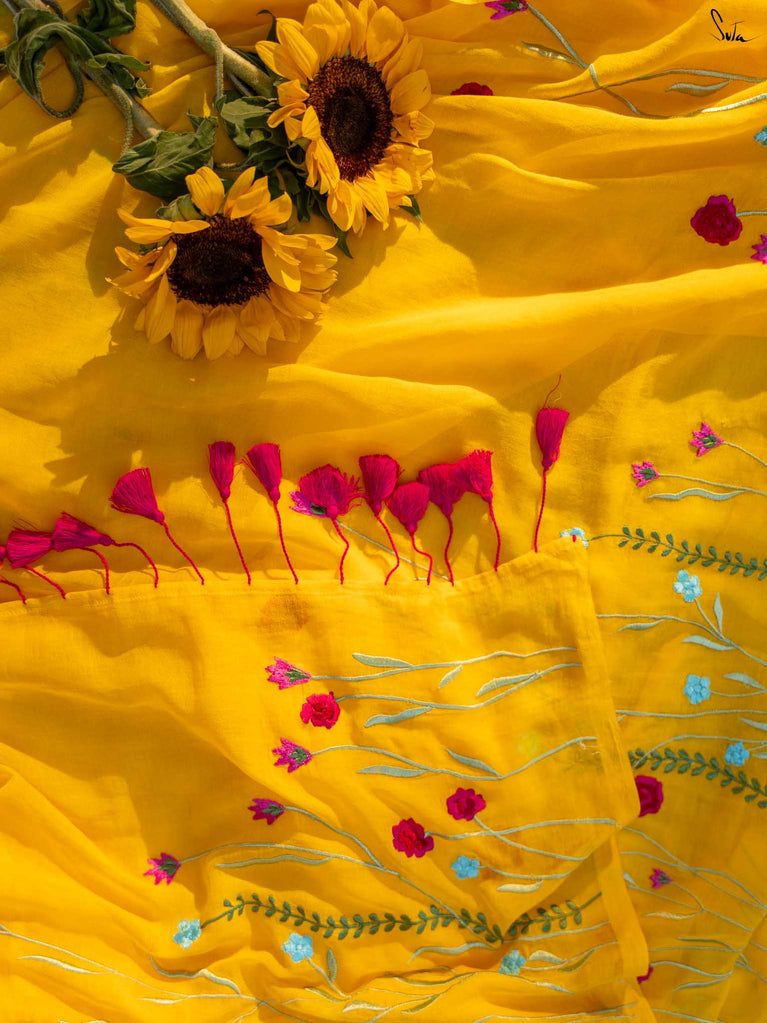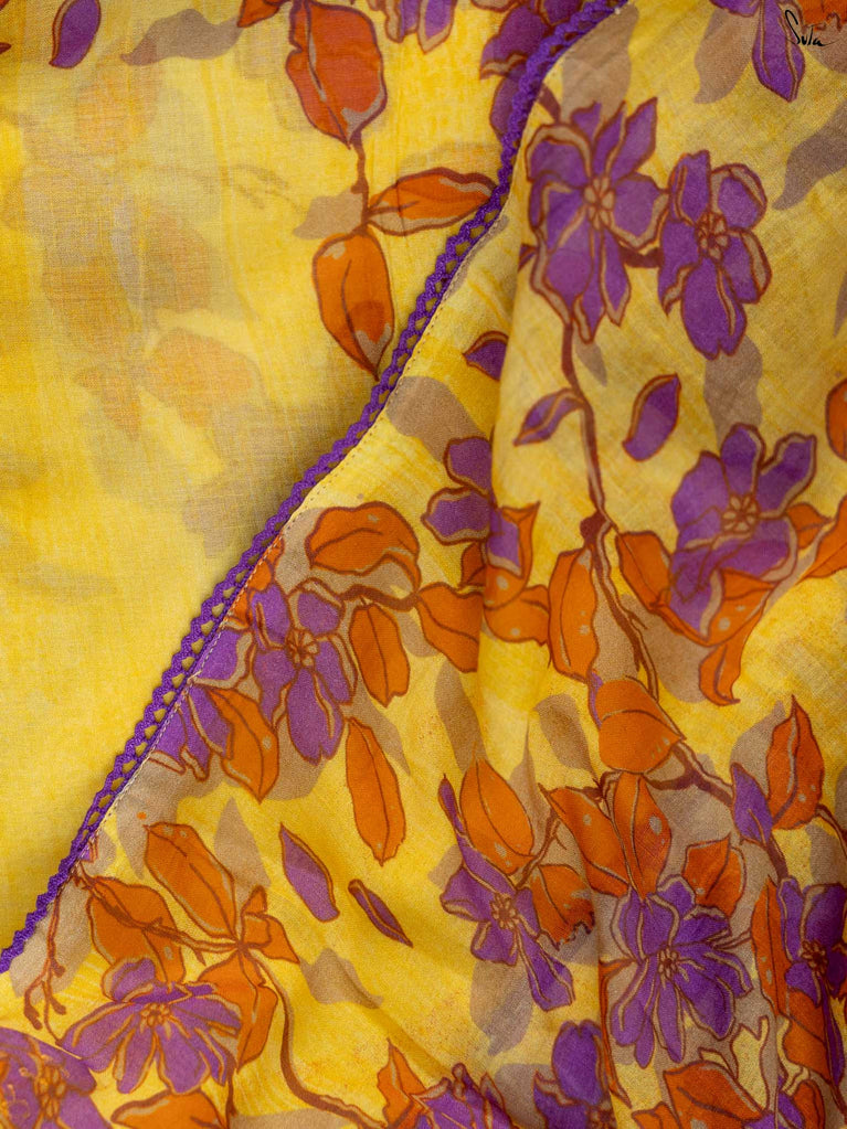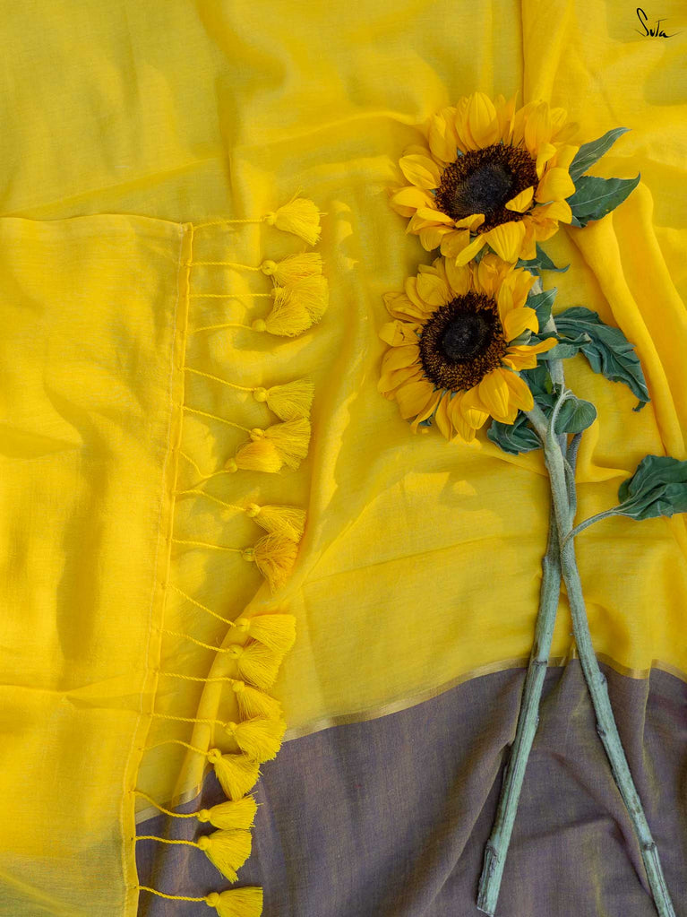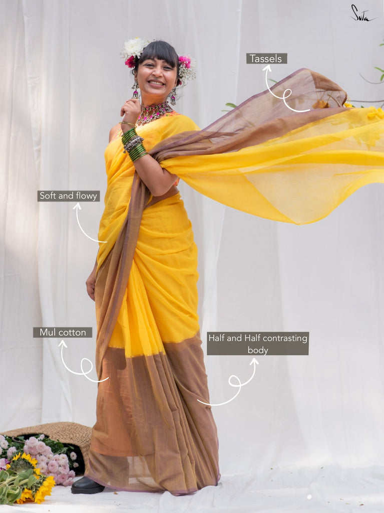 Inspired by the striking semal bloom, this saree brings together the warmth of yellow with bold, blossoming purples. The mul-modal drape is soft, fluid, and effortless, while the crochet lace and tassels add a handcrafted charm that stands out beautifully.