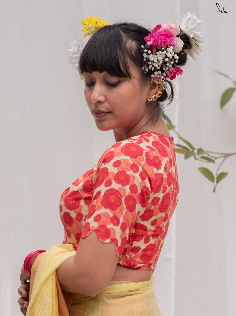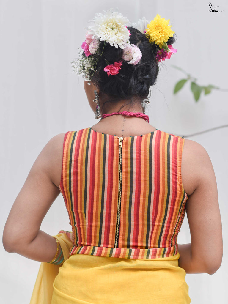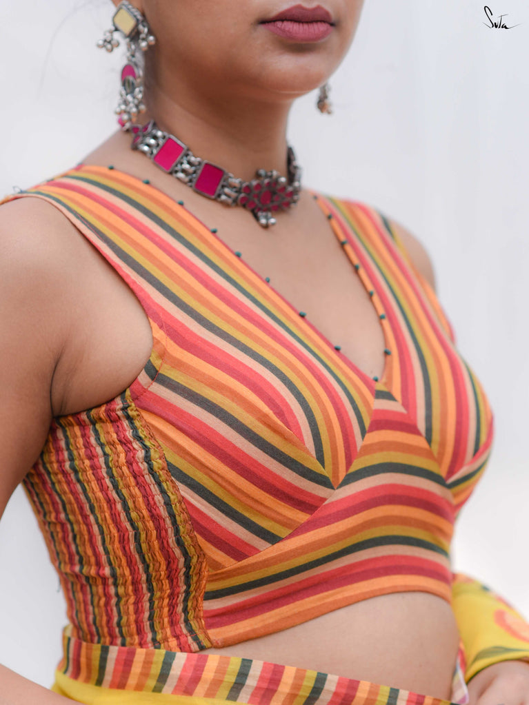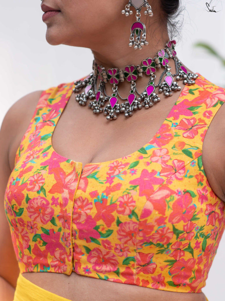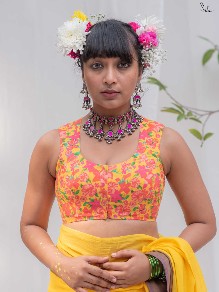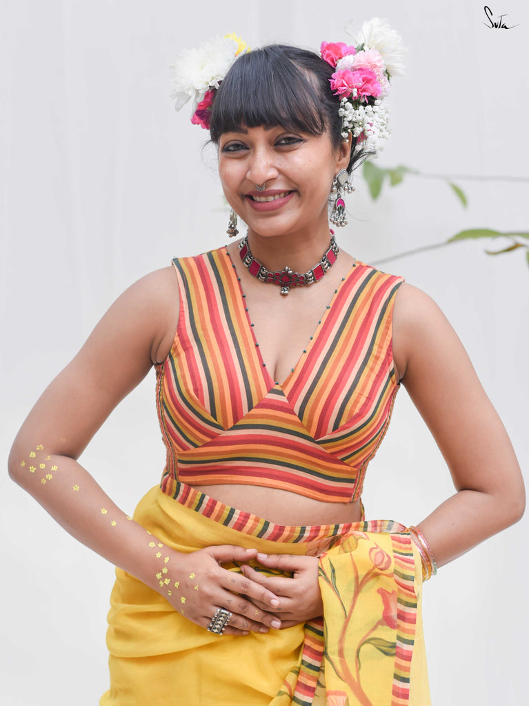Vibrant, playful, and full of Basant’s colourful spirit, this blouse brings a lively burst of hues to every drape. The cotton fabric keeps it breathable and easy, while the V-neckline and side elastic ensure a flattering, comfortable fit. A sleek zip closure adds convenience and a modern finish.