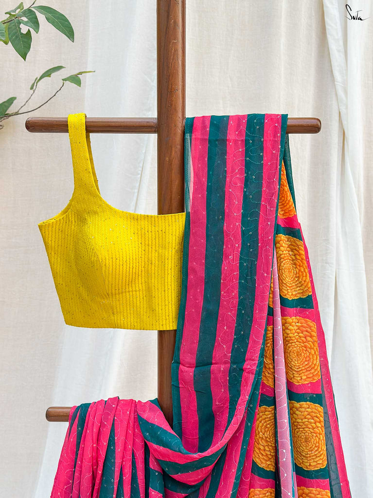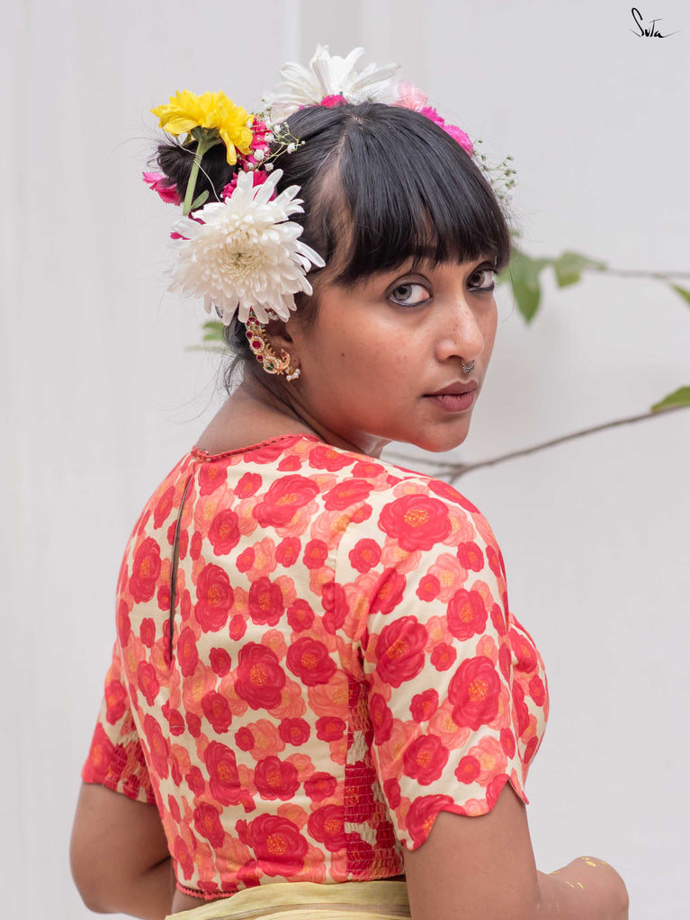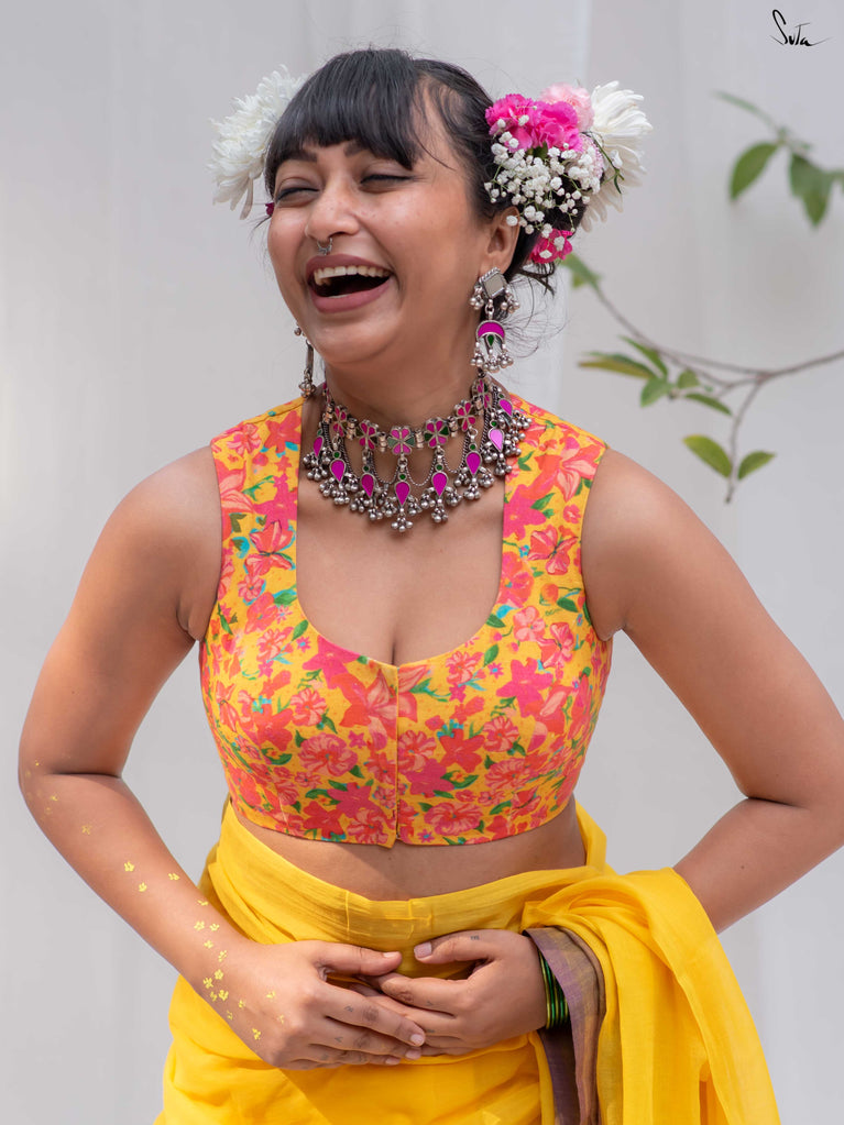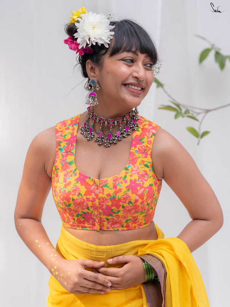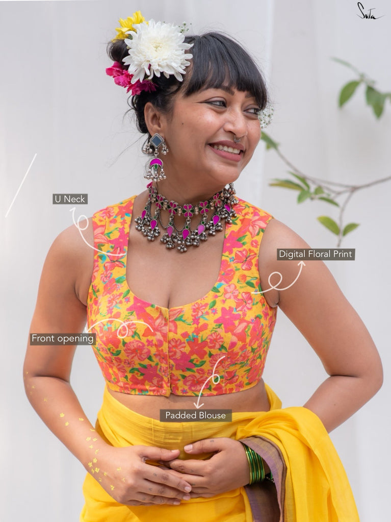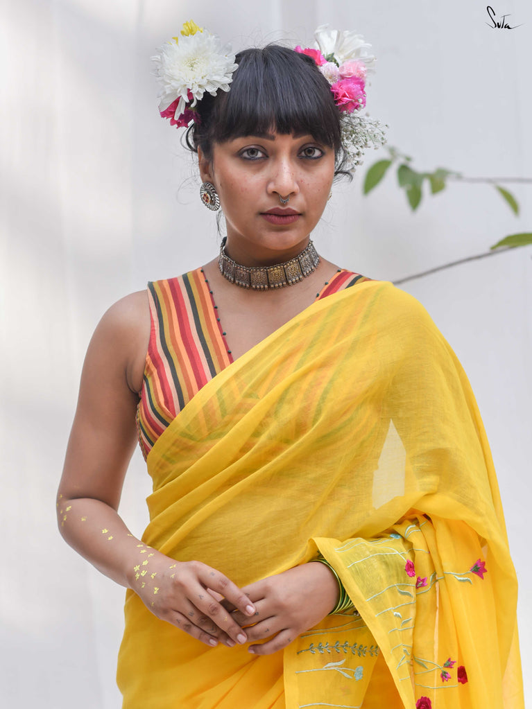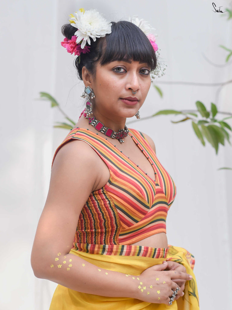 Saree: Su, the model is wearing a size S blouse and the saree called Sarso Sa Basant