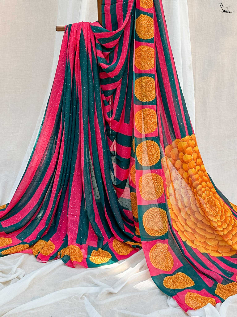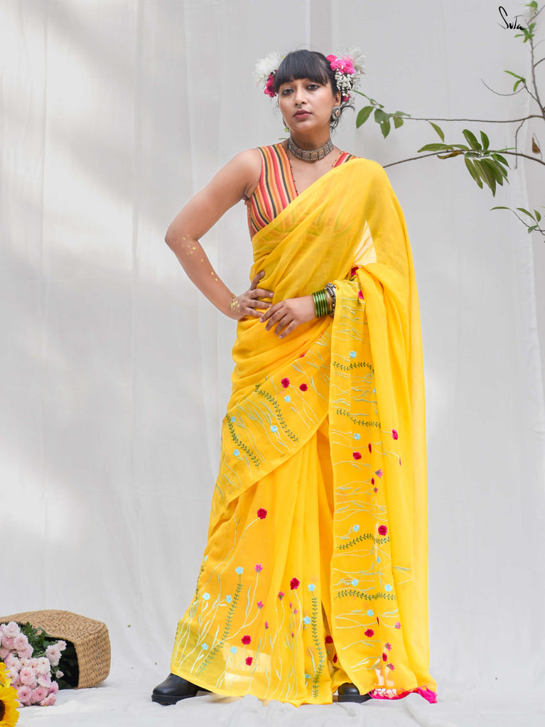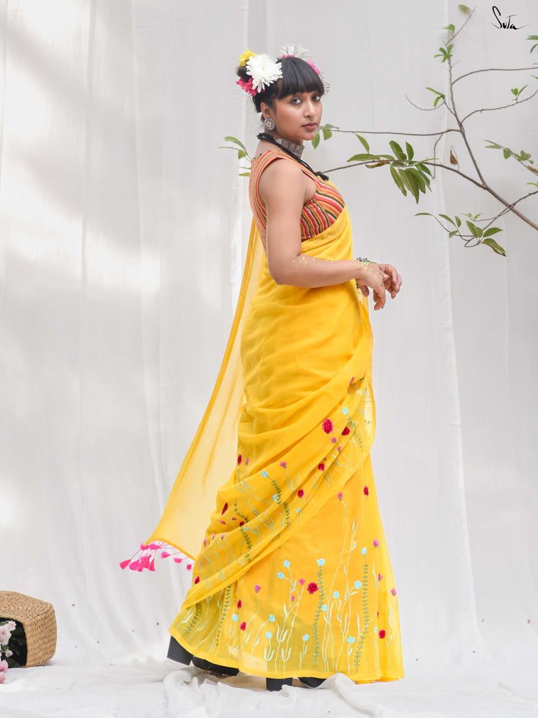Saree: Su, the model is wearing a size S blouse and the saree called Kaner Sa Basant