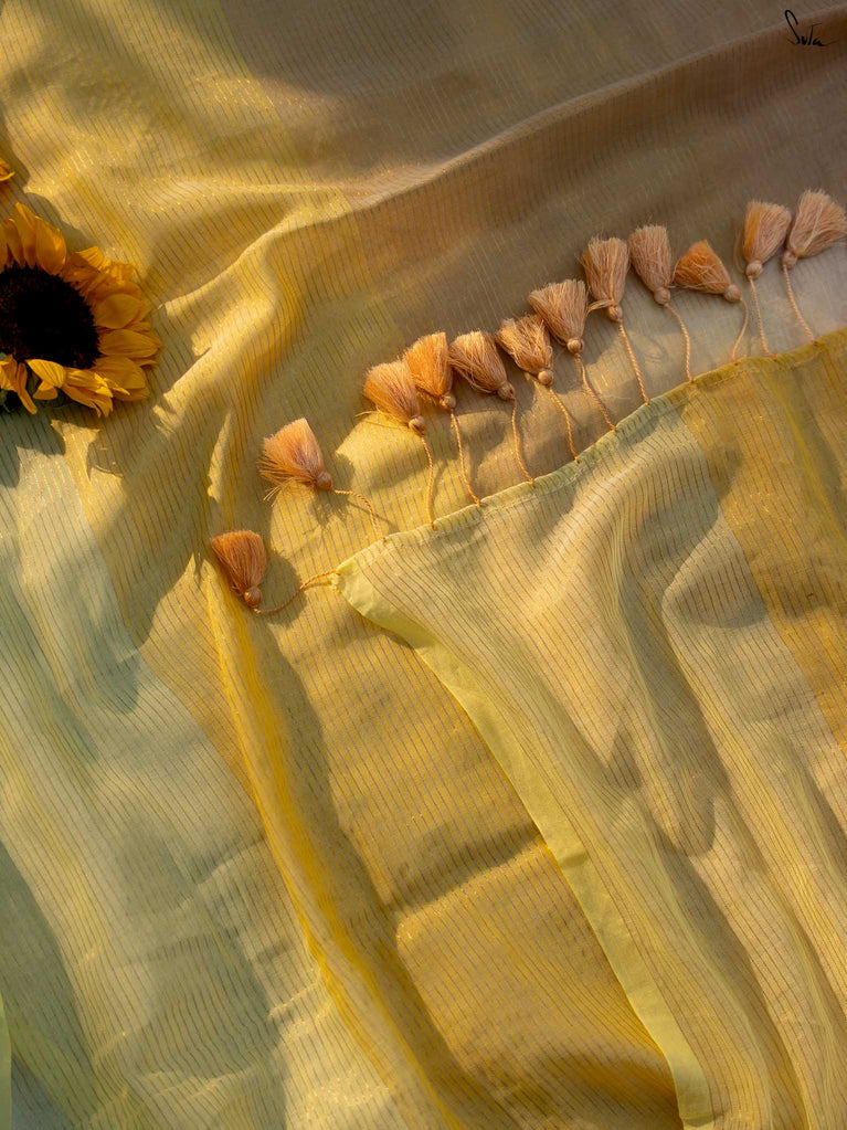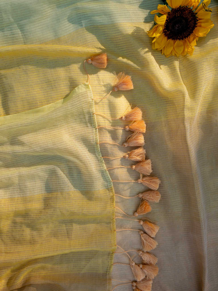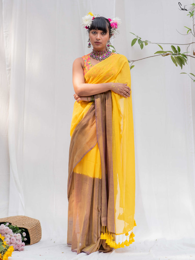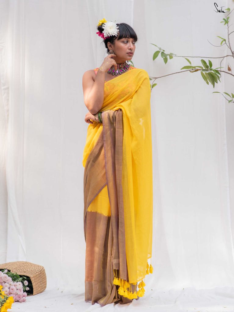 Bold yet rooted in tradition, this saree echoes the contrasting hues of mustard fields meeting spring skies. The woven texture adds depth, while the gold zari line running through the centre brings a gentle festive sheen. Finished with bright yellow tassels, it’s a playful, vibrant ode to Basant.