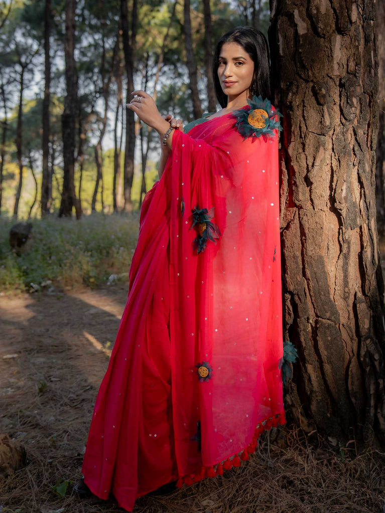This saree is a burst of warmth woven into the softest mul cotton. The fiery red base feels like a sunset you can wear - light, breathable and oh-so-comforting against the skin.