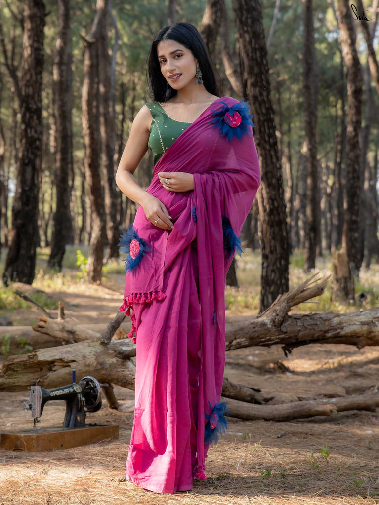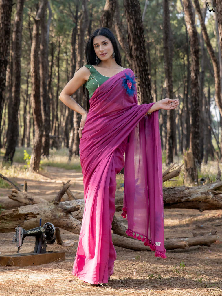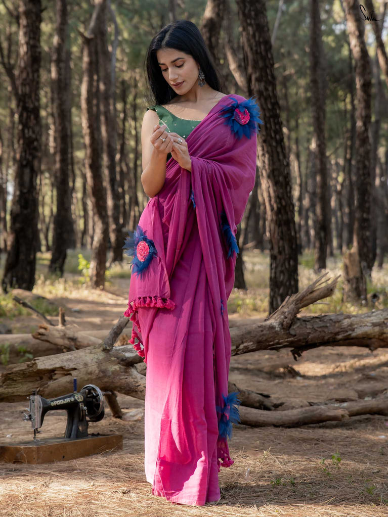 This saree is a playful splash of colour, crafted in whisper-soft mul cotton that feels like second skin. The vibrant pink hue brings instant cheer, turning every moment into a bright, blooming one.