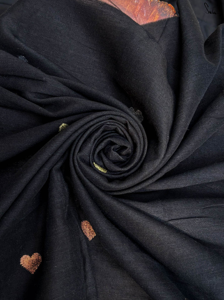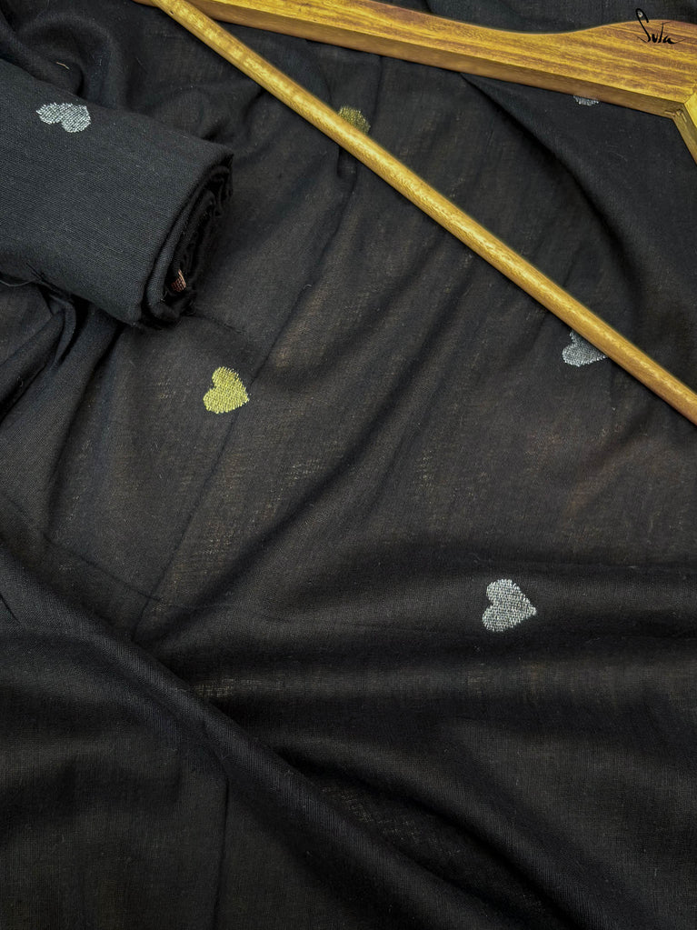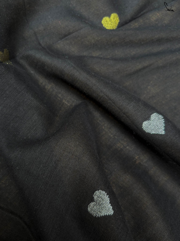 This saree is timeless elegance with a blooming twist. The soft black mul cotton drapes like a dream - lightweight, breathable, and endlessly flattering, making it a perfect go-anywhere, glow-everywhere piece.