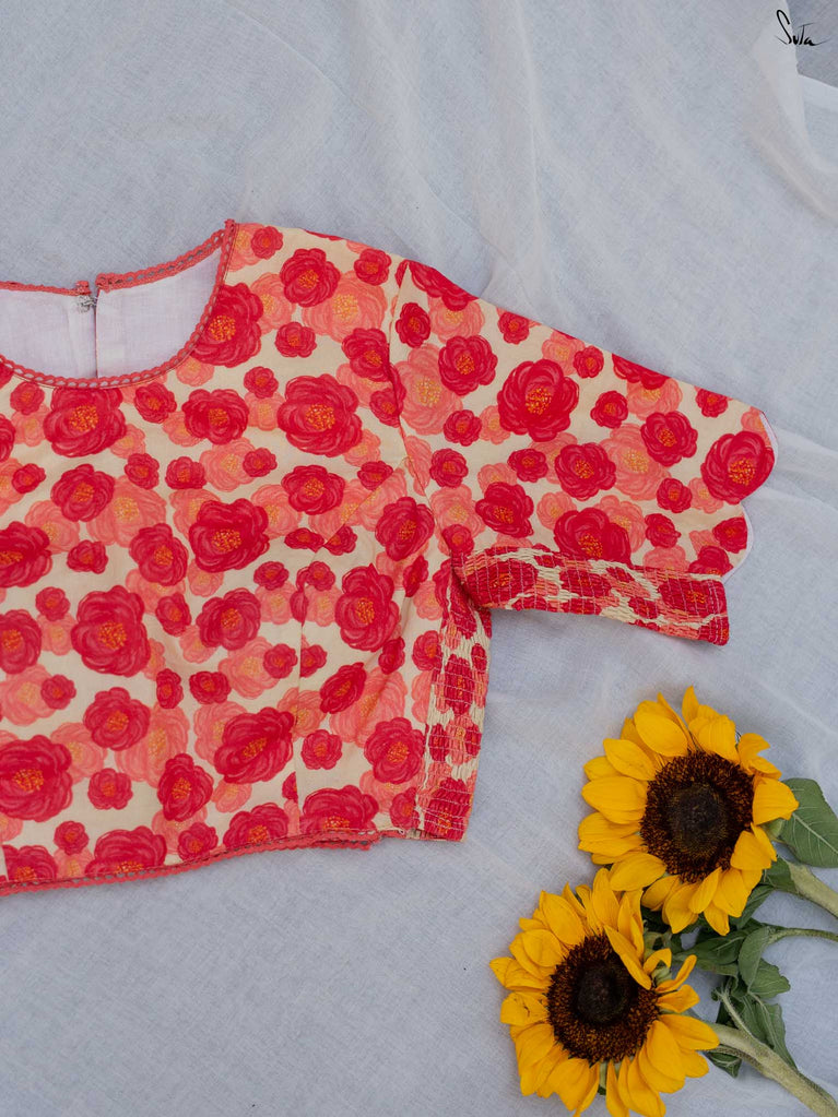 Soft, feminine, and effortless, this blouse blooms with delicate digital florals on a soothing pink base. The breathable cotton fabric keeps it light and easy, while the side elastic offers a flexible, flattering fit for all-day comfort.