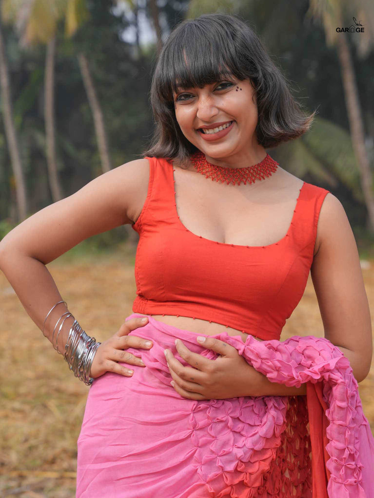 The model is wearing size S blouse and the saree is Dipped in Gulaal