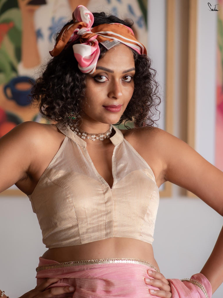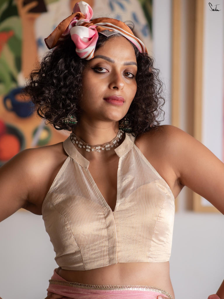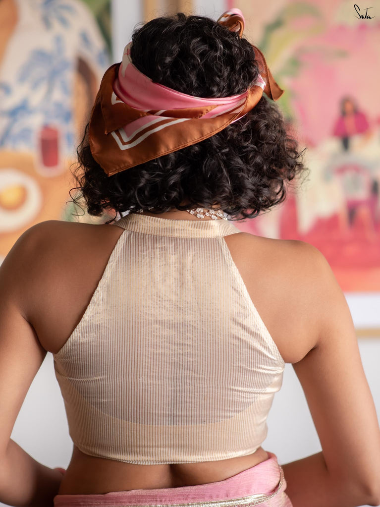 This off-white silk organza blouse features delicate gold zari stripes that lend it a subtle shimmer and graceful texture. Designed with a sleeveless silhouette and a striking halter V-neckline, it brings a modern elegance to the classic blouse. The padded structure offers shape and comfort, while the front opening ensures ease of wear.