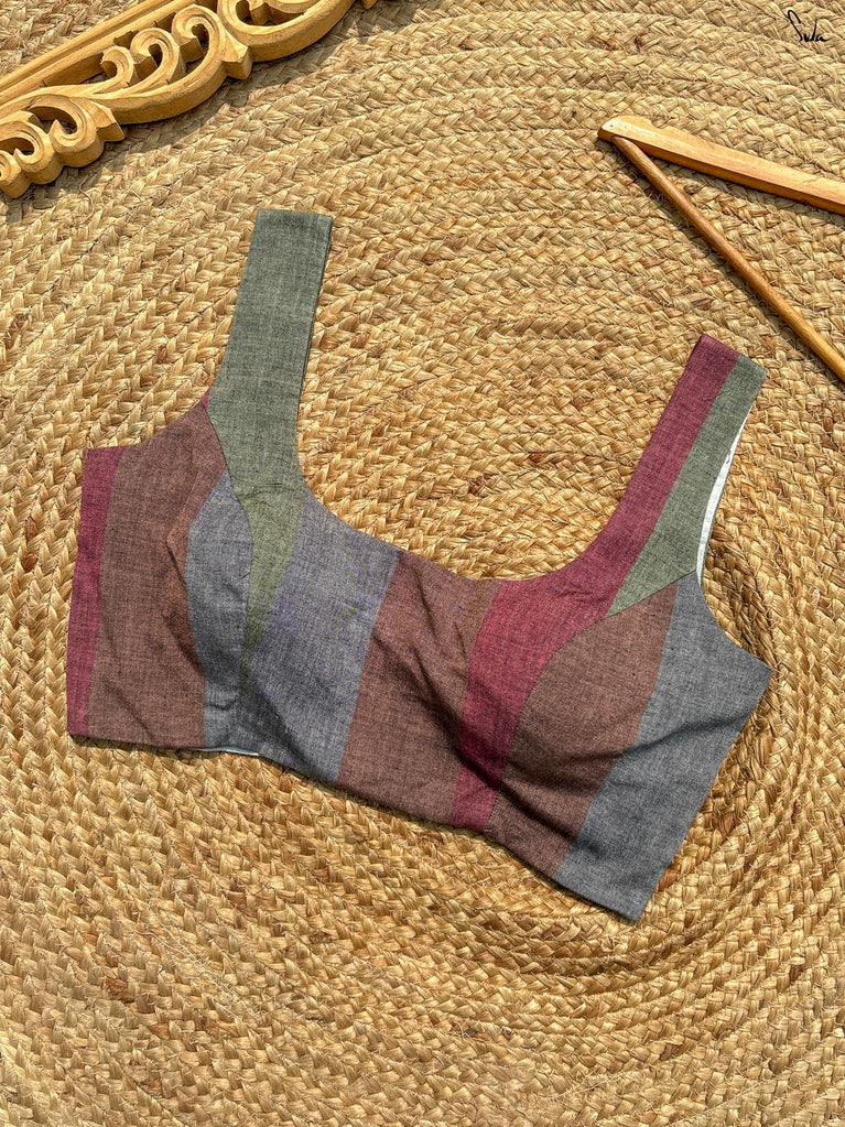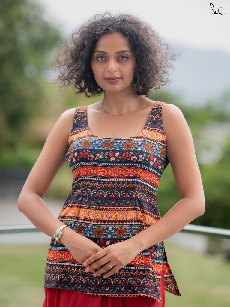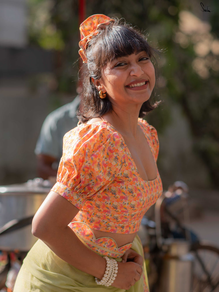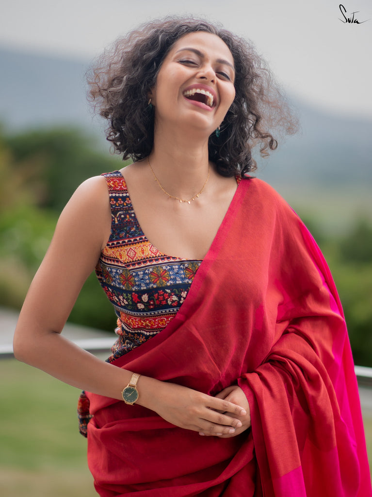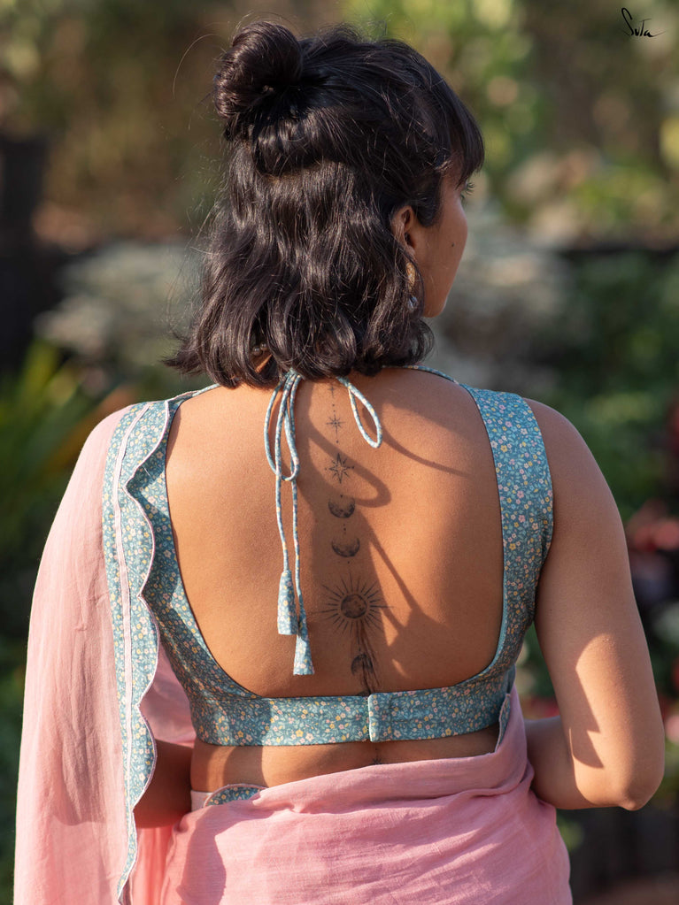 Light, vibrant, and easy to wear. Adi Tara is crafted in breathable Cambric cotton that feels soft and comfortable on the skin. The multicolour floral print adds a cheerful pop, while the sleeveless cut, padded finish, and flattering V-neck create a clean, effortless silhouette. Finished with a back opening, this blouse is made to pair seamlessly with everyday cotton sarees - comfortable, confident, and ready to be worn on repeat.