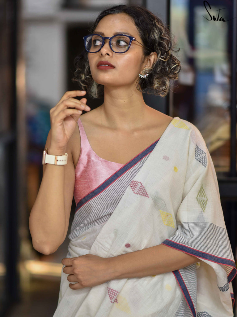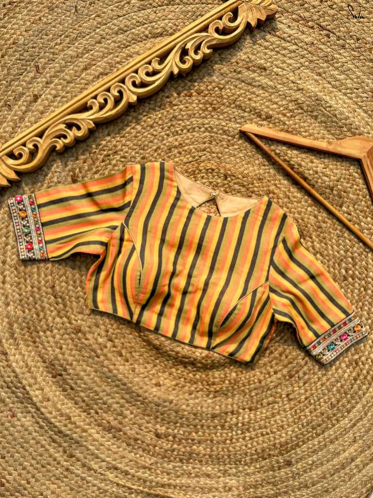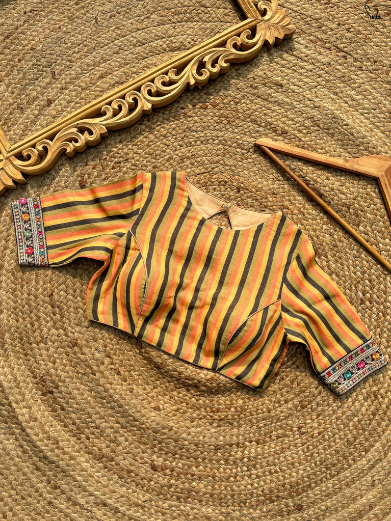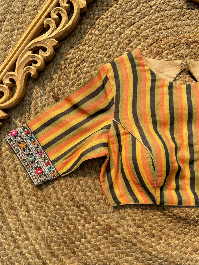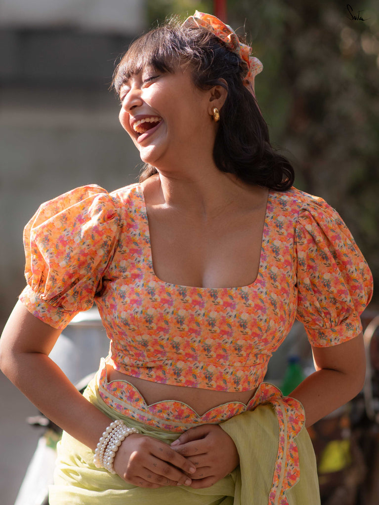 Playful structure with everyday comfort. Amit Chandni is crafted in breathable Cambric cotton that feels soft and easy on the skin. The multicolour print adds charm, while the square neckline and shirt-style puff sleeves bring a hint of vintage drama. Finished with a padded fit and back opening, this blouse balances statement details with all-day comfort - perfect for elevating simple cotton sarees.