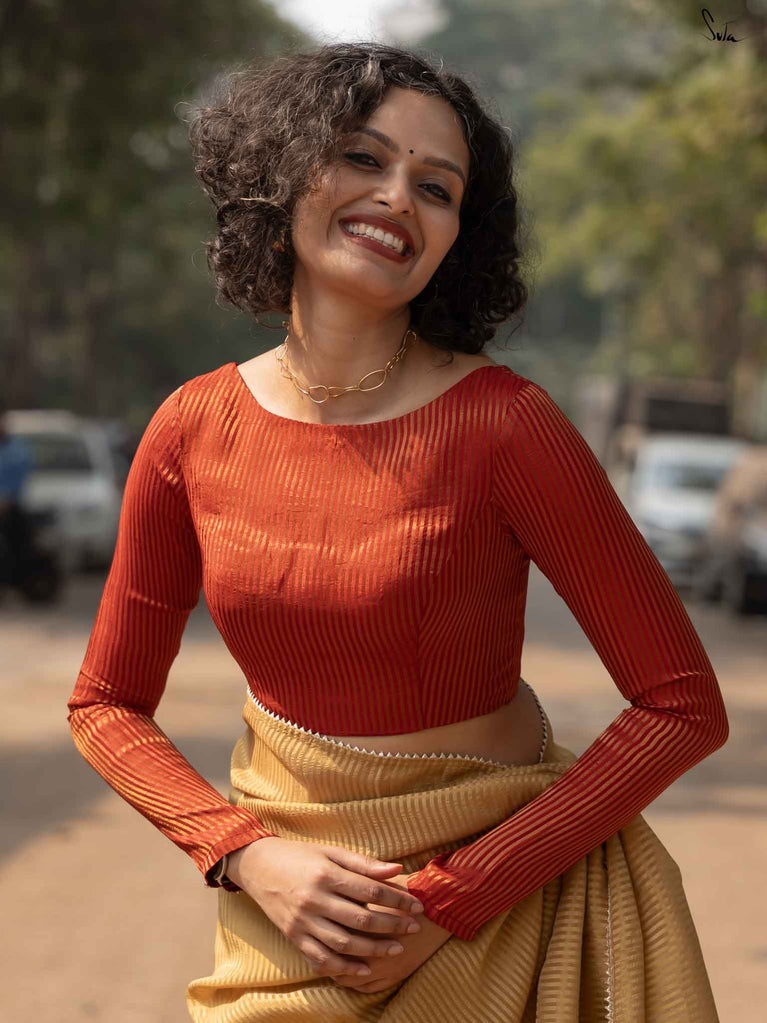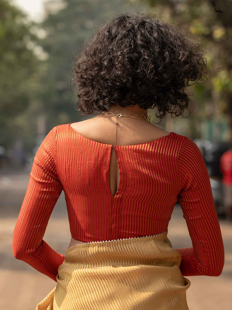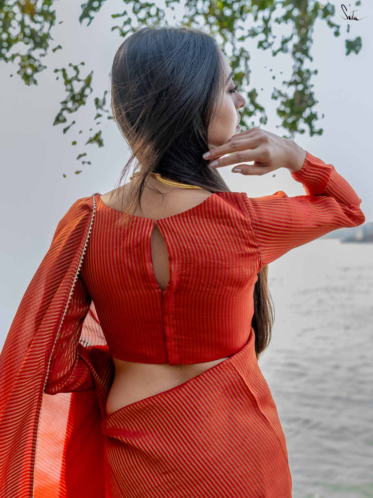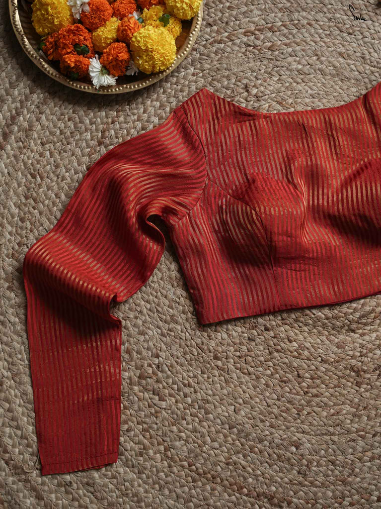 A radiant red blouse crafted from viscose zari with zari stripes. The boat-neck style and full sleeves offer comfort, with a front hook opening for easy wear.