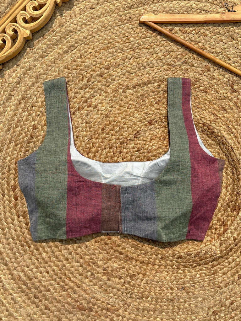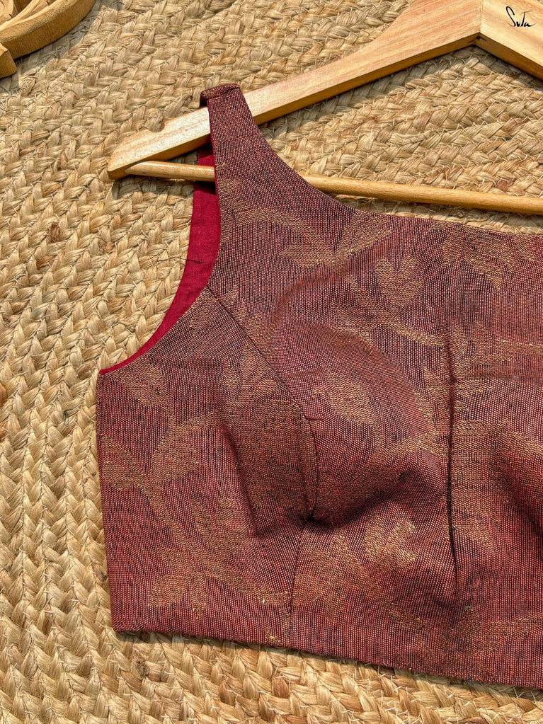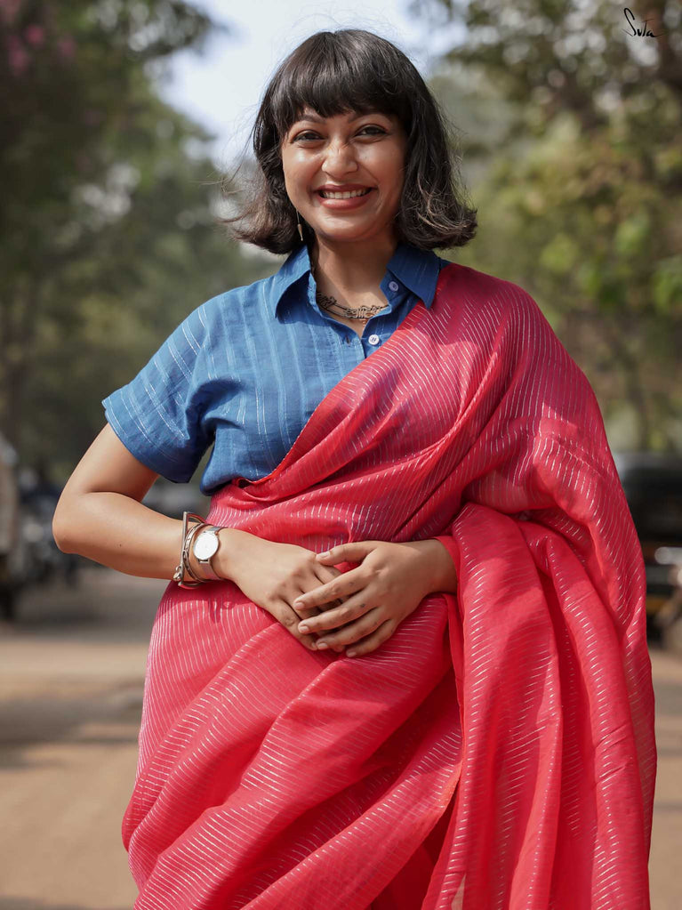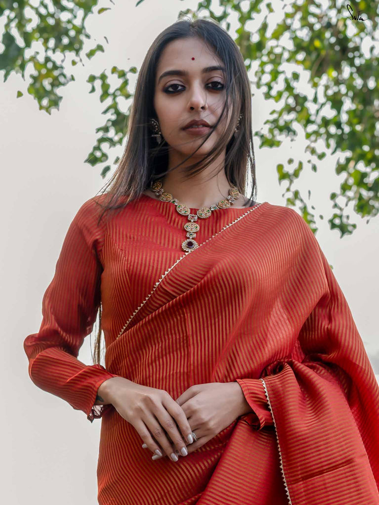 A radiant red blouse crafted from viscose zari with zari stripes. The boat-neck style and full sleeves offer comfort, with a front hook opening for easy wear.