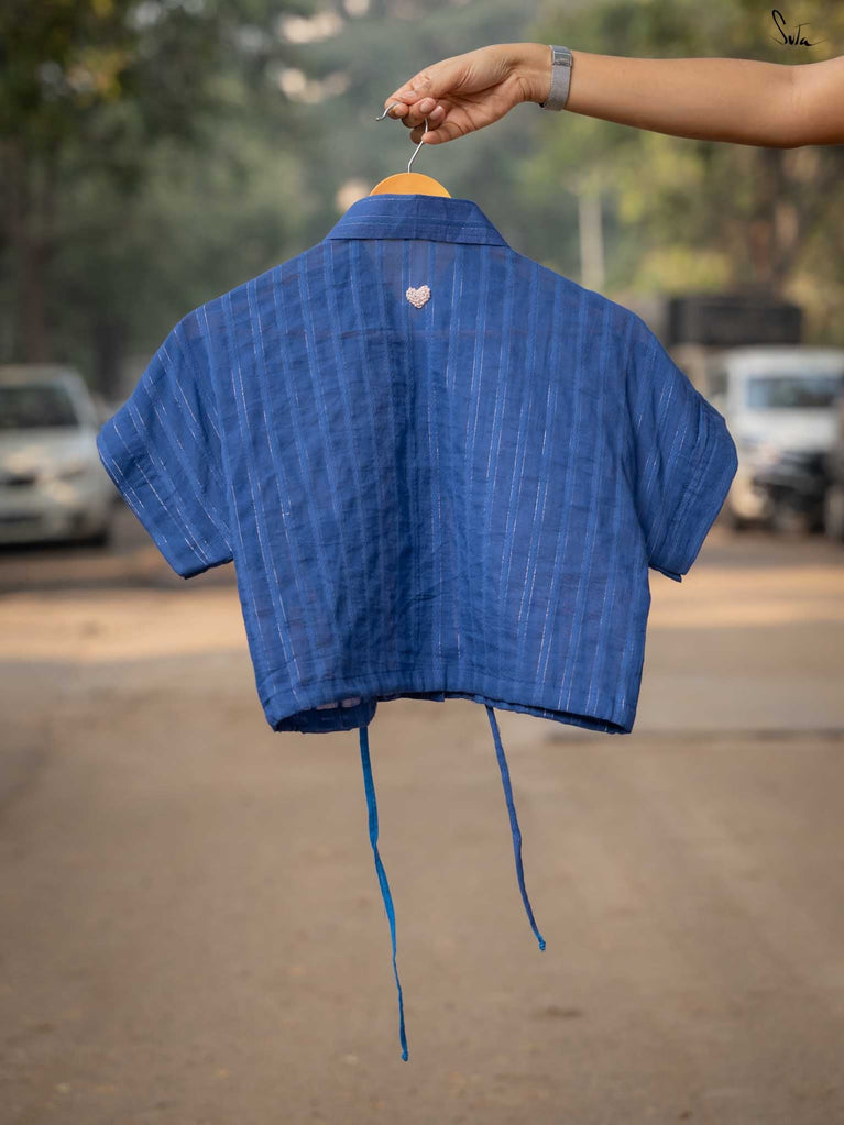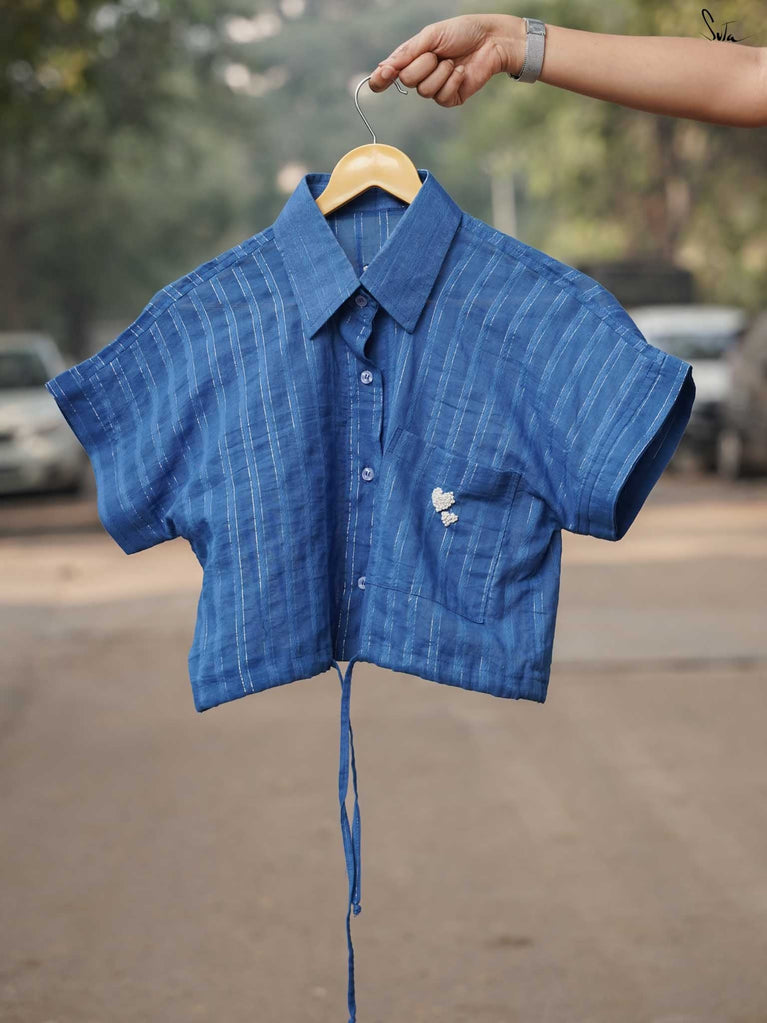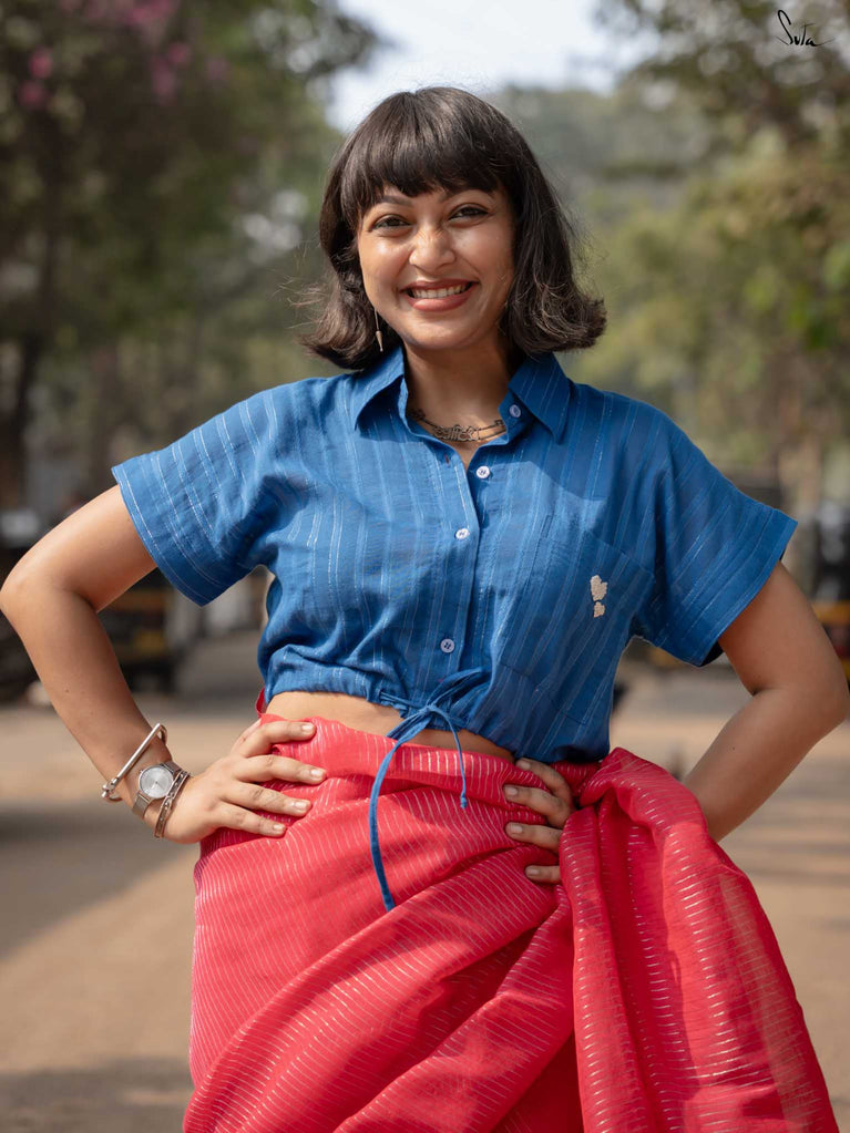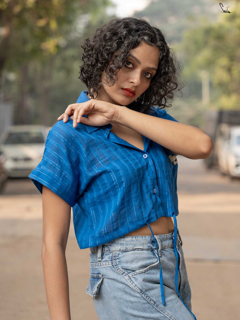 Ocean waves, bottled up in a crop top! The Bakul Sona in soothing blue cotton brings the calm of the sea wherever you go. Slip it on, let the rhythm of the waves take over, and breathe easy. The crop top comes with extra margin for your comfort fit.