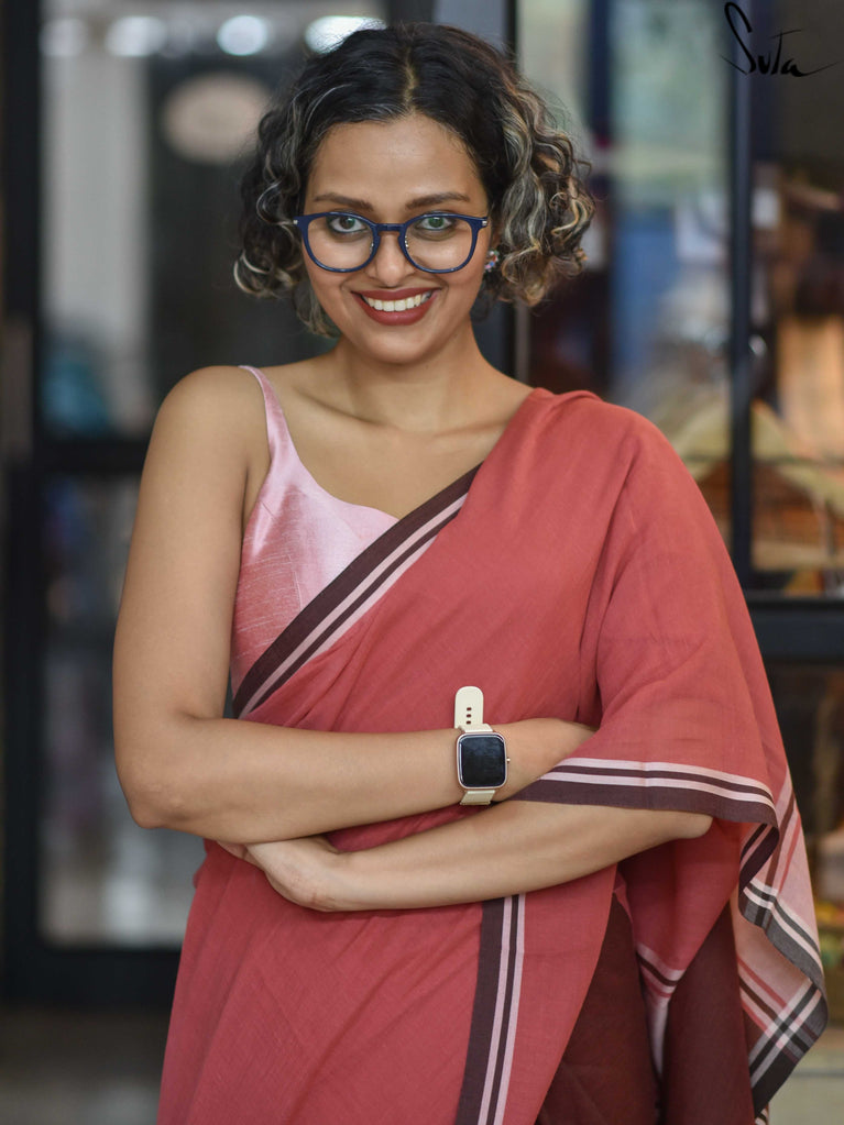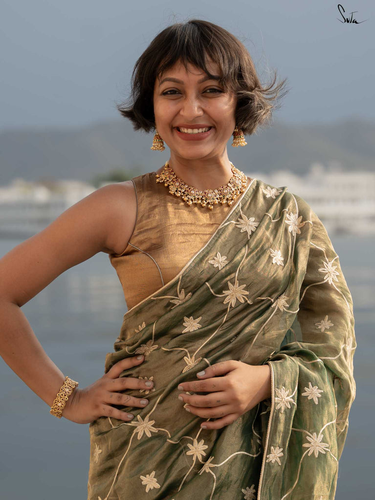 Saree: The model is wearing size S blouse and the saree is Raj Roopa.