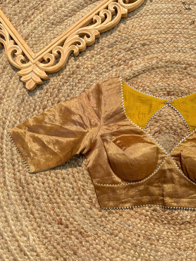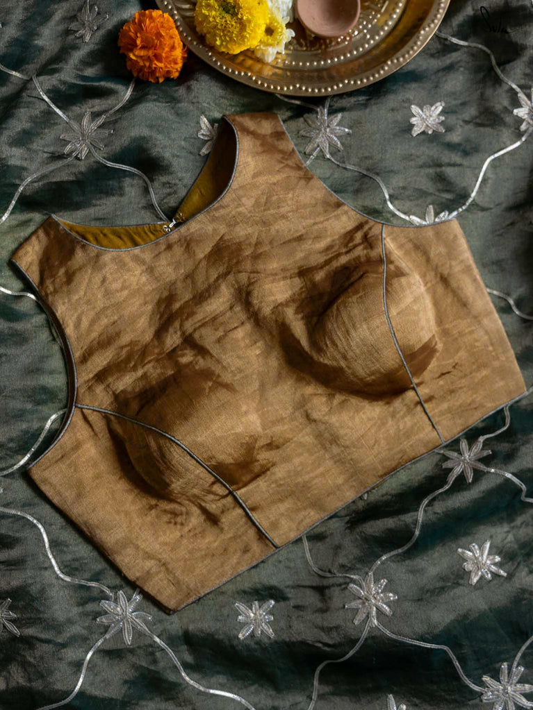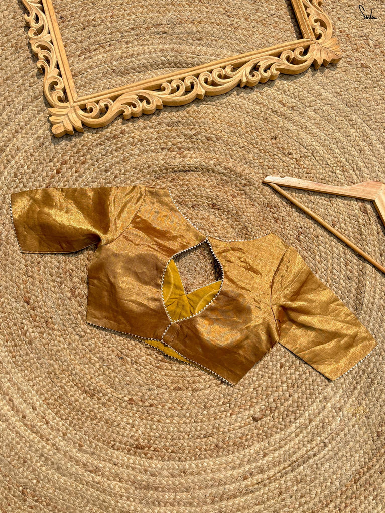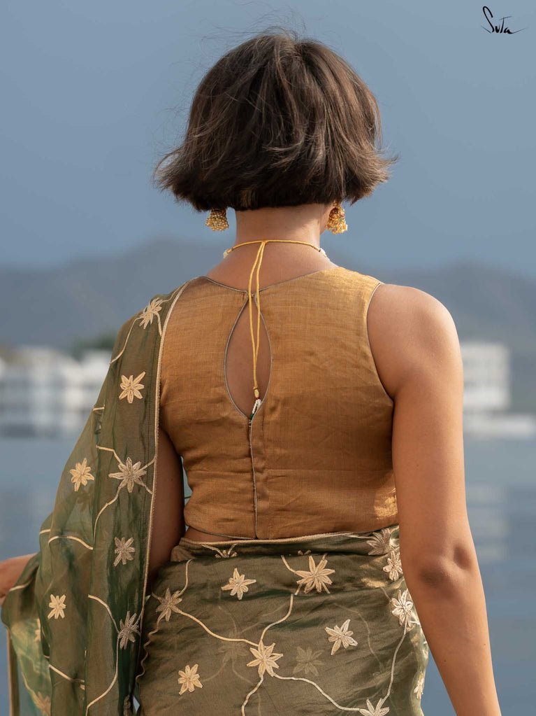 Every star needs the right canvas to shine, just like Amini needs you. This sleeveless gold blouse from Suta’s Taara collection is crafted from rich cotton silk chanderi blending excitement and modern style. The back hook-hole adds a contemporary edge, while the silver piping along the neck, armholes, and hem subtly complements your saree. Let your inner brilliance shine through with this Amini Blouse.