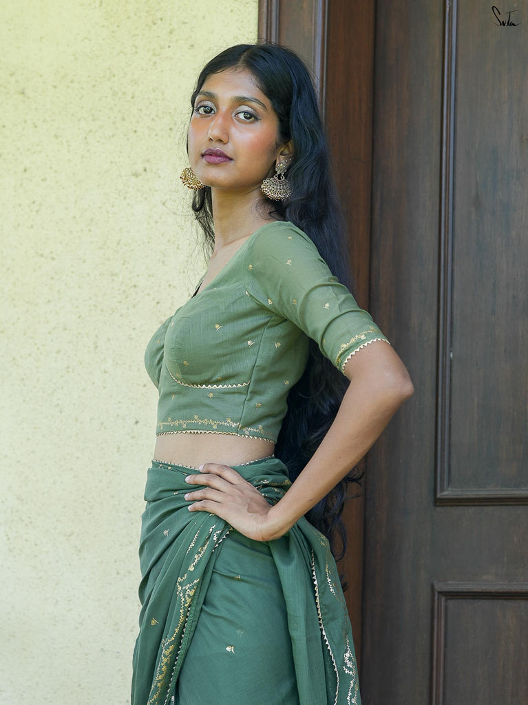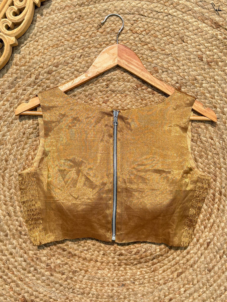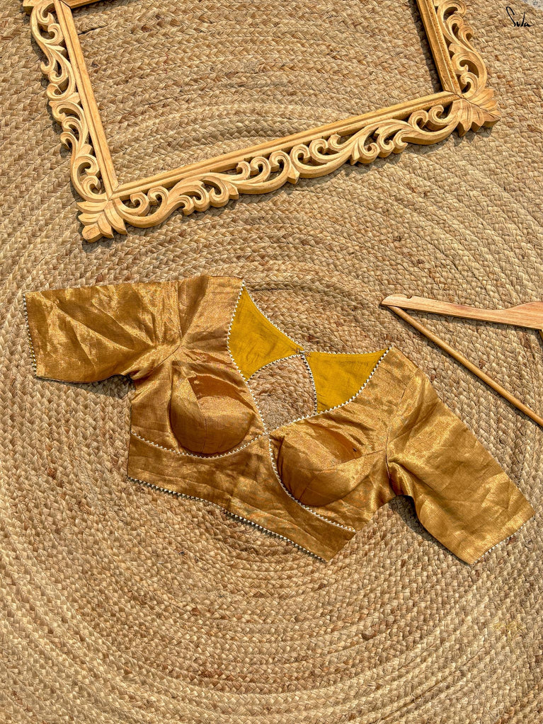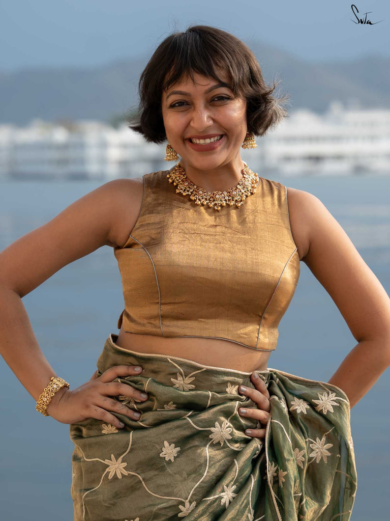 Every star needs the right canvas to shine, just like Amini needs you. This sleeveless gold blouse from Suta’s Taara collection is crafted from rich cotton silk chanderi blending excitement and modern style. The back hook-hole adds a contemporary edge, while the silver piping along the neck, armholes, and hem subtly complements your saree. Let your inner brilliance shine through with this Amini Blouse.