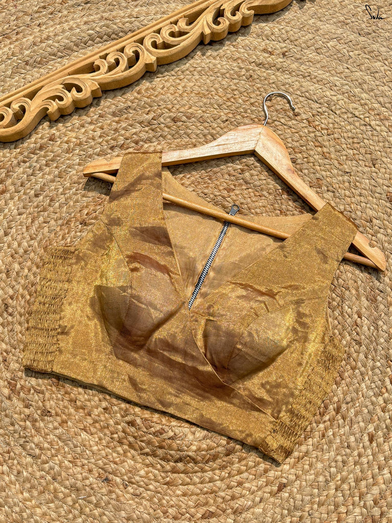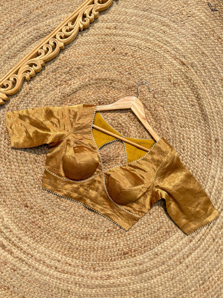 Reflect the beauty of the evening sky with Aasmani Chhavi, a soothing blue gold blouse from Suta’s Taara collection, crafted from viscose tissue. This blouse features a flattering sweetheart neckline and elbow-length sleeves adding a soft shimmer to your look. The gold lace detailing enhances the blouse’s elegance, merging comfort with a touch of twilight for those everyday moments.