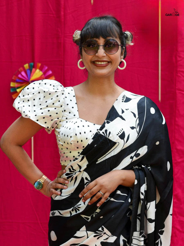 Su, the model is wearing size S blouse and the saree is Flying to the Moon Polka.