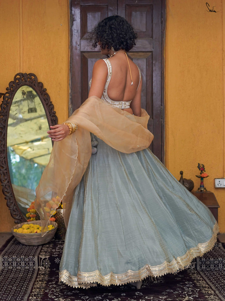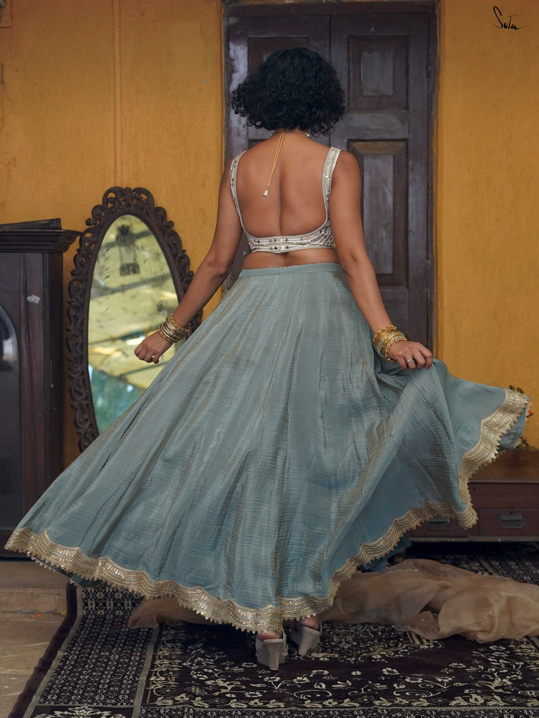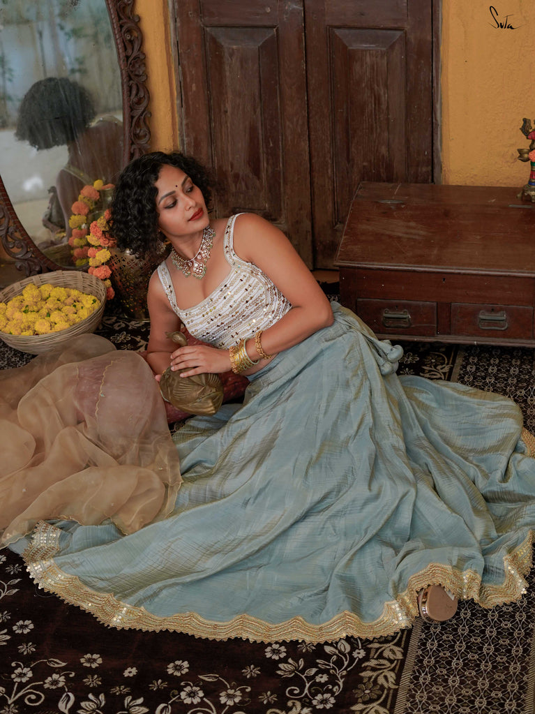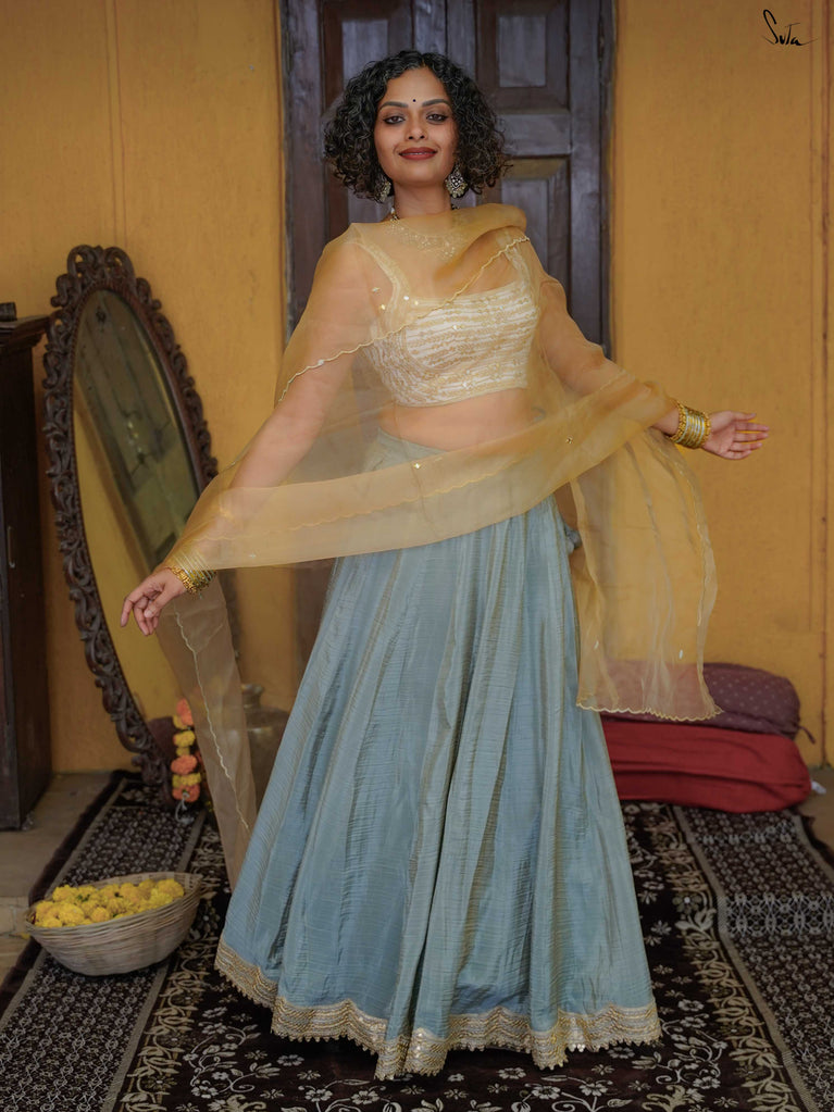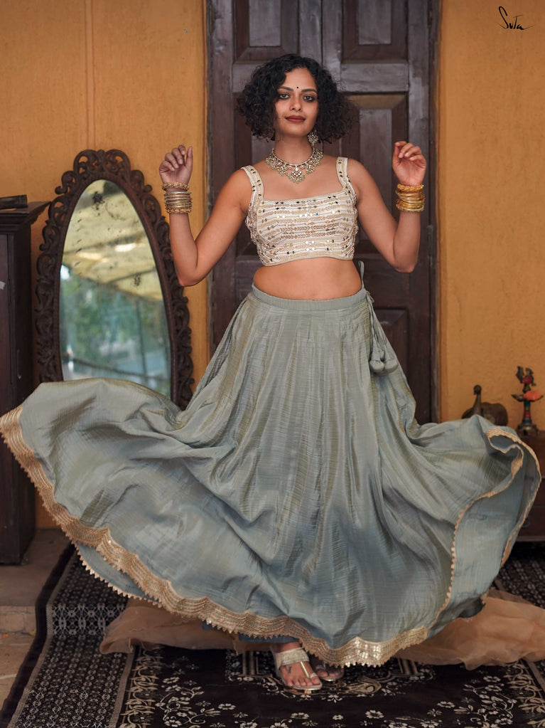 Mint green, light as a laugh shared mid-function. This crushed viscose lehenga is made for days that begin with “just getting ready” and end on the dance floor. The fabric has a soft festive sheen, fluid movement, and a roomy fall that lets you breathe, twirl, and sit cross-legged without a second thought. Finished with delicate scalloped gold lace and playful tassels, it brings just enough sparkle, never too much.Wear it with a blouse for the full festive look, drape it with a saree pallu, or style it as a skirt with your favourite crop top. Because when it’s bhai ki shaadi, comfort should still come first.