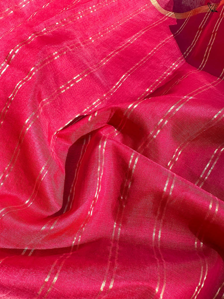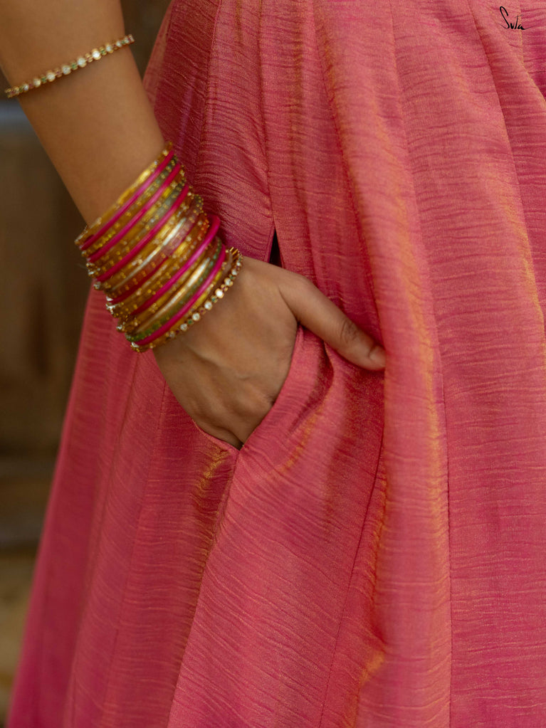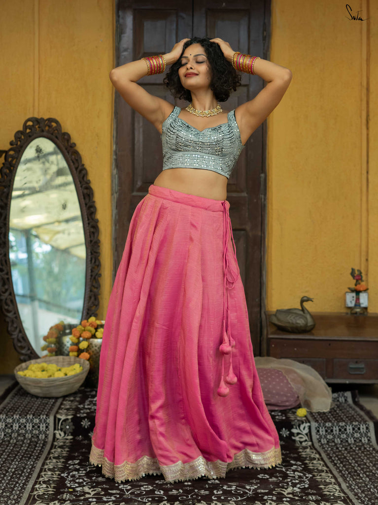 A lively mix of pink and red - bold, joyful, and made for celebrating your people. This crushed viscose lehenga is designed for wedding days that are all heart and movement. Light on the body with a soft festive sheen, it flows easily from laughter to dancing without missing a beat. Scalloped gold lace adds a gentle shimmer, while tassels keep things playful and fun. Style it with a blouse, drape it with a saree, or wear it as a skirt with your favourite crop top. Because when it’s yaar ki shaadi, you dress up, show up, and celebrate hard.