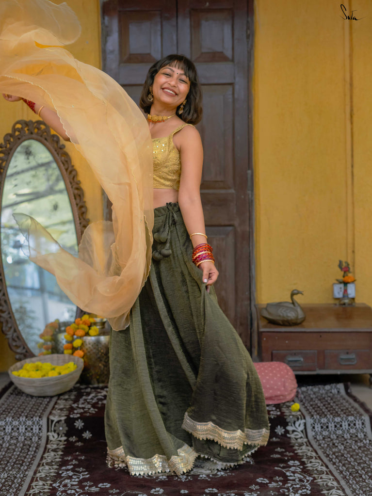 A rich green that feels festive without trying too hard. This crushed viscose lehenga is made for wedding days filled with movement, walking between functions, dancing when your song comes on, sitting wherever there’s space. Light, breathable, and fluid, it has a soft festive sheen that catches the light just right. Finished with scalloped gold lace and playful tassels, it brings in celebration without the weight. Style it with a blouse, drape it with a saree, or wear it as a skirt with your favourite crop top.Because when it’s chacha ki shaadi, comfort and fun go hand in hand.