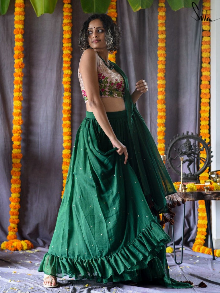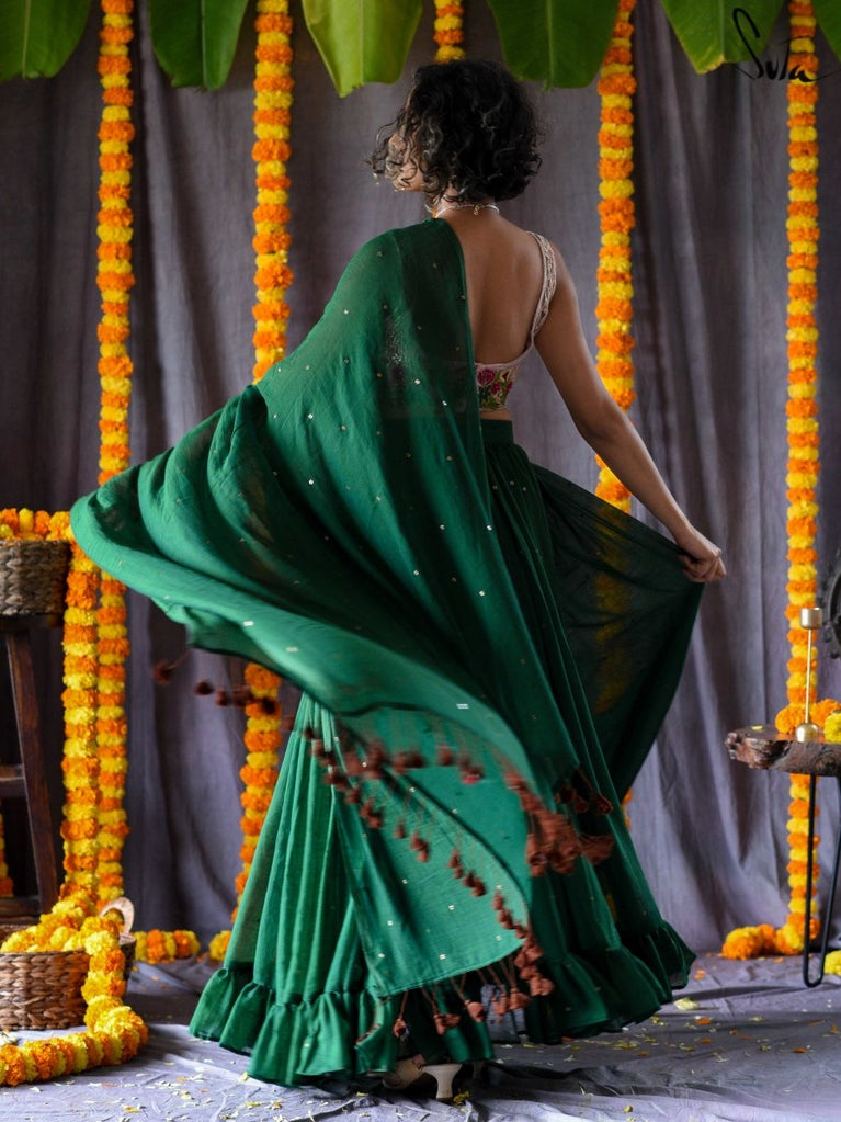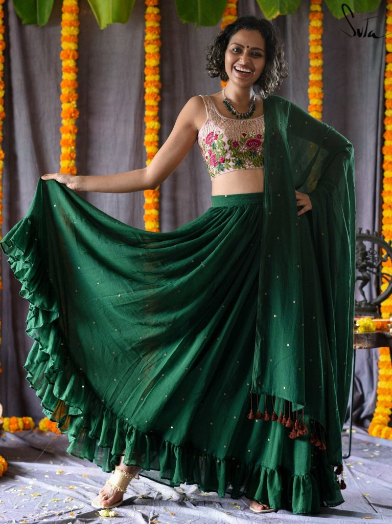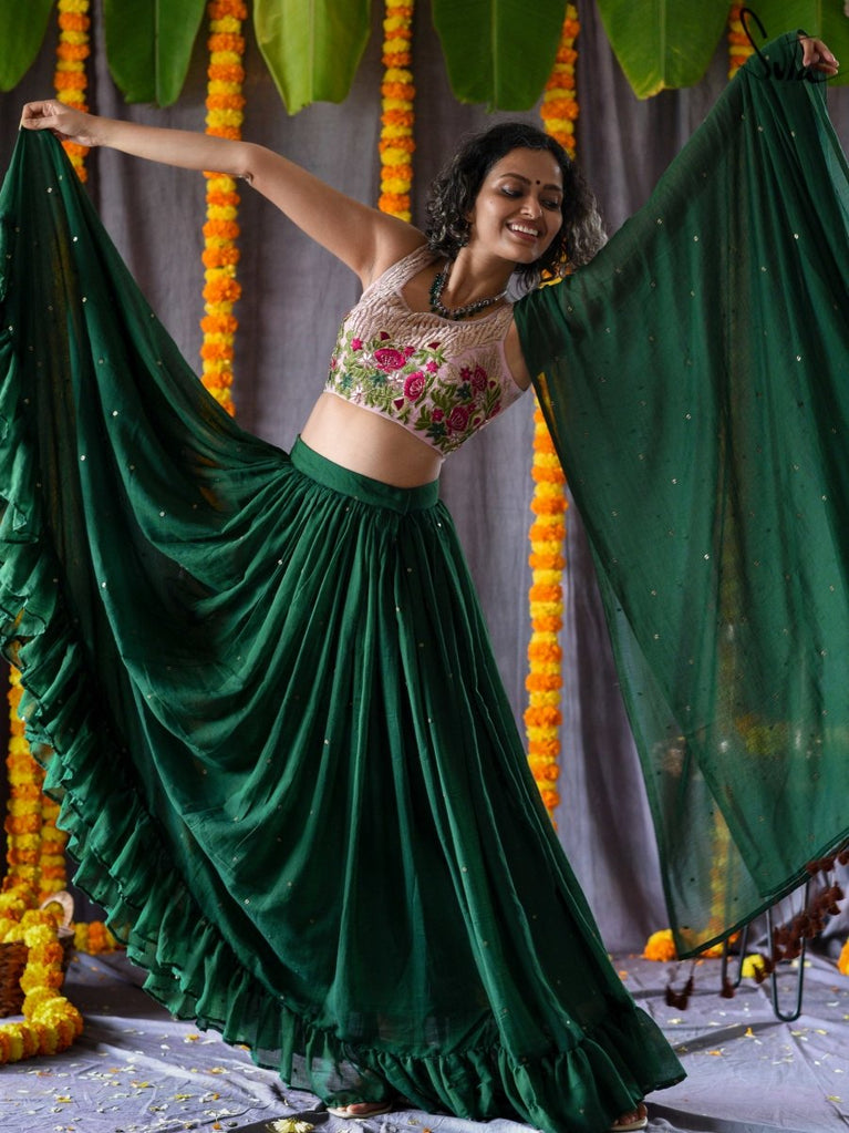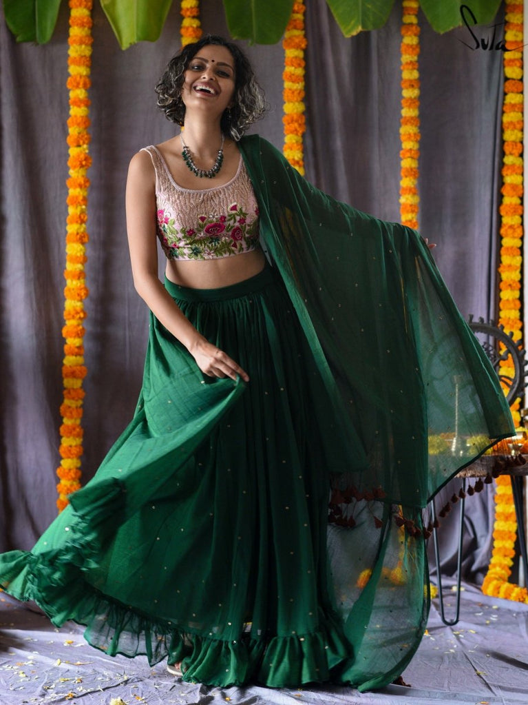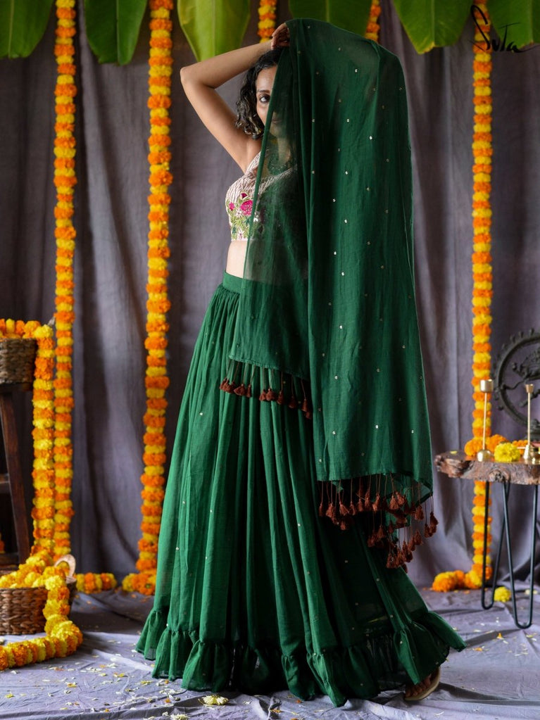 This festive season, don our striking green velvet lehenga set that comes with an organza dupatta, as you caress hopeful beginnings.