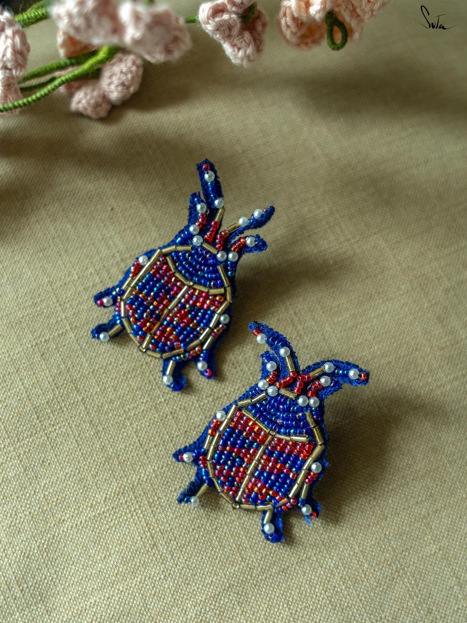 Delve deep into the aura of funky styling with the Affluence earrings, a pair of handcrafted pieces made up of blue and pink shades. These insect-shaped earrings contain zardozi threadwork all over the body and are your perfect companion for every outing due to their unique appearance.