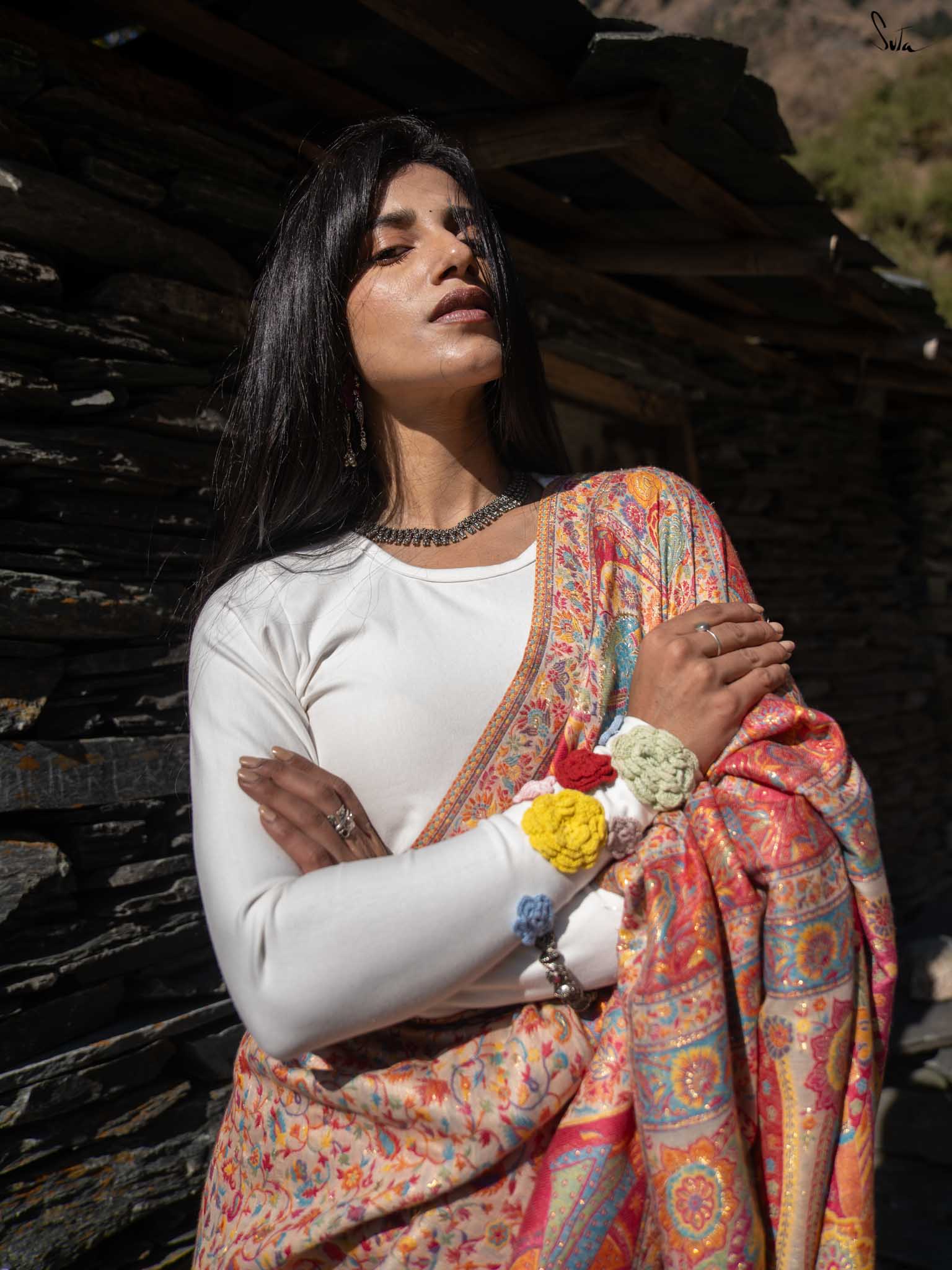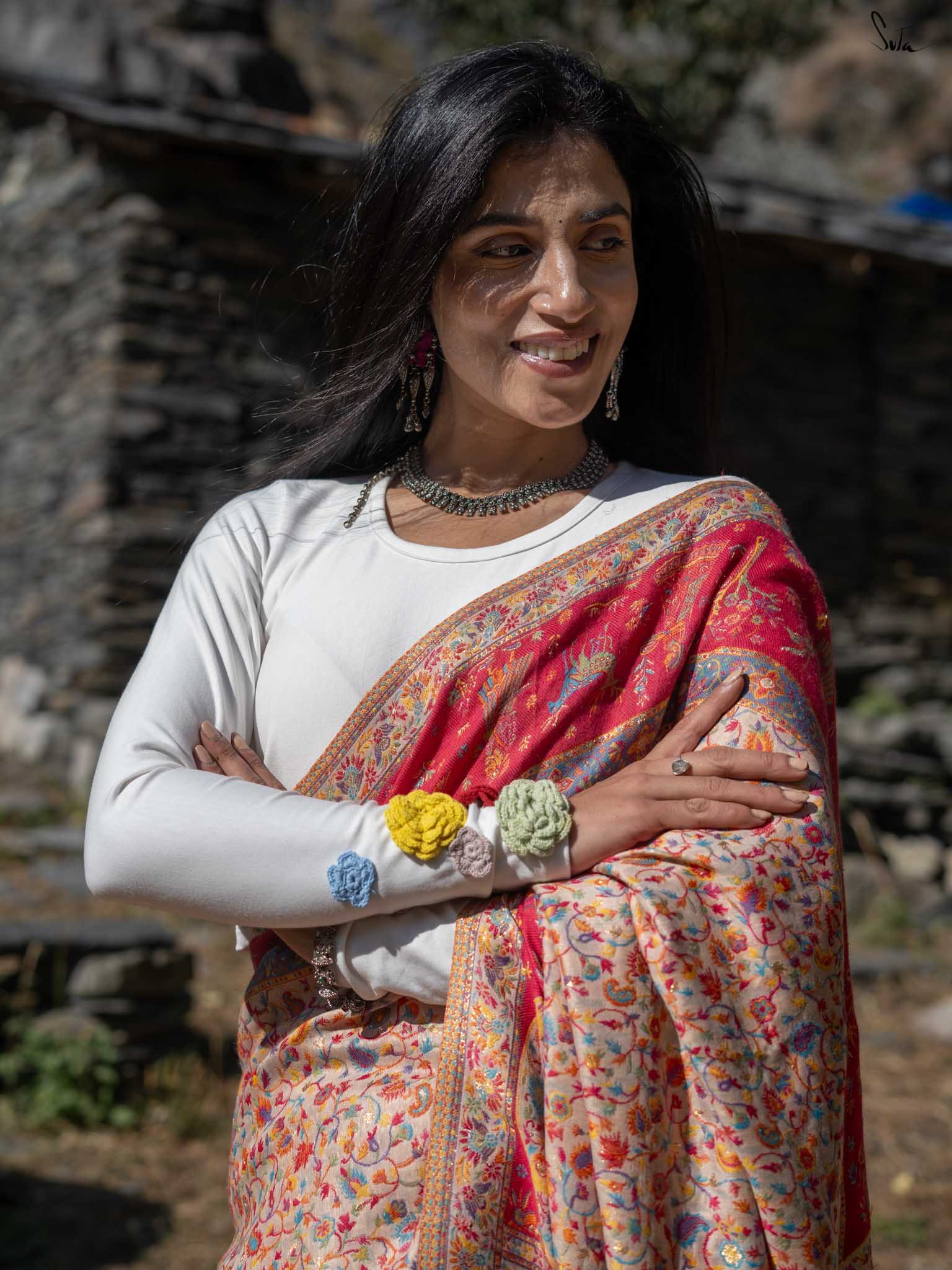 The clean round neckline and full sleeves give it a timeless appeal, while subtle crochet flower embellishments on the sleeves add a whisper of handcrafted charm. Pure, versatile, and endlessly wearable, it’s the blouse you’ll reach for again and again.
