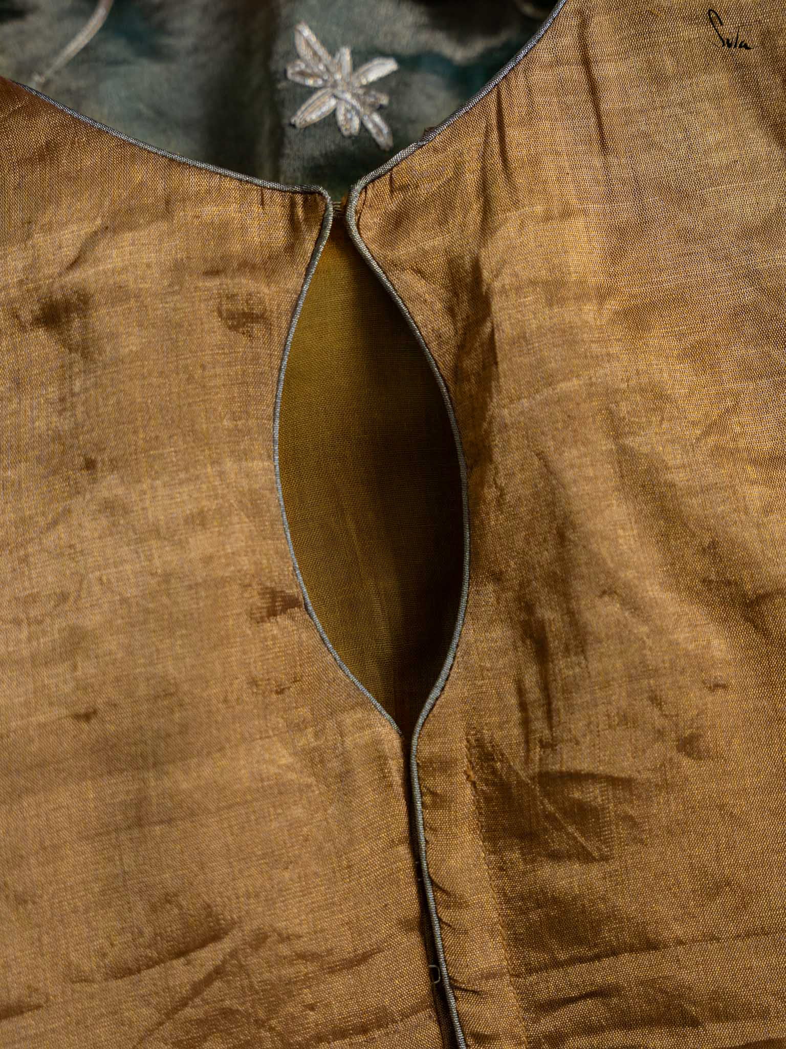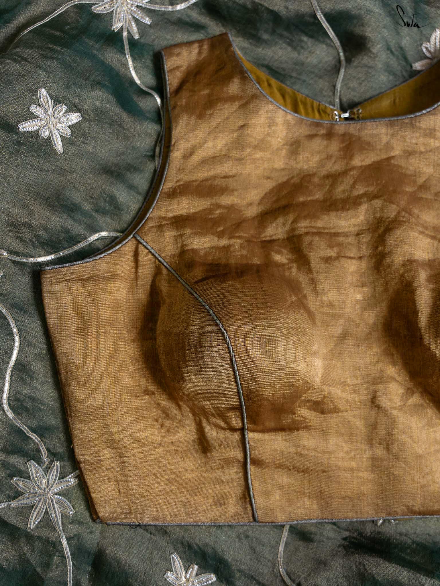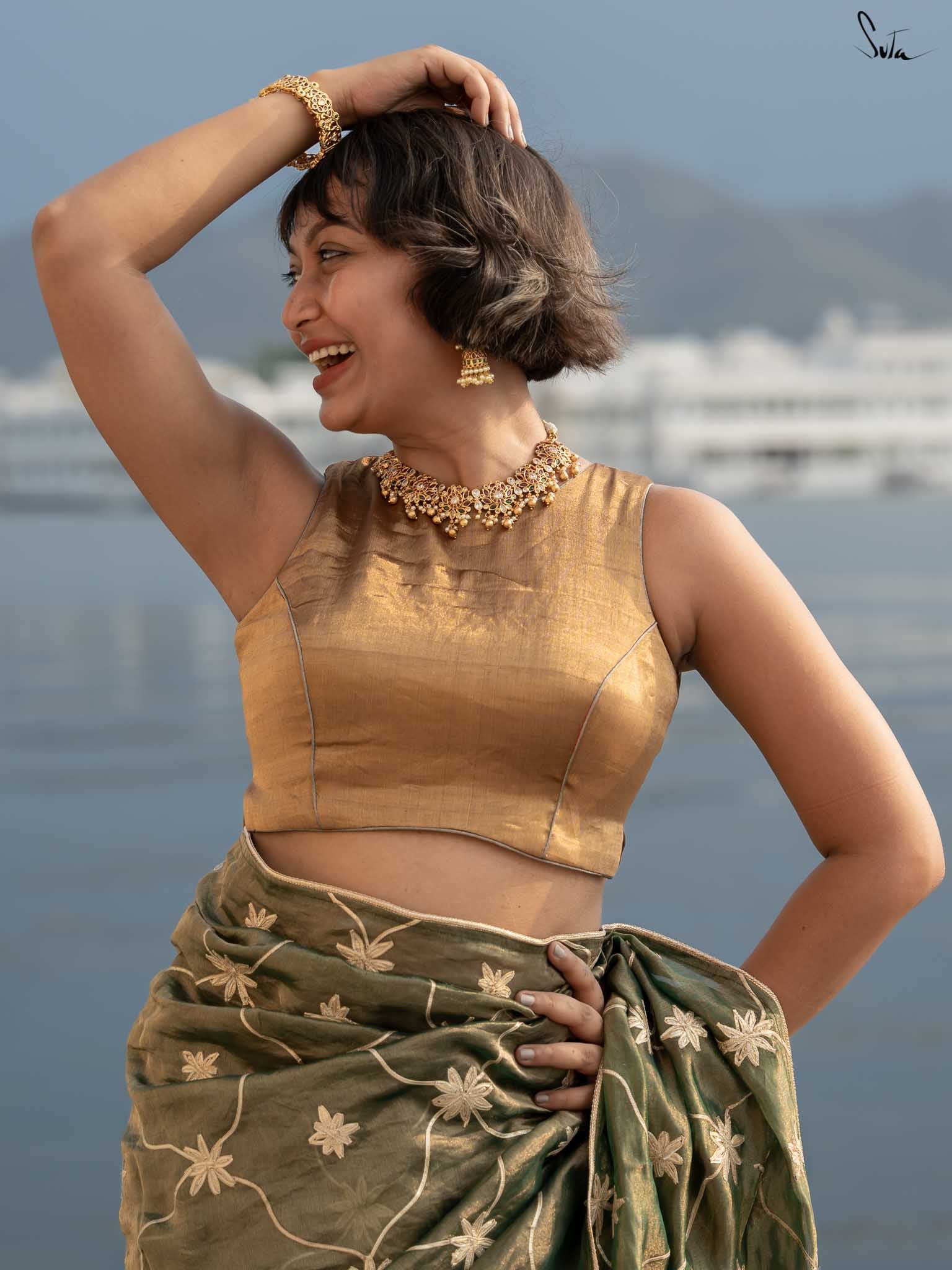 Every star needs the right canvas to shine, just like Amini needs you. This sleeveless gold blouse from Suta’s Taara collection is crafted from rich cotton silk chanderi blending excitement and modern style. The back hook-hole adds a contemporary edge, while the silver piping along the neck, armholes, and hem subtly complements your saree. Let your inner brilliance shine through with this Amini Blouse.