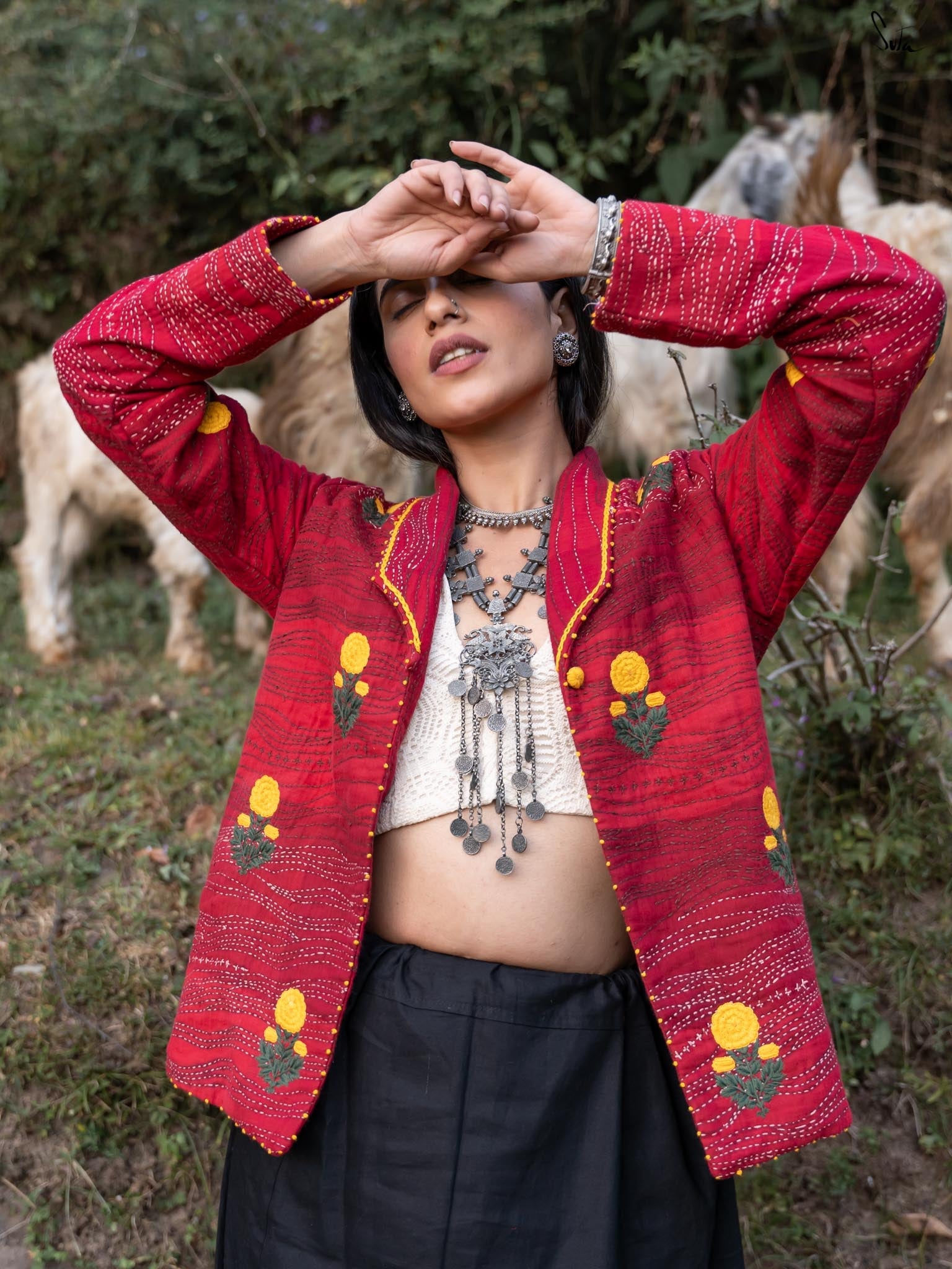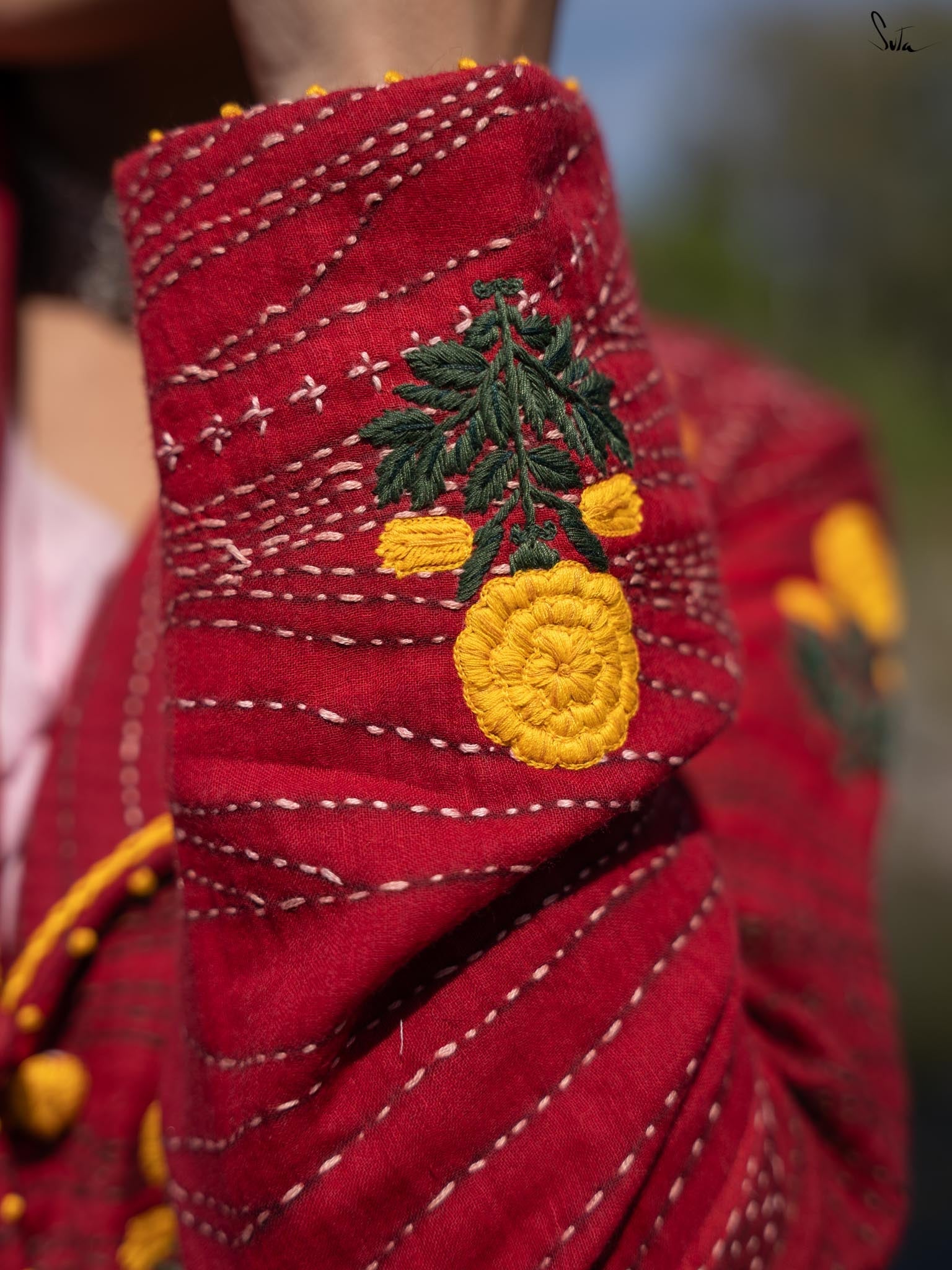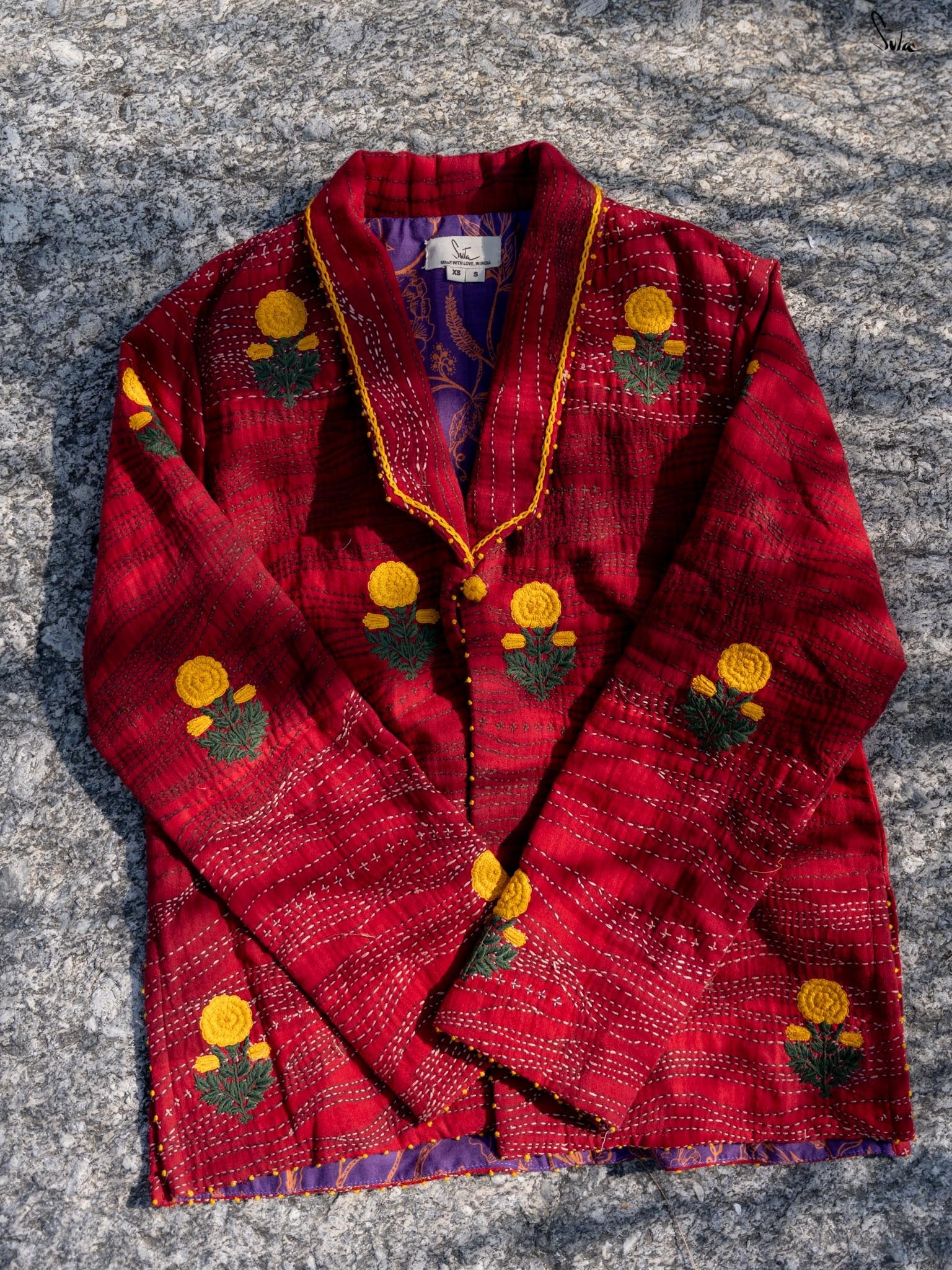 Anisa, like every jacket in the Bageecha collection, is crafted with an incredible amount of time, effort, and heart. The jacket is a stunning mix of red hues, brought to life through careful quilting and traditional Katha running stitches. The vibrant yellow marigold flowers embroidered on the jacket embody the artisans' love for nature and their craft, each stitch meticulously placed. From the careful French knots adorning the cuffs and hem to the yellow chain stitch that traces the collar, every detail tells a story of dedication and attention. The artisans’ hands move with purpose, creating a masterpiece that is a labor of love from start to finish. Each piece passes through the hands of many skilled craftsmen, who imbue it with their love and stories, making it not just a jacket, but a symbol of the beauty and care that goes into every handcrafted garment.