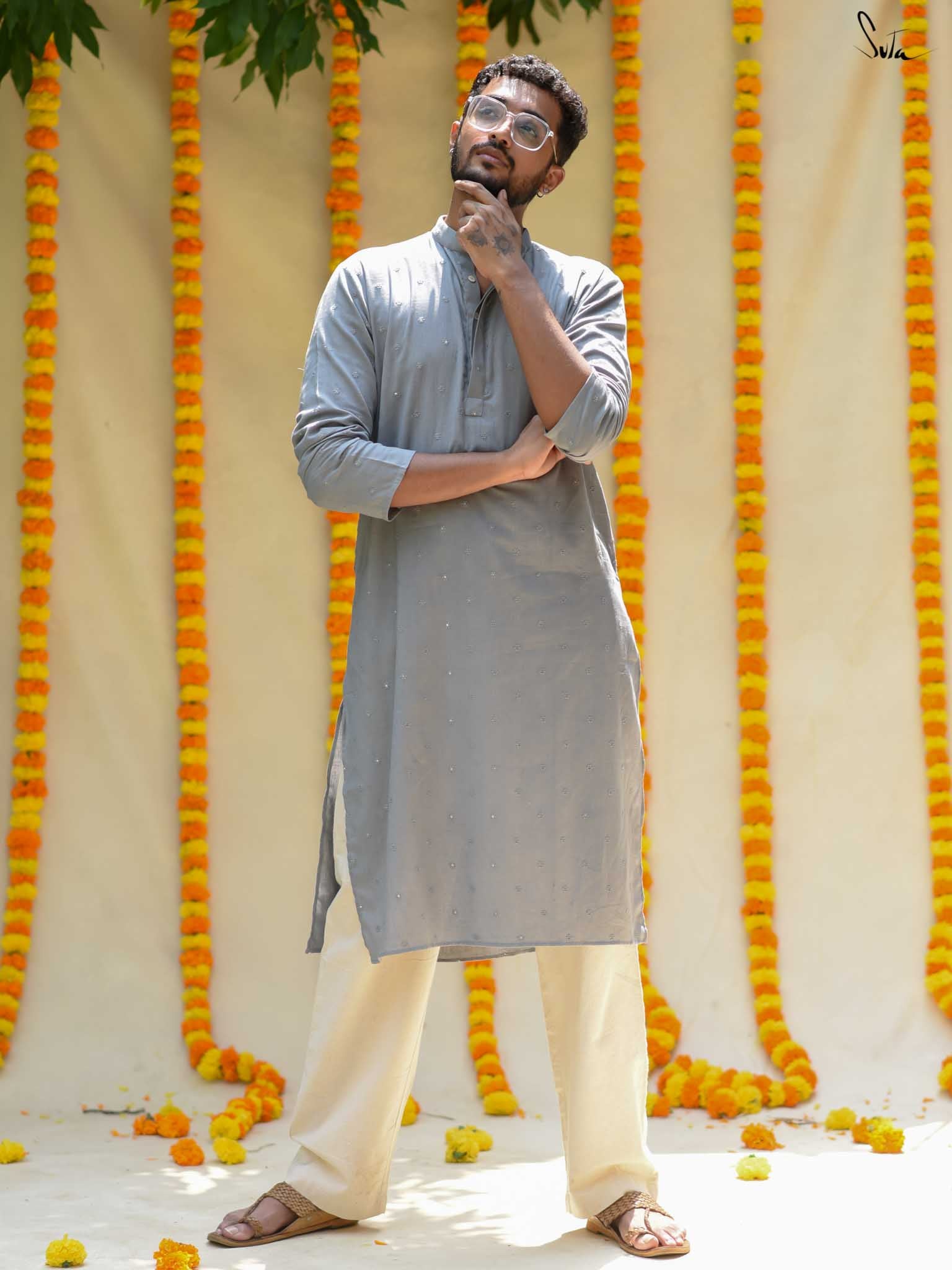 The Ash Ki Raat Kurta captures the allure of evening celebrations. In a graceful shade of grey, this cotton kurta boasts delicate tone-on-tone flower butta and shimmering sequins. Its understated elegance is ideal for festive gatherings, allowing you to celebrate the warmth of togetherness in effortless style.