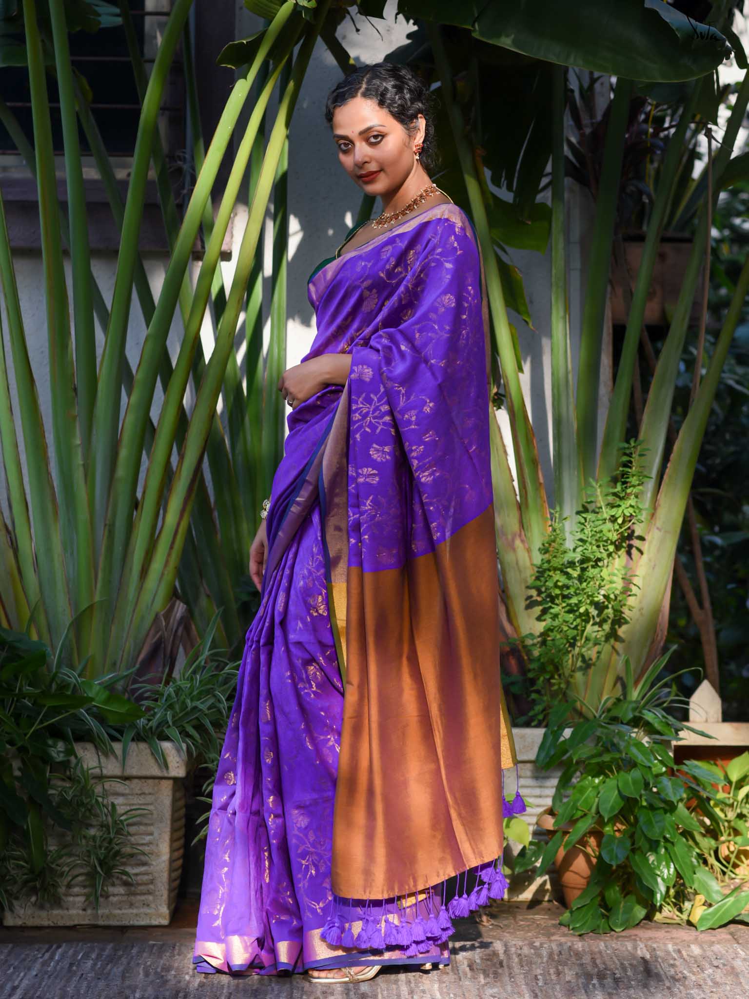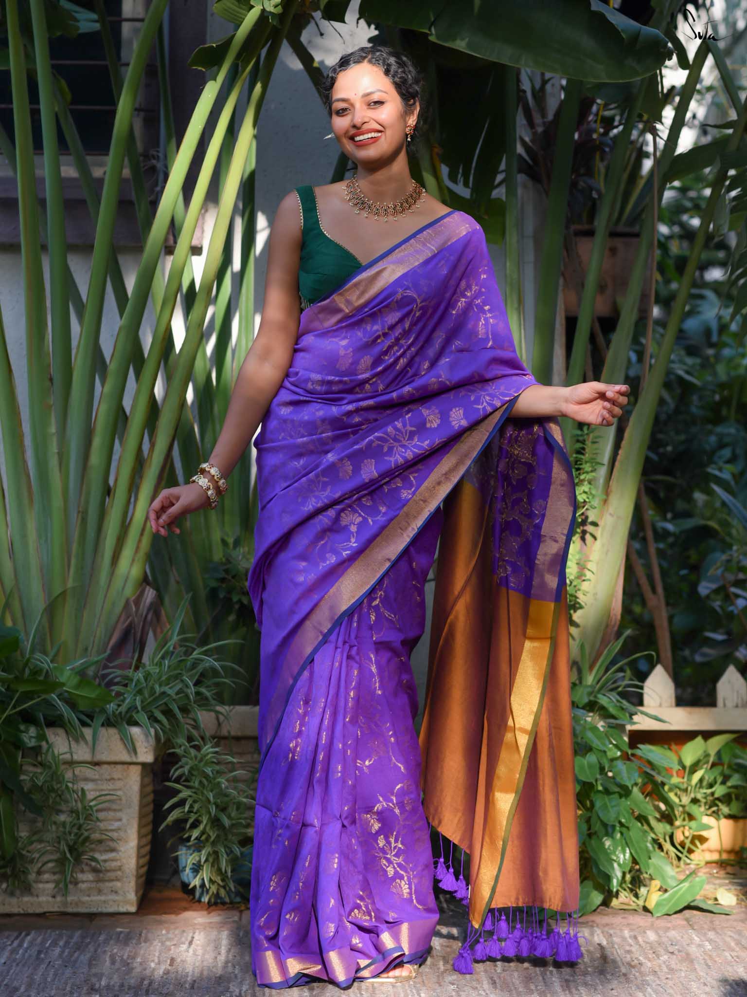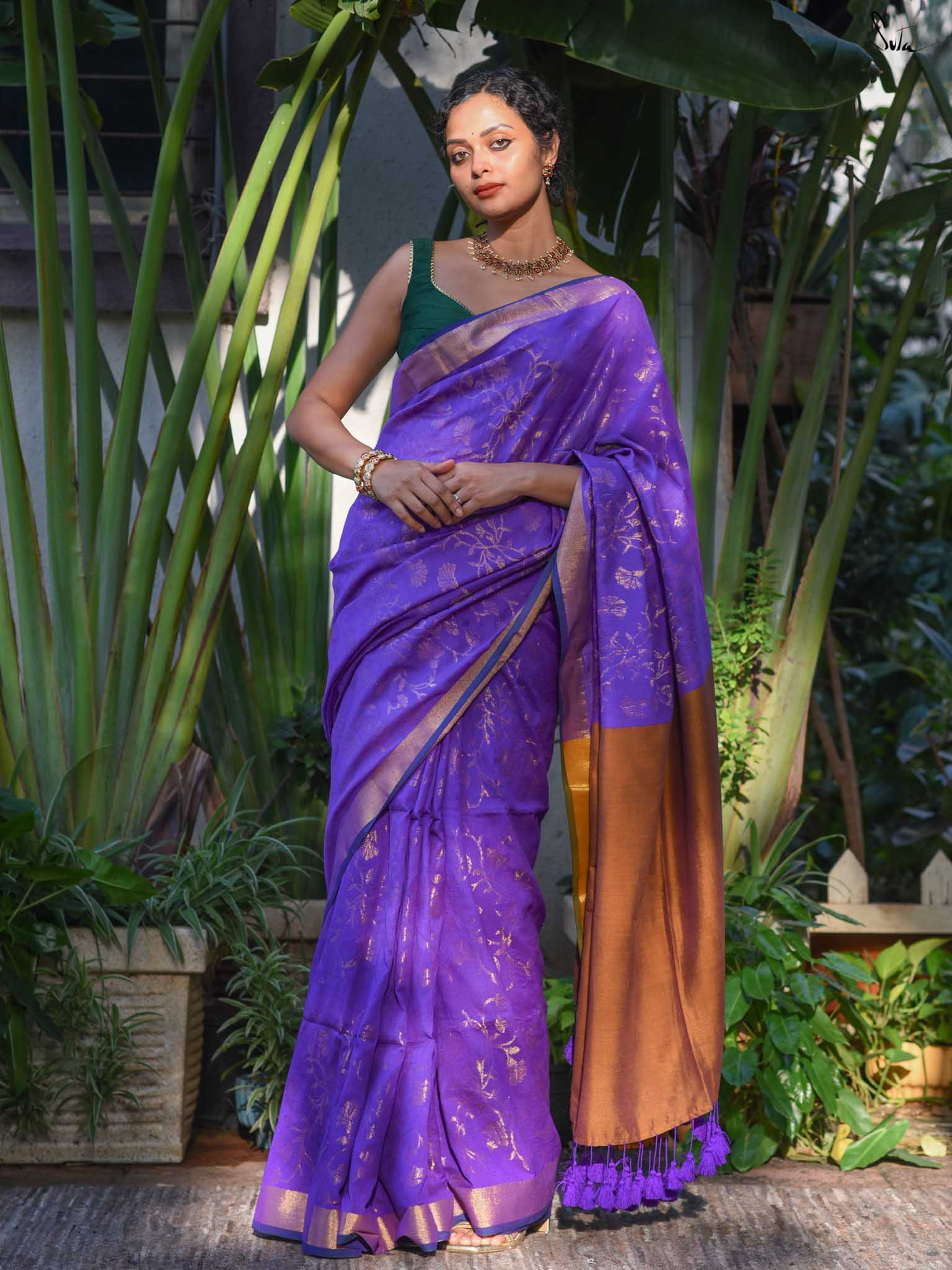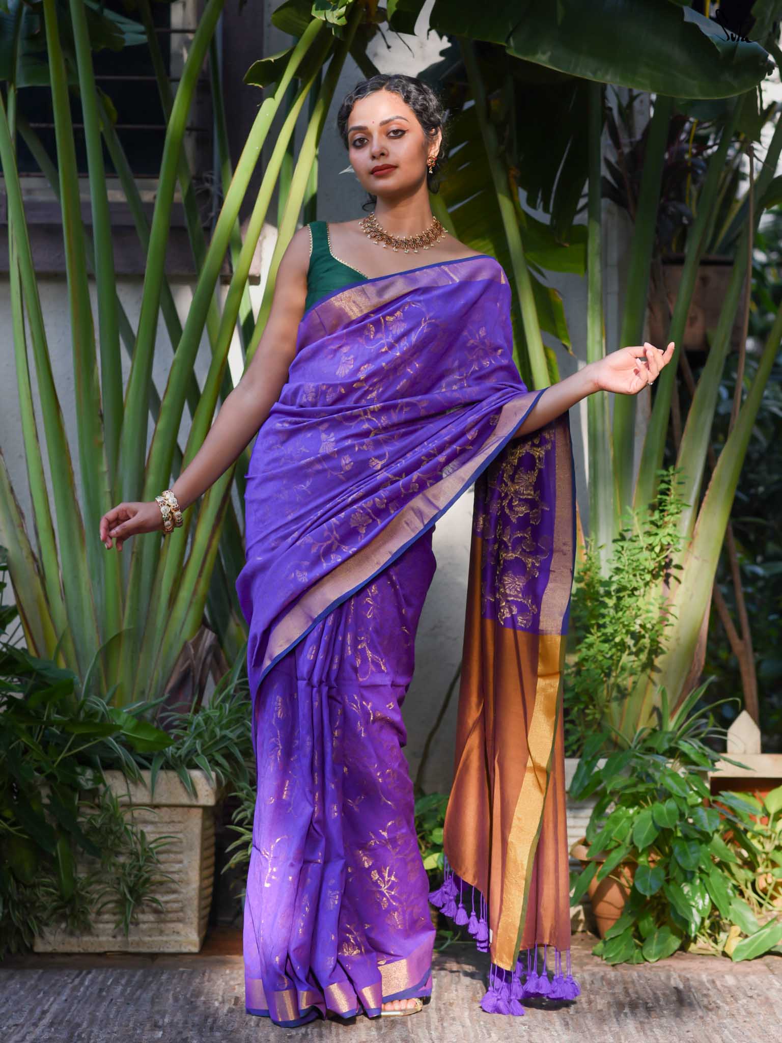 True to her name, Bondona wove this cotton-acrylic saree with prayerful attention to every detail. The rich purple body shimmers with allover gold zari floral motifs, finished with a solid gold pallu and matching tassels.