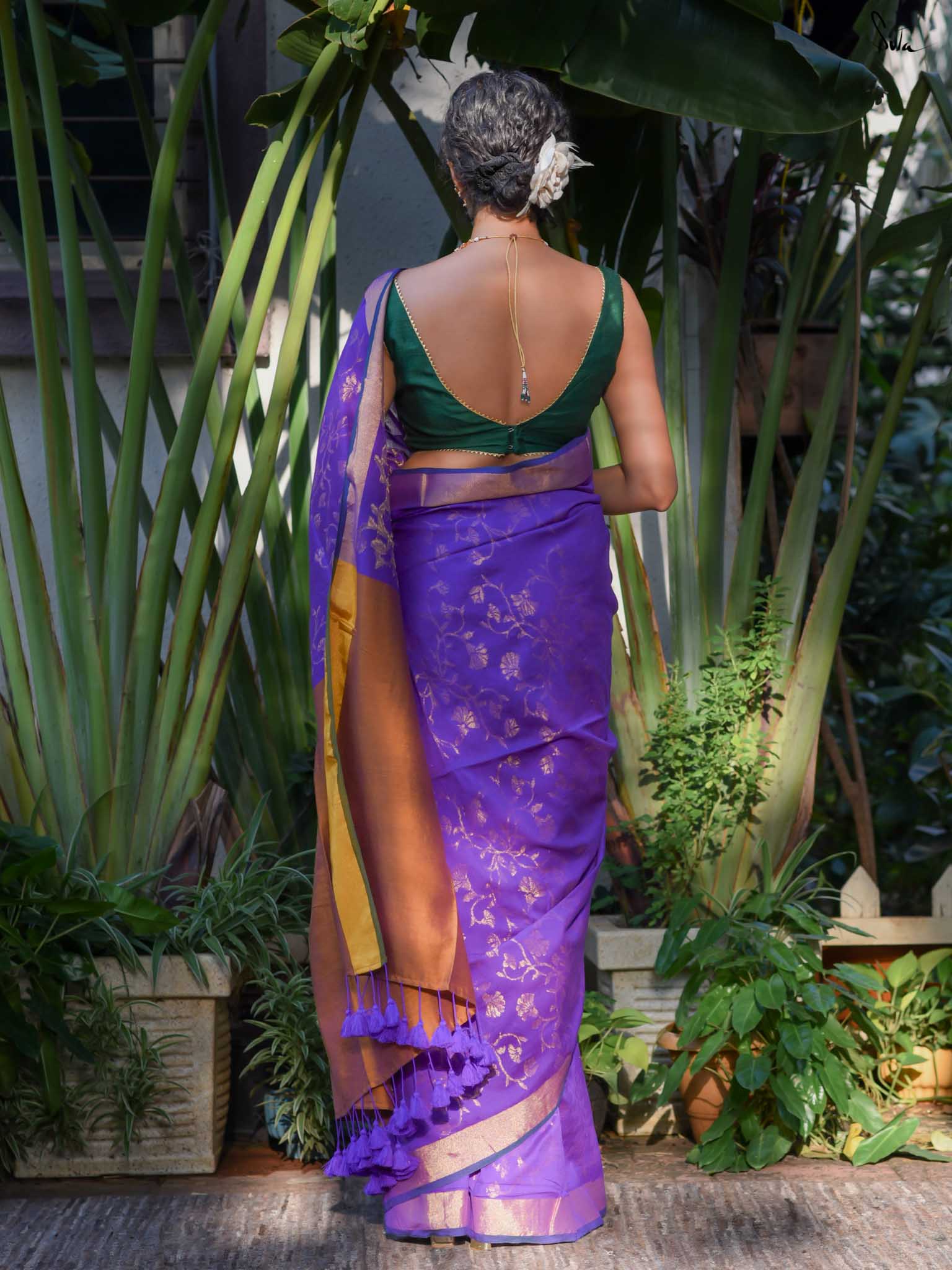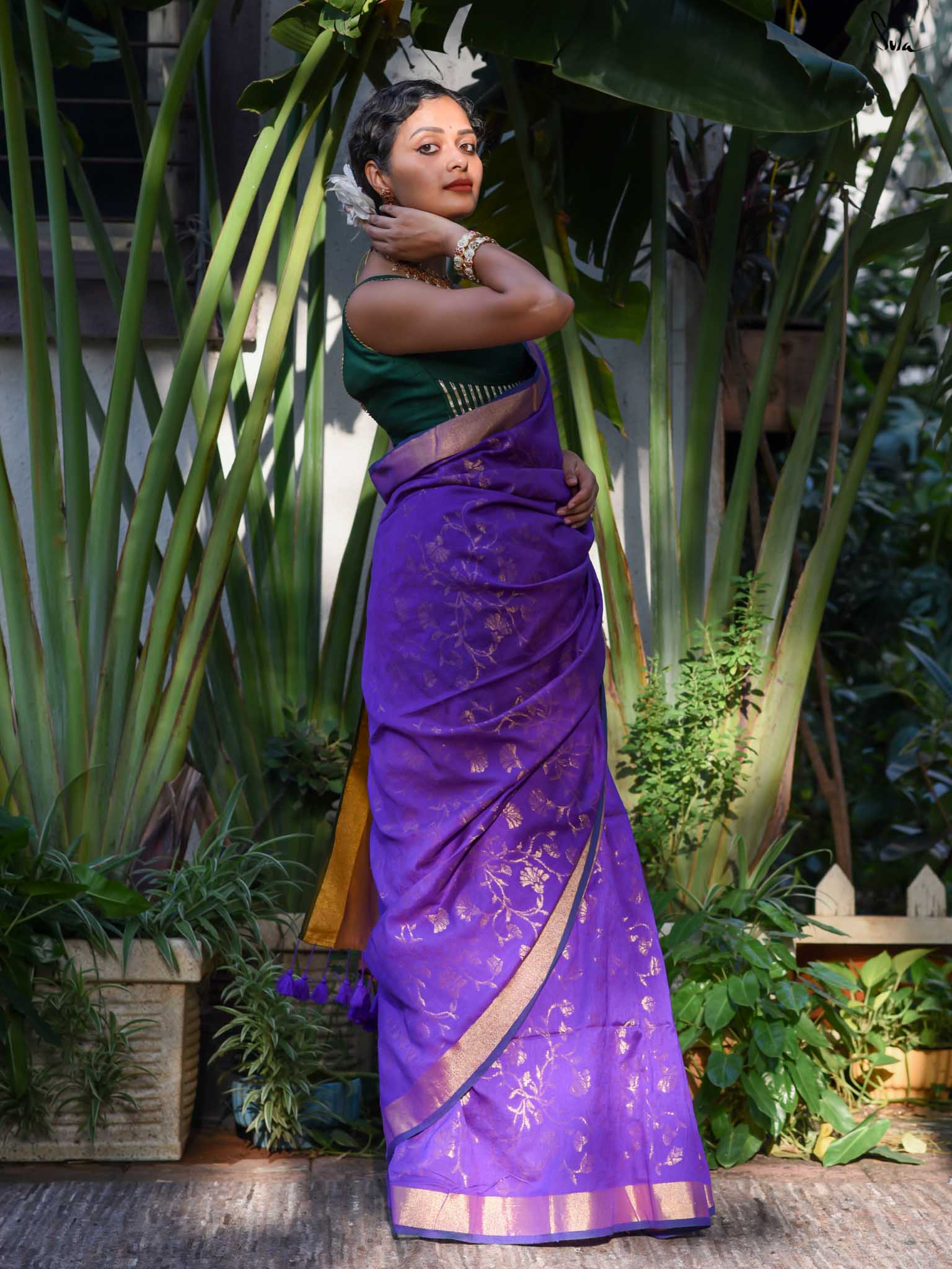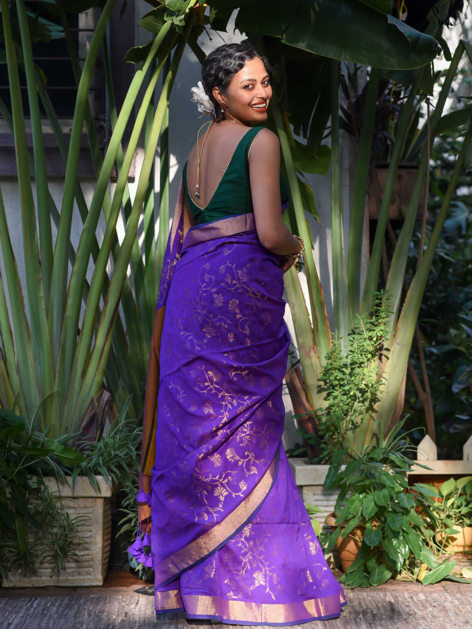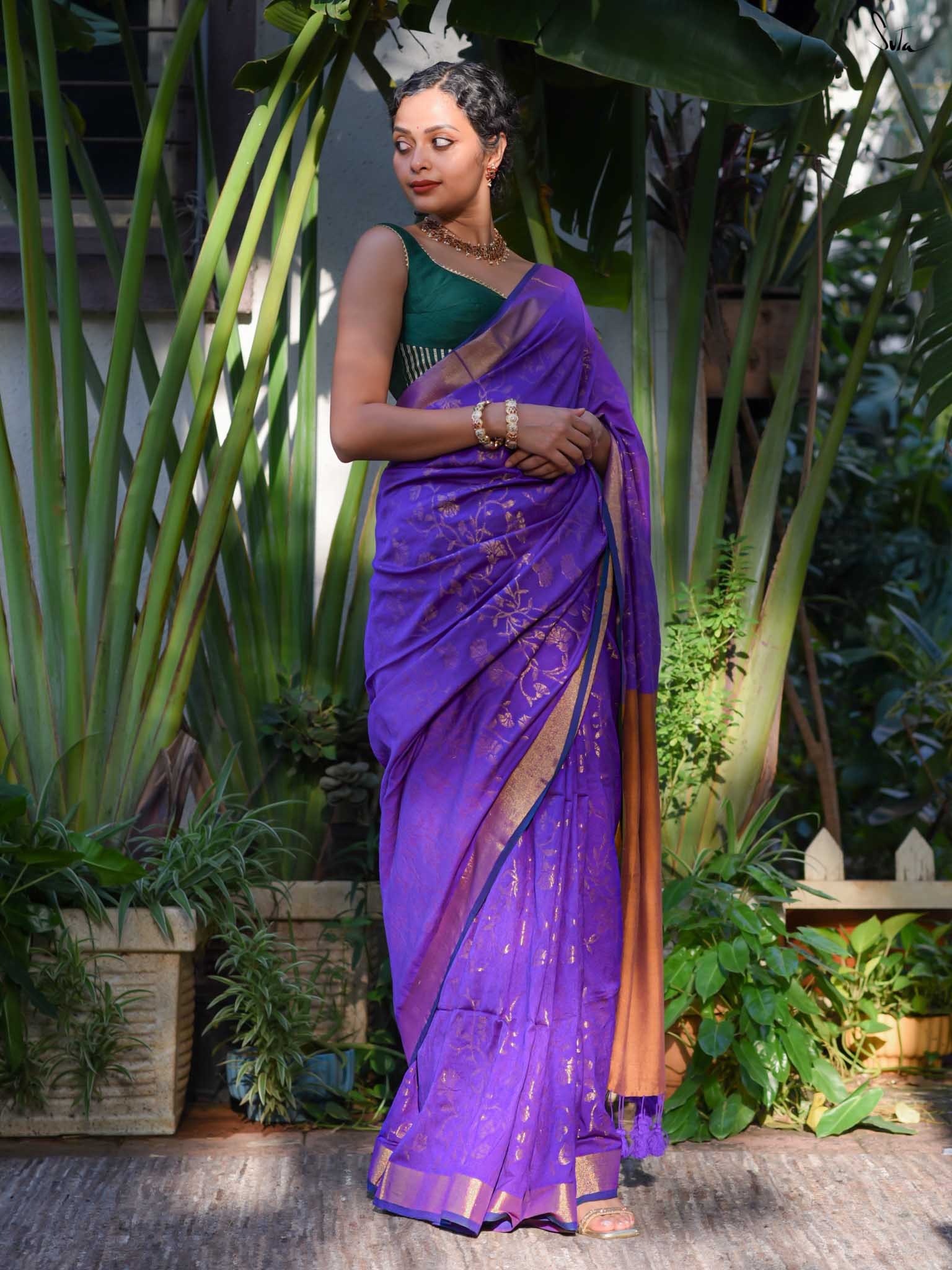 True to her name, Bondona wove this cotton-acrylic saree with prayerful attention to every detail. The rich purple body shimmers with allover gold zari floral motifs, finished with a solid gold pallu and matching tassels.