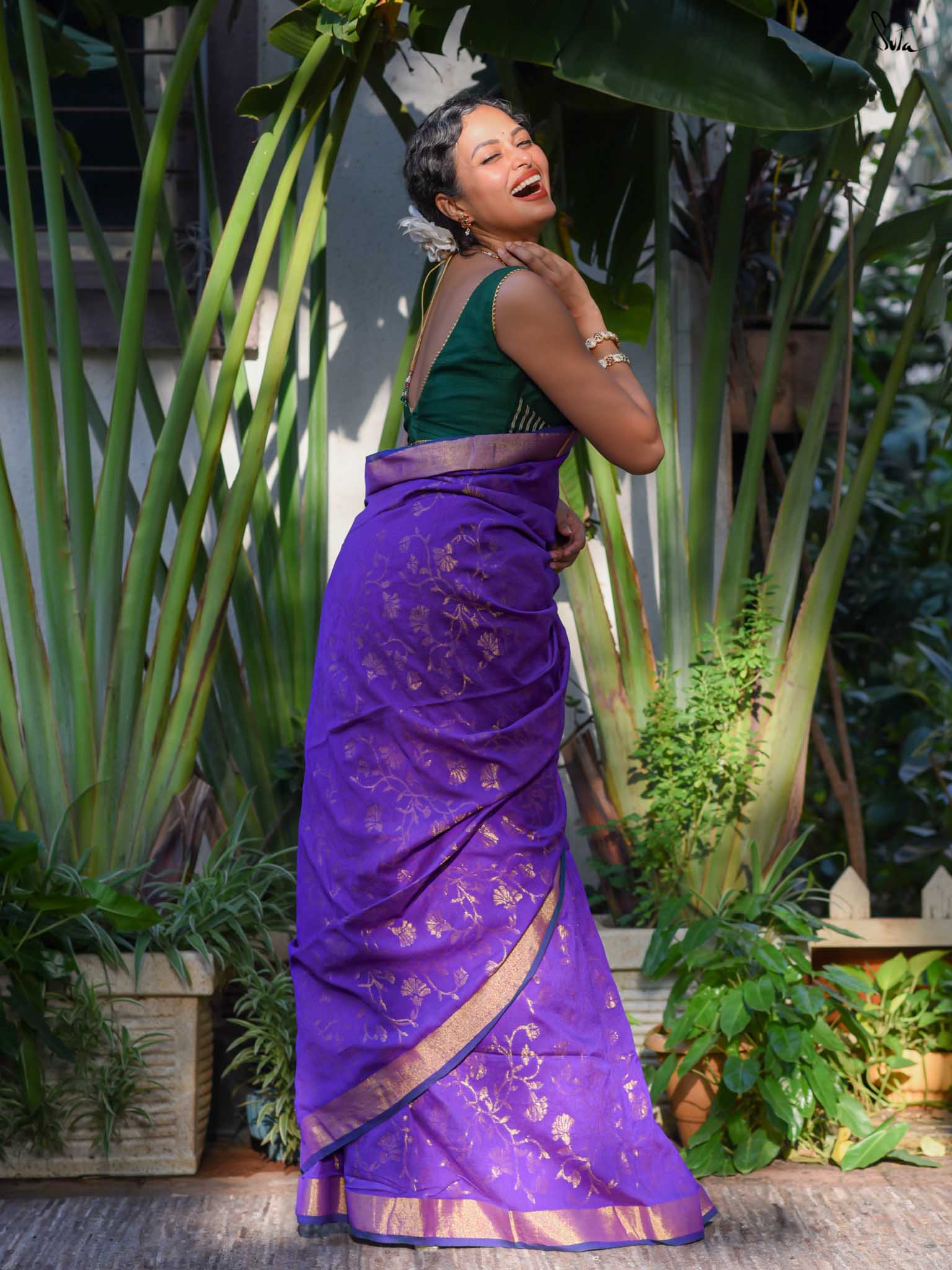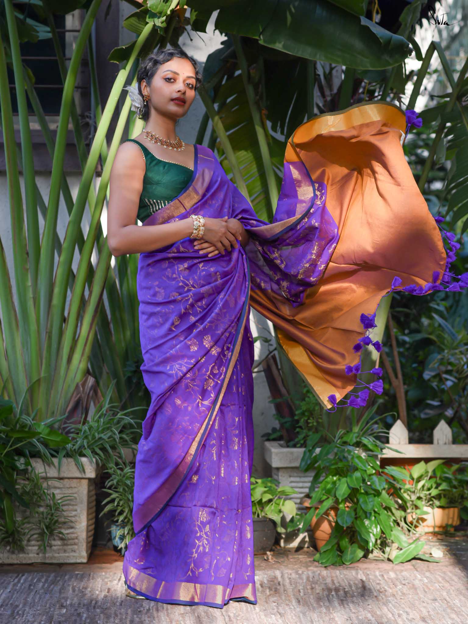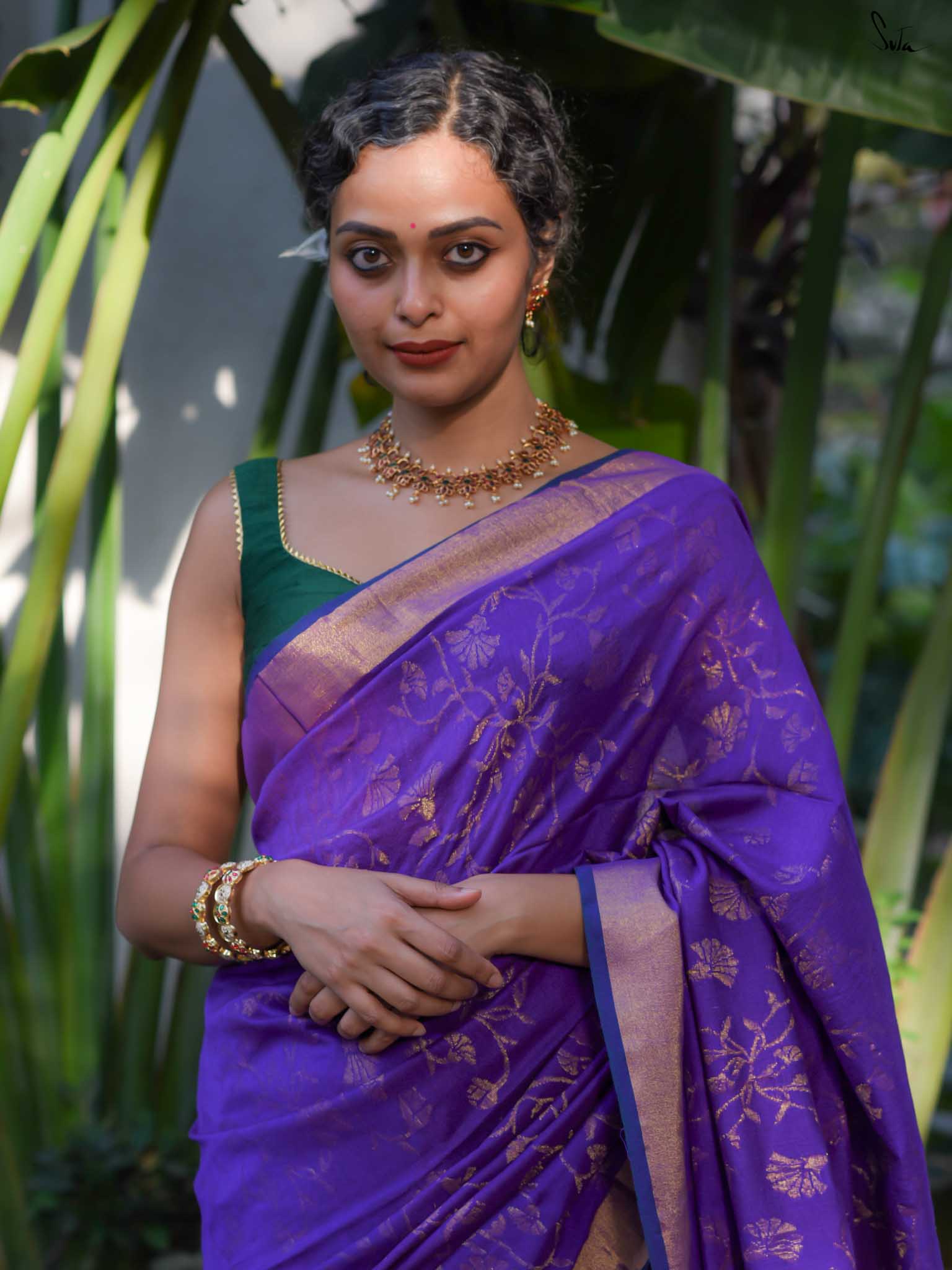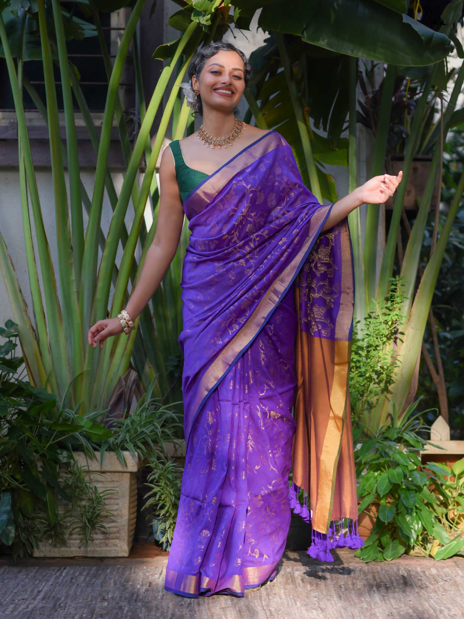 True to her name, Bondona wove this cotton-acrylic saree with prayerful attention to every detail. The rich purple body shimmers with allover gold zari floral motifs, finished with a solid gold pallu and matching tassels.
