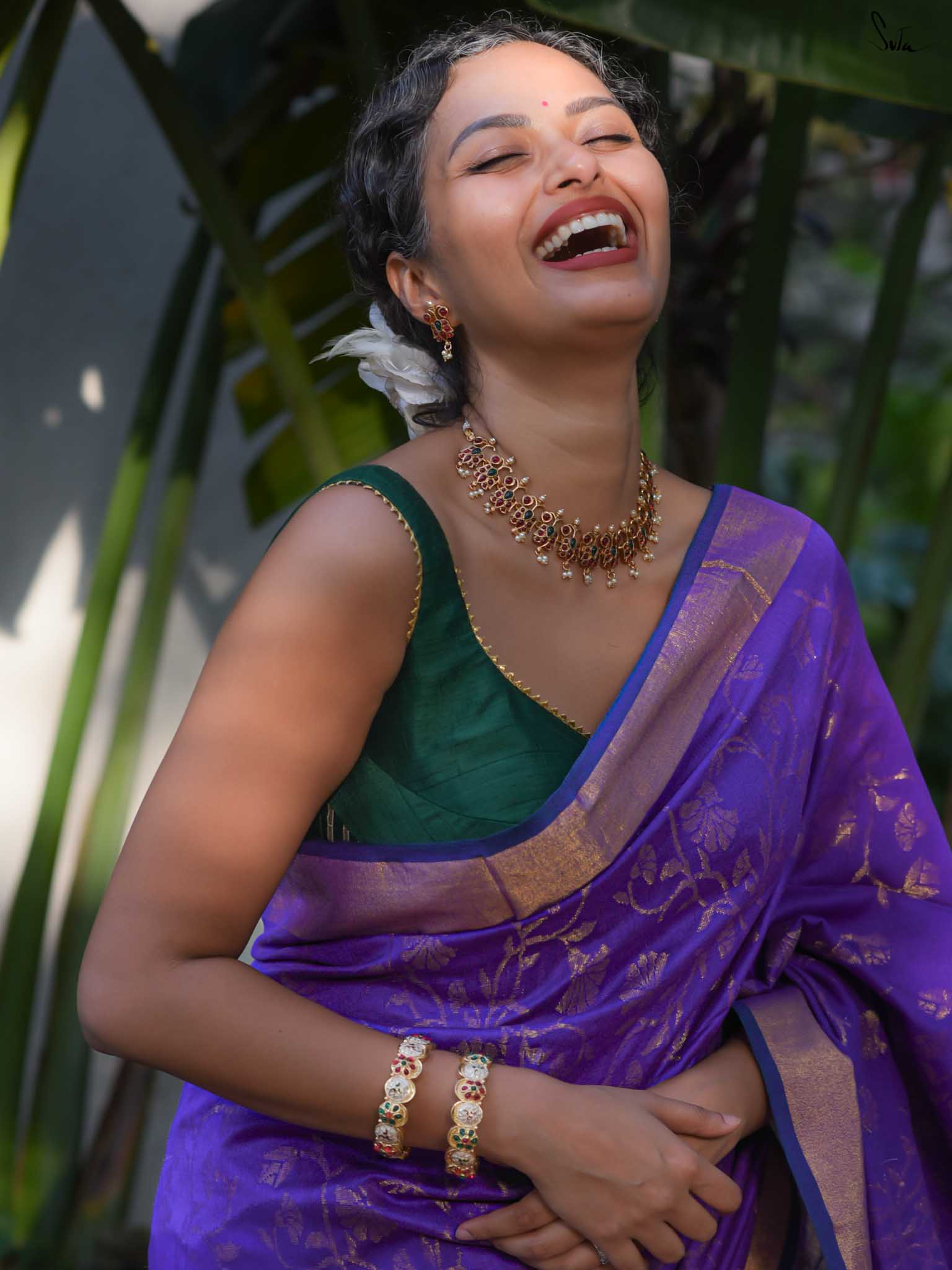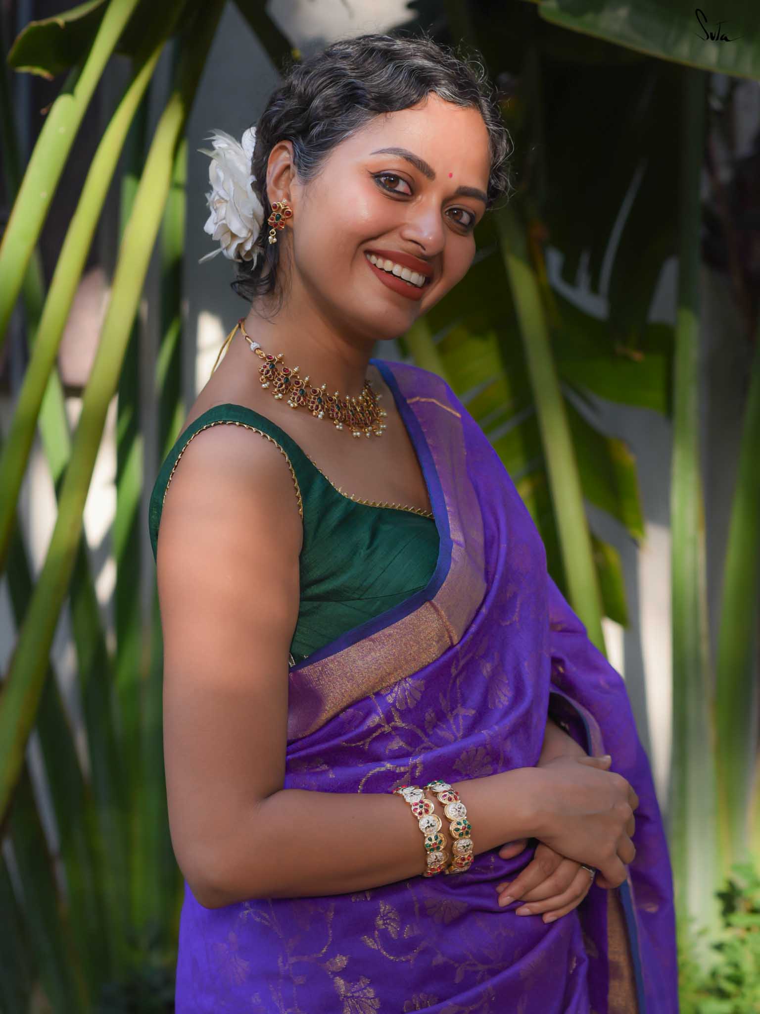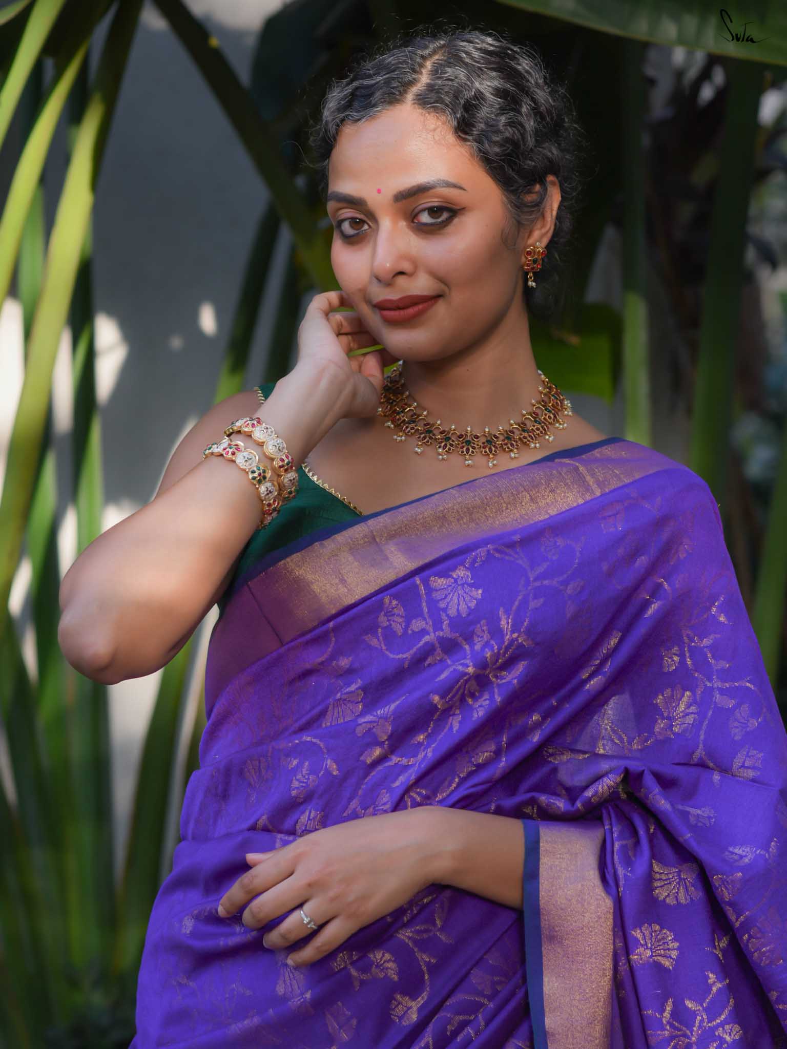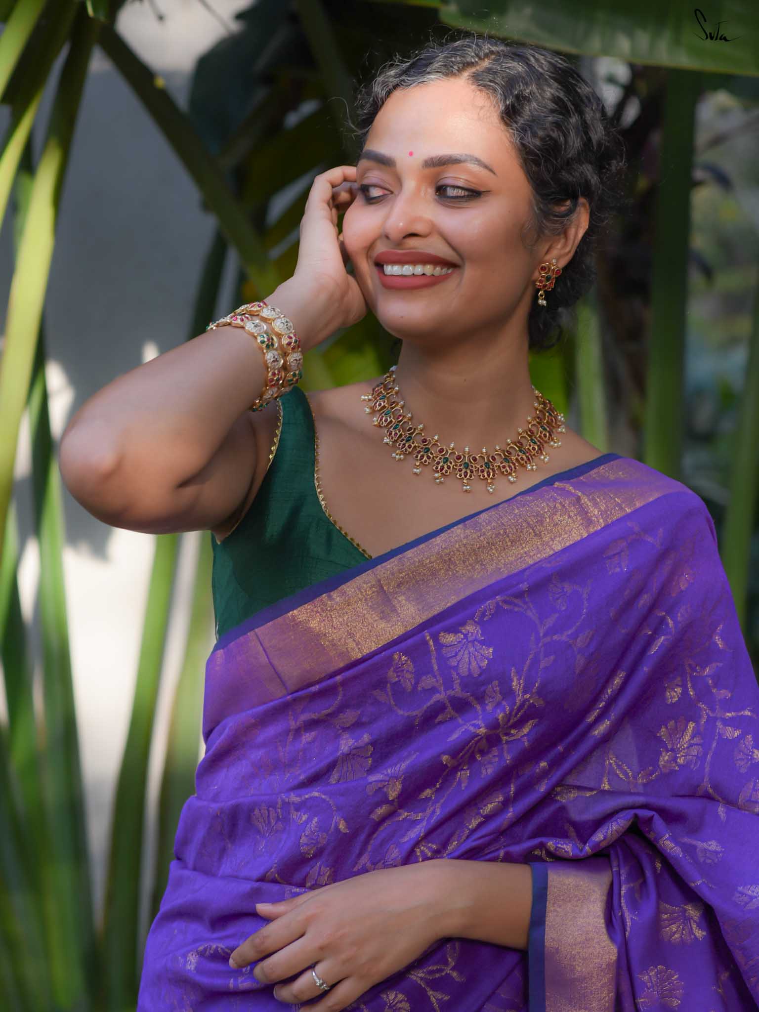 True to her name, Bondona wove this cotton-acrylic saree with prayerful attention to every detail. The rich purple body shimmers with allover gold zari floral motifs, finished with a solid gold pallu and matching tassels.
