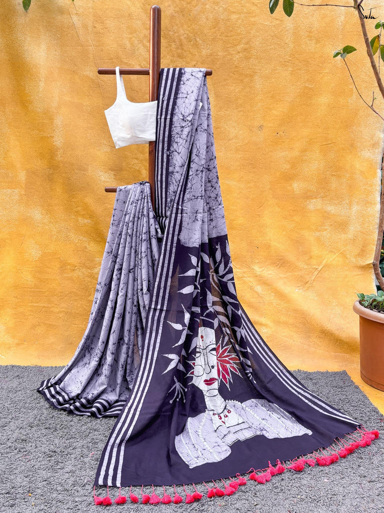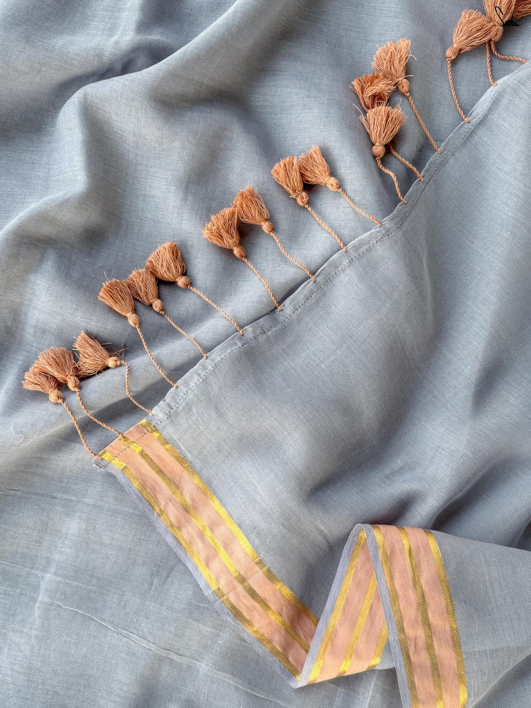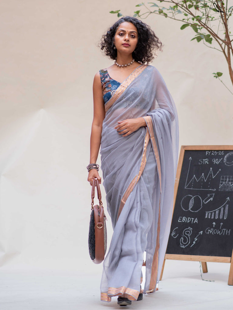 Calm, composed, and quietly elegant - Ash Phool is summer cotton at its most understated. Crafted in soft mul cotton, this bluish grey saree drapes lightly and feels feather-soft on the skin. A classic gold zari border adds a gentle shimmer, keeping the look timeless and refined.Perfect for long days, subtle dressing, and effortless repeats, Ash Phool is comfort with a touch of glow.