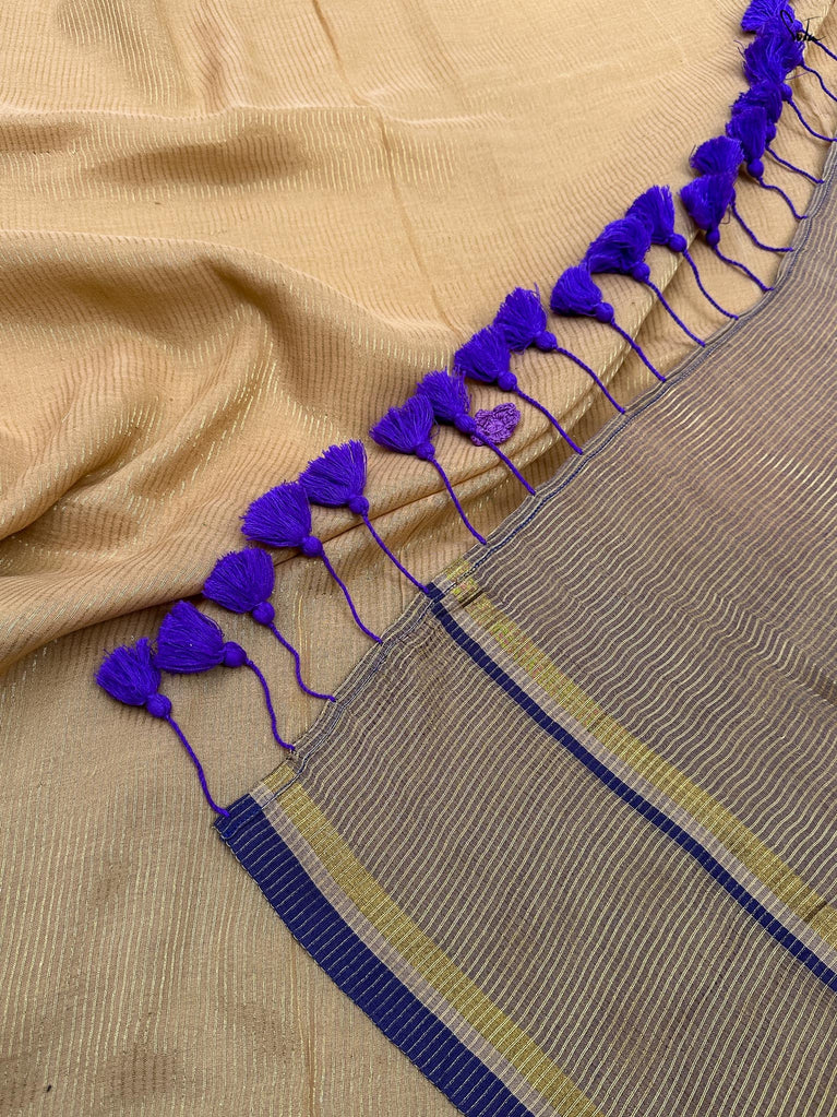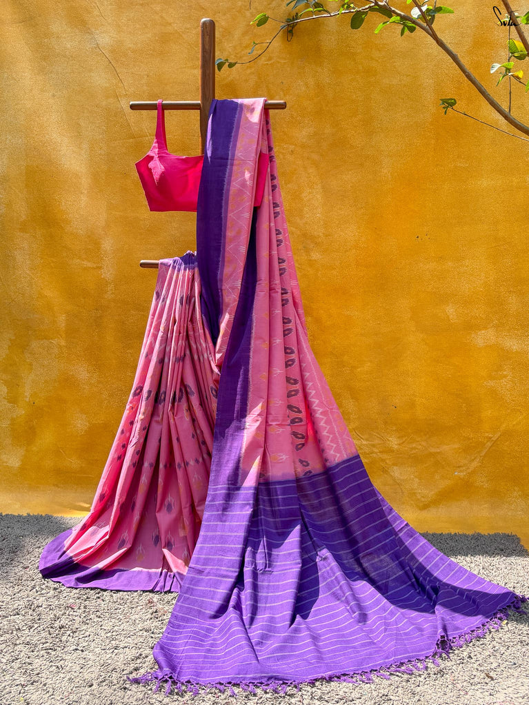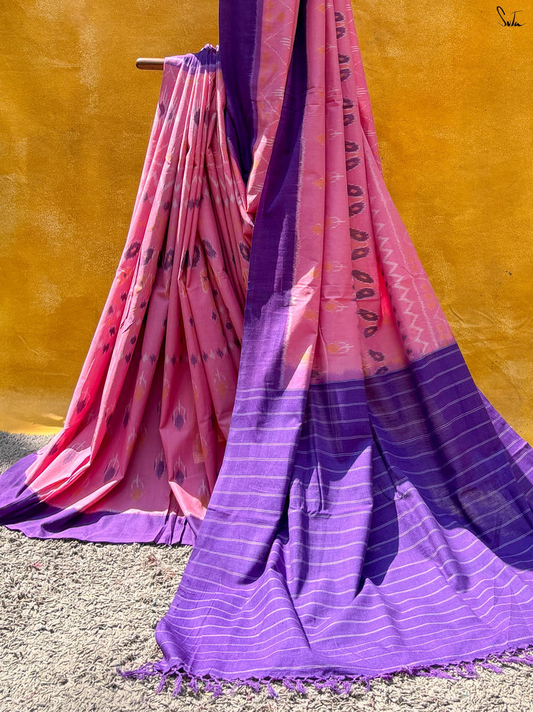 The Twilight Sitara saree is a stunning gray cotton slub piece featuring an elegant zari border and intricate zari stripes that adorn the body. With a contrasting purple selvedge and a magenta pallu embellished with zari checks, this saree beautifully blends sophistication and vibrancy. Perfect for any evening event, drape yourself in this saree and let the twilight inspire your enchanting presence!