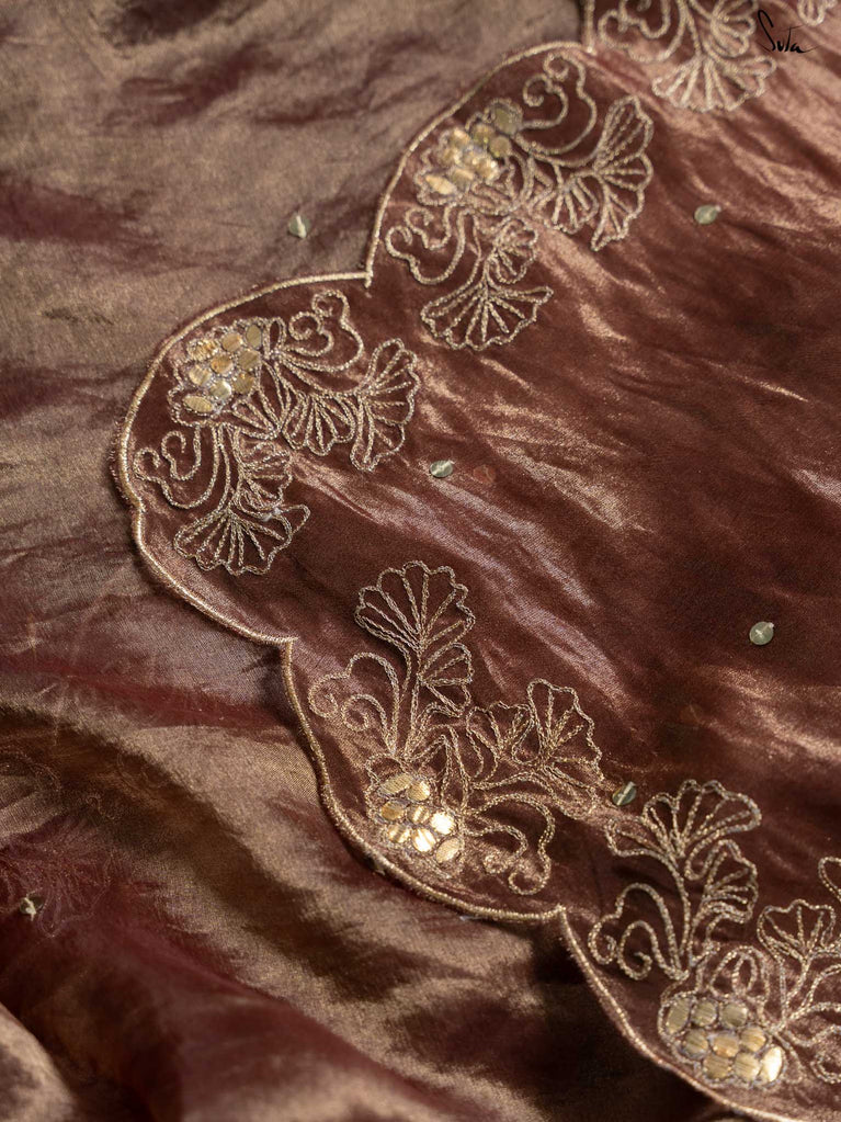 Like the silver glow of the moonlight, Arnika captures the essence of a starlit night. This rust tissue silk saree is hand-embellished with an all-over chumki work and a scalloped hand-embroidered gota patti border. Its subtle sparkle highlights your inner radiance, making Arnika perfect for moments when you want to shine with quiet elegance.