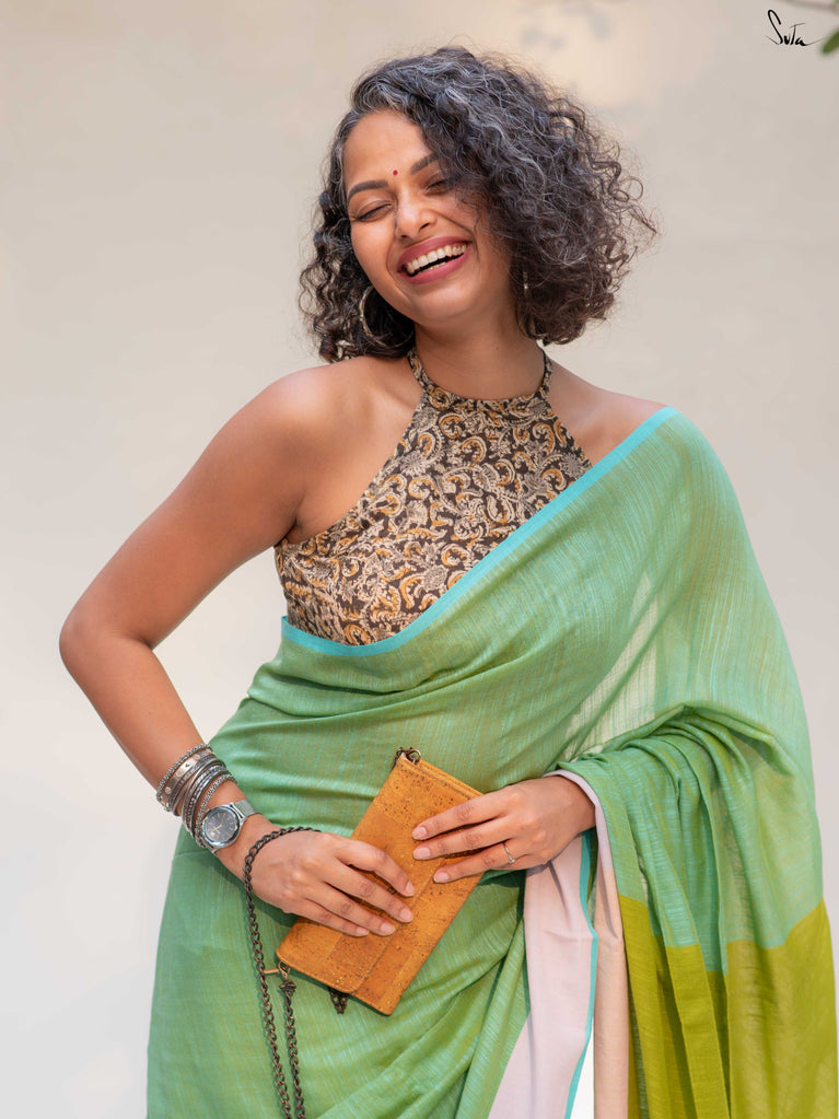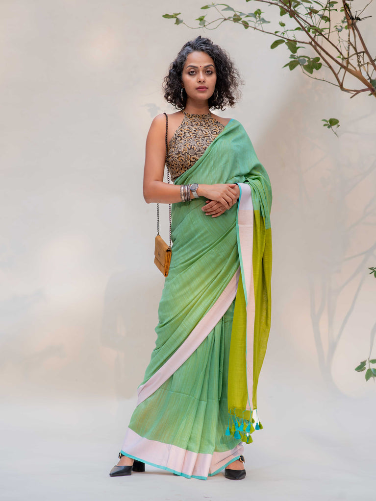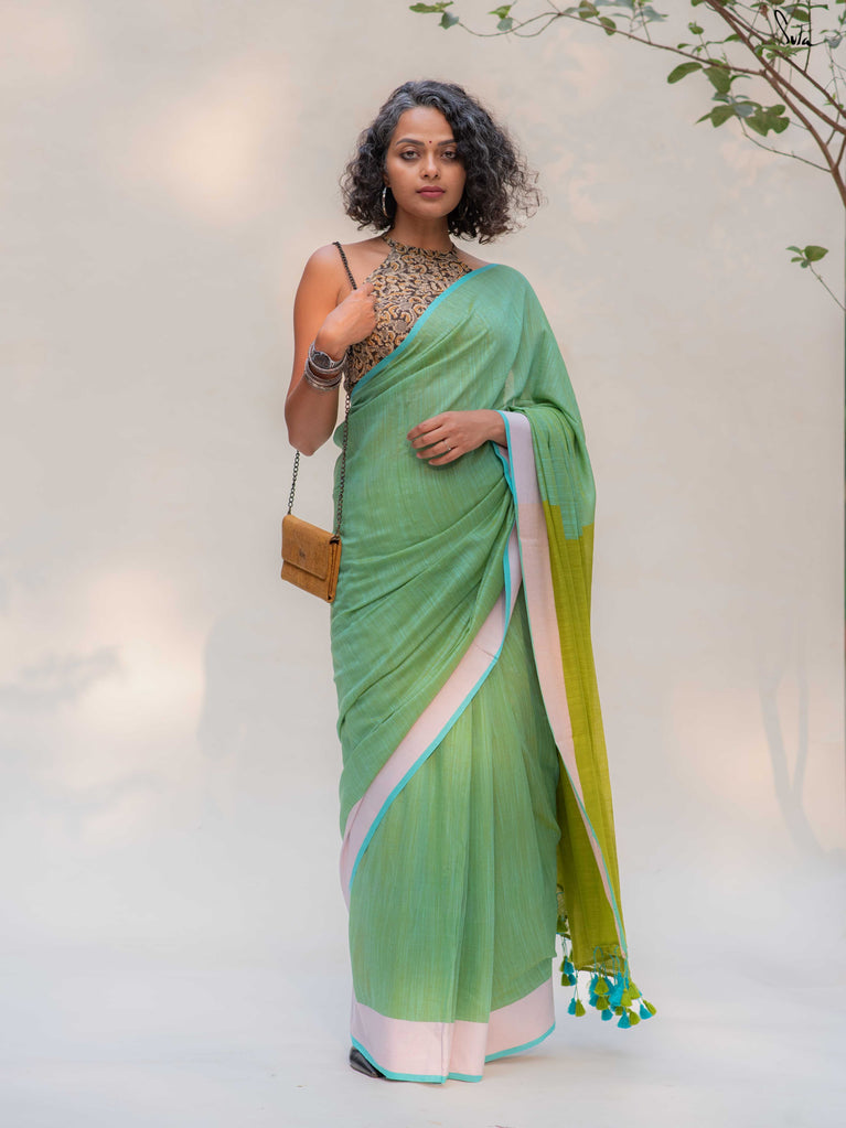 Fresh, light, and quietly playful - Fennel Phool feels like a soft summer breeze. Crafted in breathable cotton, this pista green saree is framed with a pale pink border that adds a gentle blush, while the contrast lime green pallu brings in an unexpected pop.Easy on the skin and easy to style, it’s made for long days, warm weather, and looks you’ll keep coming back to.