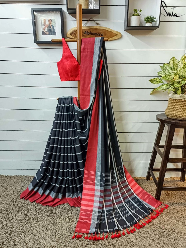Dive into your wildest dreams in our beige with a thin lavender and red border saree. The comfort of mul-mul cotton will win your heart.