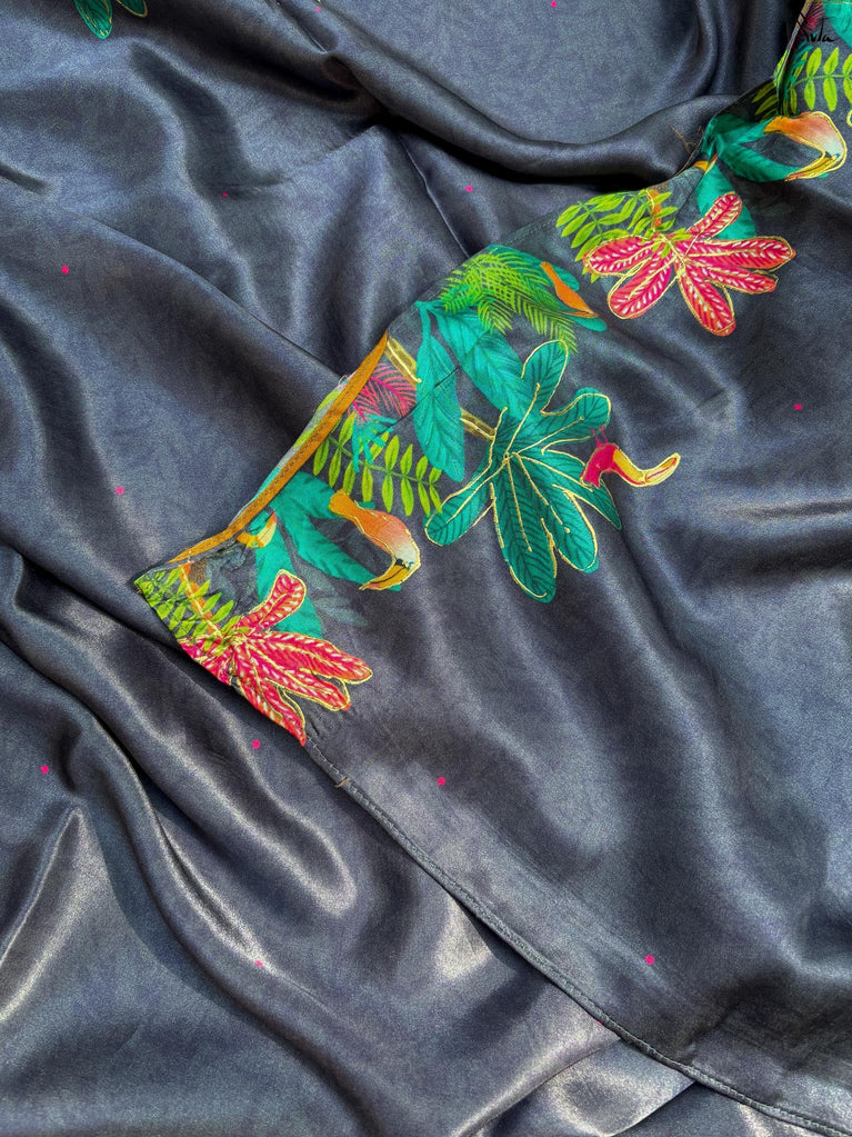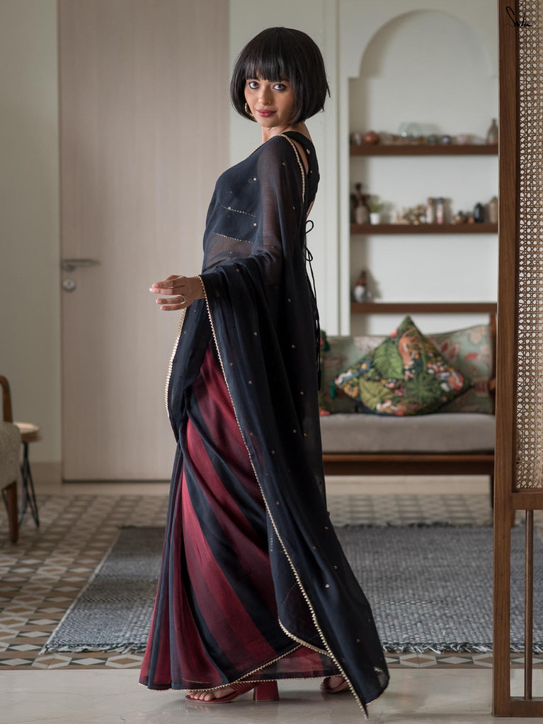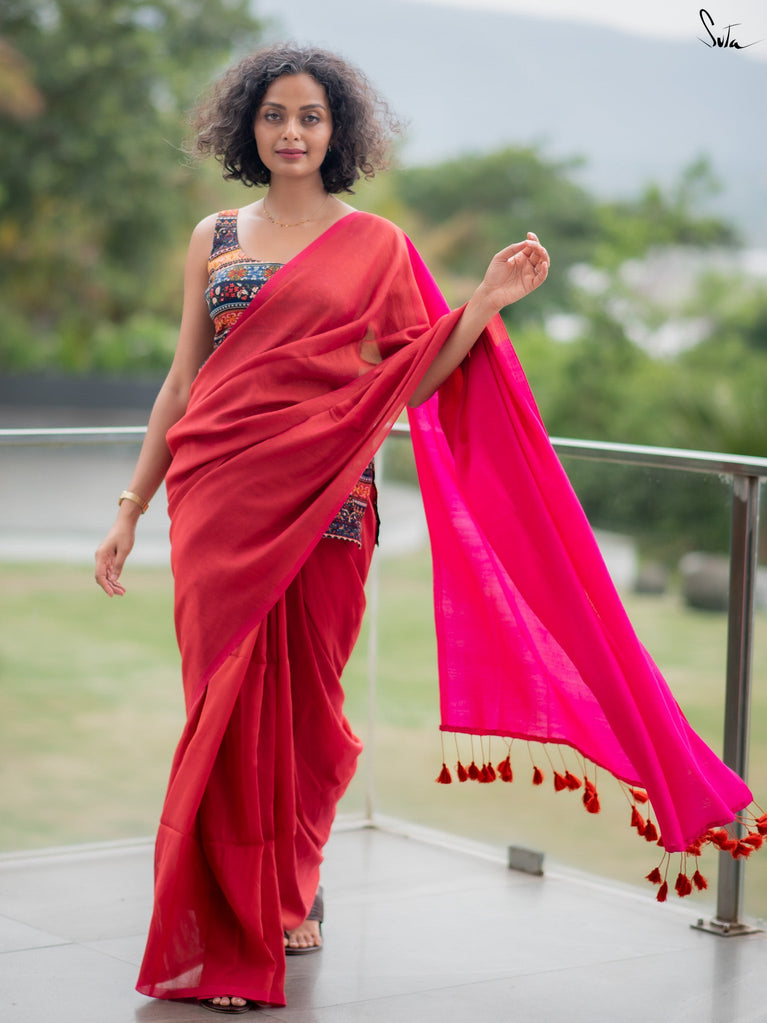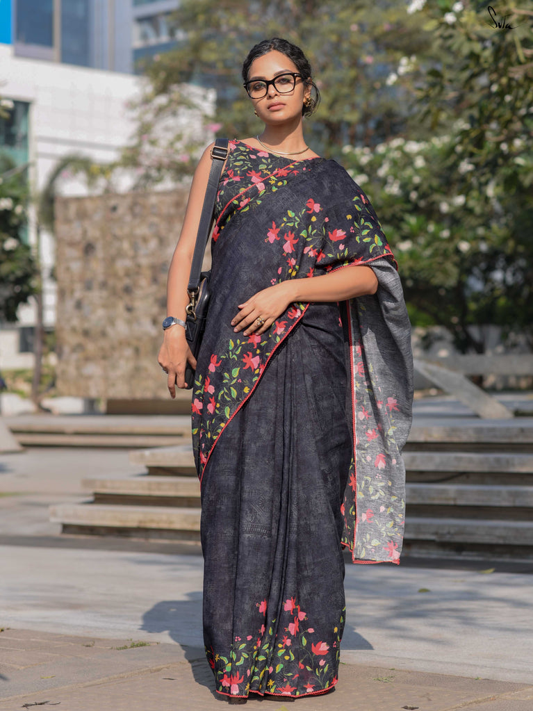 A black base saree that’s easy to wear and easy to style. Made from a soft cotton-linen blend, this saree feels light, breathable, and comfortable for all-day wear.Digital floral prints inspired by fuchsia flowers run across the saree, adding a fresh pop against the black base. Finished with delicate contrast red lace detailing, it brings just the right amount of colour and character without feeling overdone.Ideal for everyday workwear, casual office days, or simple outings when you want something effortless yet put together.