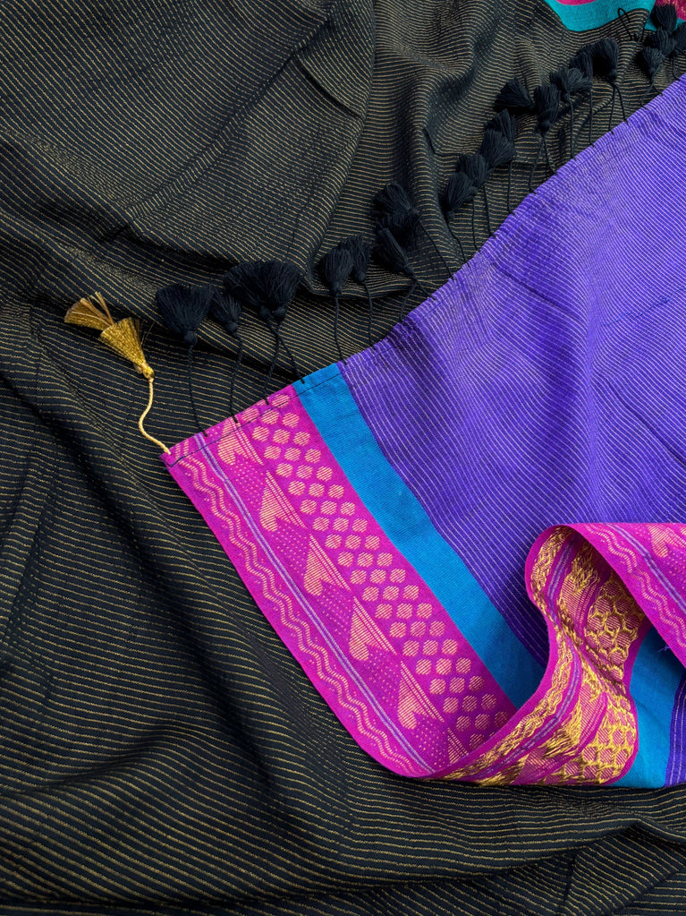 The exquisite 'Andheri Raat' saree is crafted from rich acrylic cotton with zari and features a contrasting pallu that playfully complements the black base. A contrasting thick zari border adds an extra layer of charm to this beautiful ensemble. Pair it with Suta's 'Surabhi' blouse and experience the colorful magic behold!