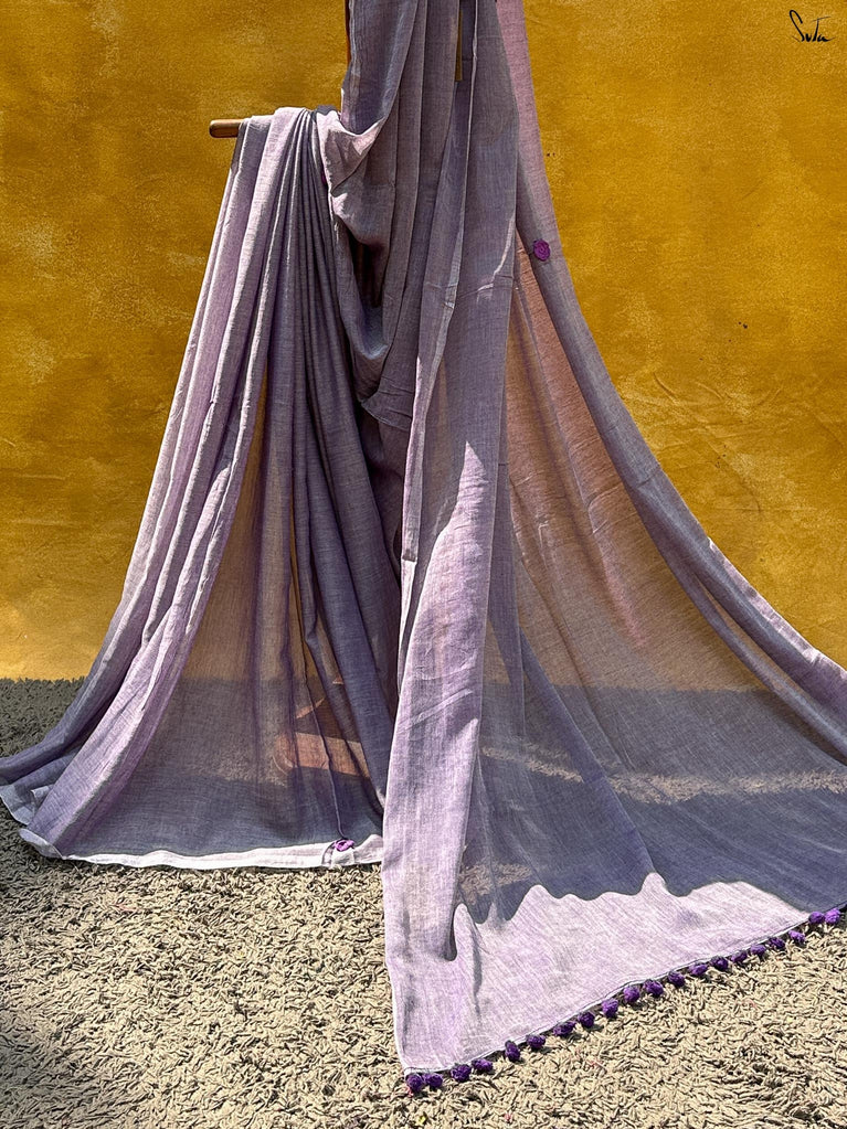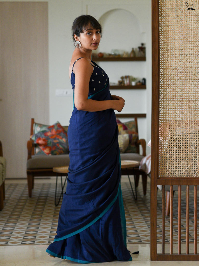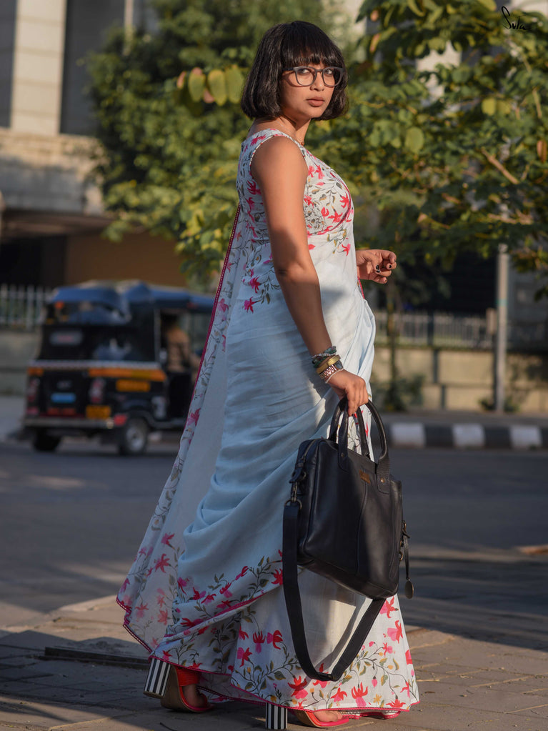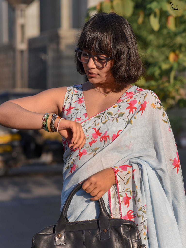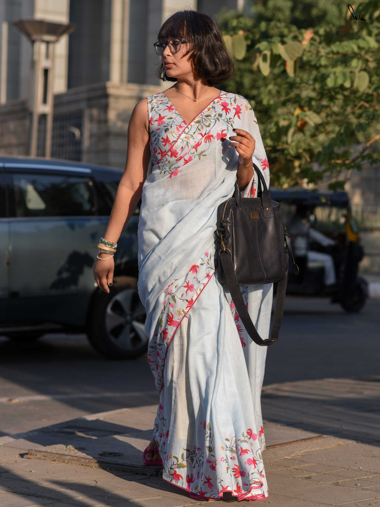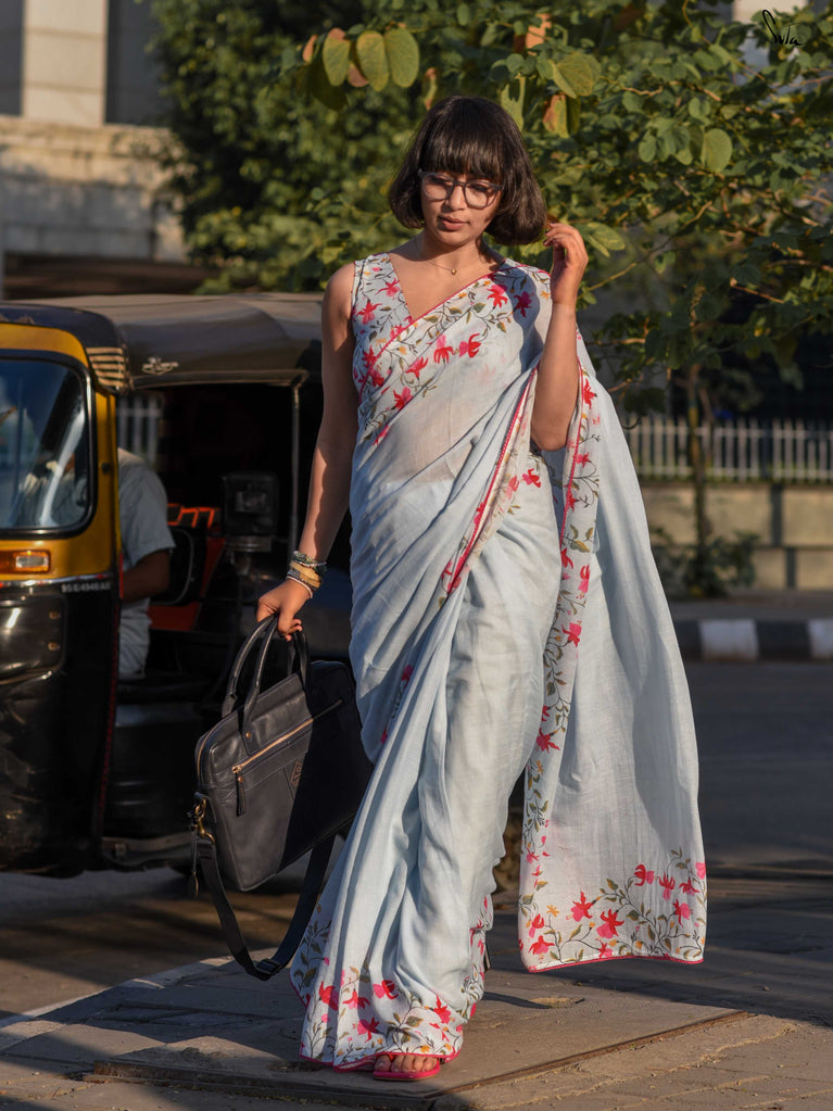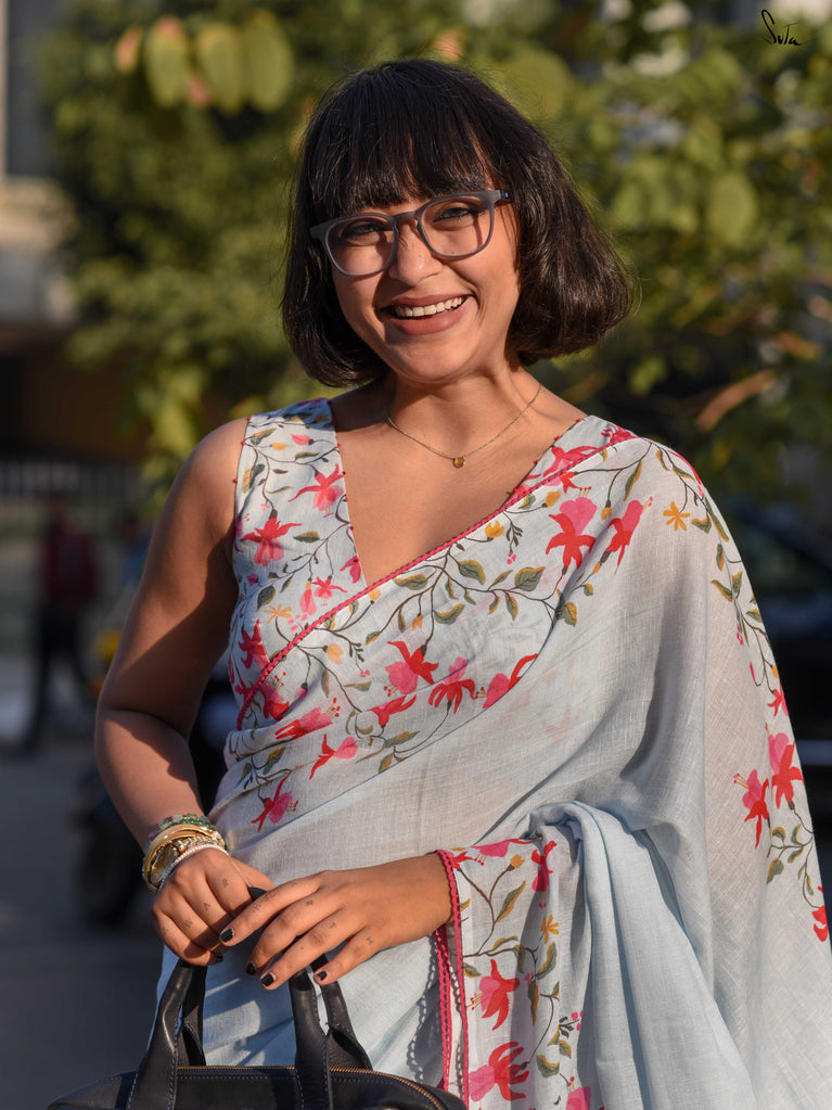 A fresh blue base saree designed for easy, everyday wear. Made from a soft cotton-linen blend, this saree is breathable, lightweight, and comfortable enough to carry through long workdays.The saree features digital floral prints inspired by fuchsia flowers, adding a soft contrast to the blue base. Delicate pink lace detailing along the border brings in a subtle pop of colour, keeping the look balanced and wearable.Ideal for office wear, casual meetings, or everyday outings when you want something simple yet polished.