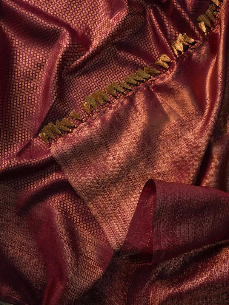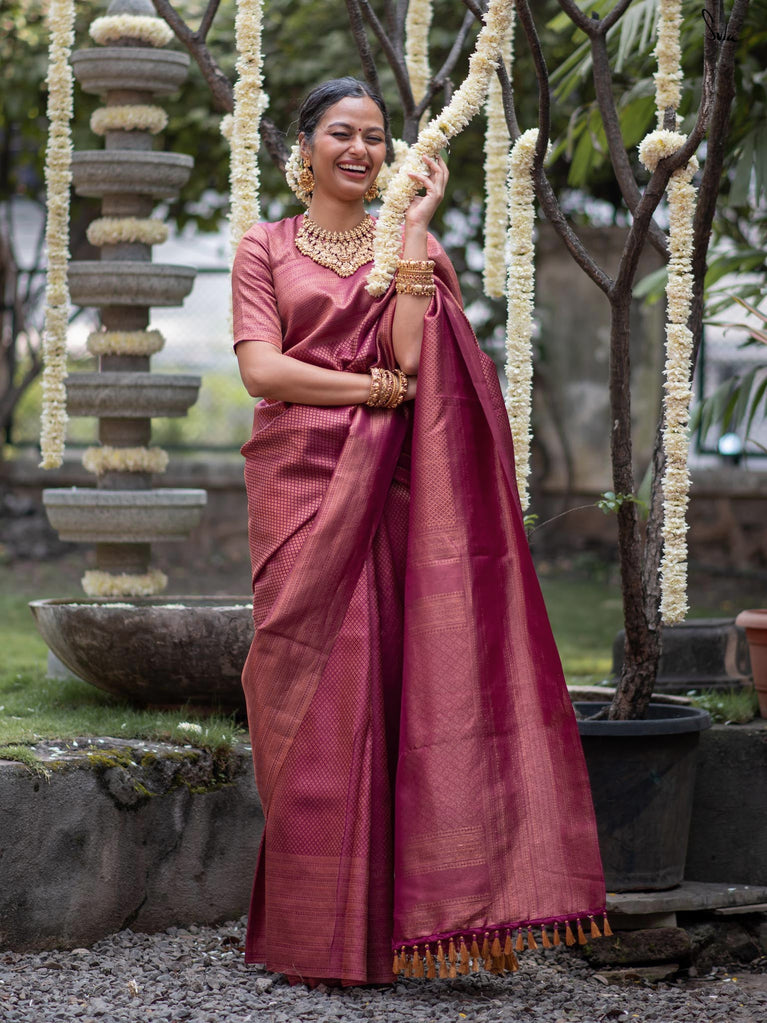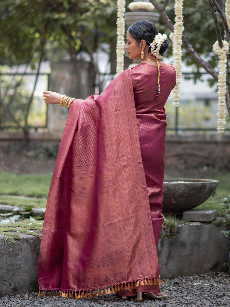 Anvika, a 100% silk Kanjivaram in pink unfolds like the delicate petals of festive blooms. Its intricate zari work and metallic tassels reflect the beauty of nature’s simplicity. Perfect for creating memories and embracing joy, it comes with a matching blouse piece for a complete, radiant look.