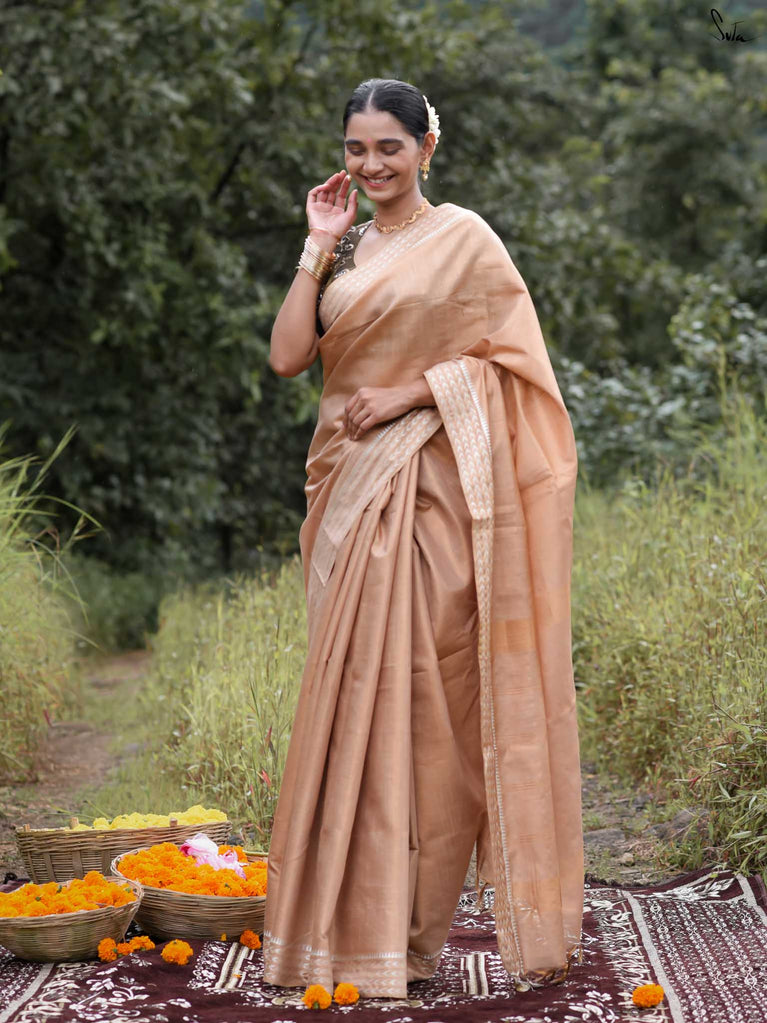 A gold saree that feels regal and luminous. The shade glows with liquid confidence and timeless charm. The geometric dobby border adds texture and balance, giving the saree a refined finish. Perfect for festive evenings that call for effortless elegance. Comes with a matching blouse piece, no fall.
