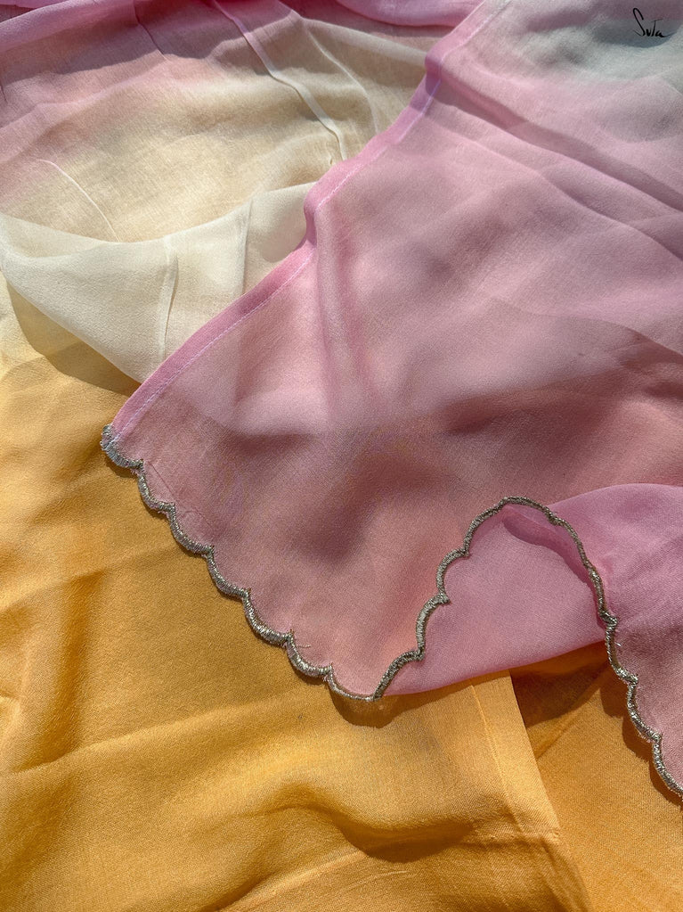 Light as air and translucent like a rainbow, organza silk is a fabric that exudes delicate grandeur. Woven with twisted silk yarn on the warp as well as the weft, this fabric is hailed for its slight transparency and its slightly stiff and yet fluid texture. The slight sheen adds to its charisma, making it the perfect saree to drape for both festive and formal occasions.