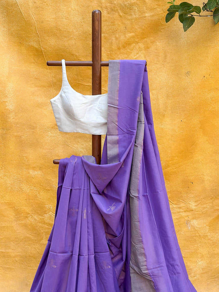 Inspired by the first ray of dawn, Dancing Dhoop makes you dance with joy. This Purple and magenta mul cotton saree brings two bright moods in one soft drape.Woven zari lines grace the pallu, while orange accents add a playful charm to the saree. Pink and purple tassels at the edges bring a touch of cheer. This piece is perfect for breezy brunches and carefree evenings.