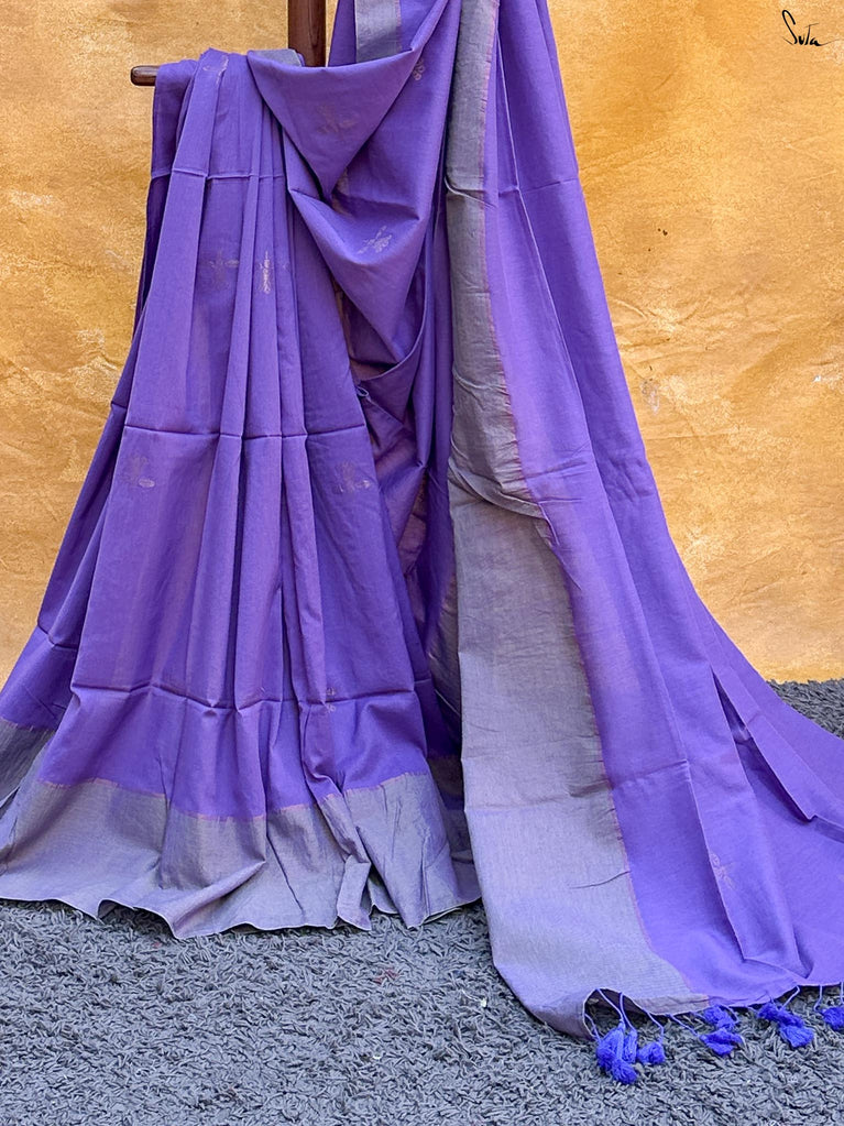 This gorgeous made-in-heaven mul cotton saree in purple with pink tassels and beautiful Ghicha lines on the pallu and zari border is enough in itself to make a stunning statement!