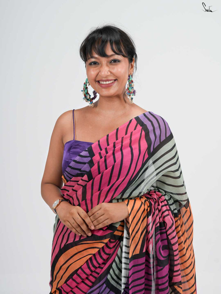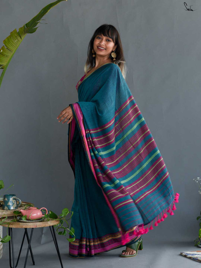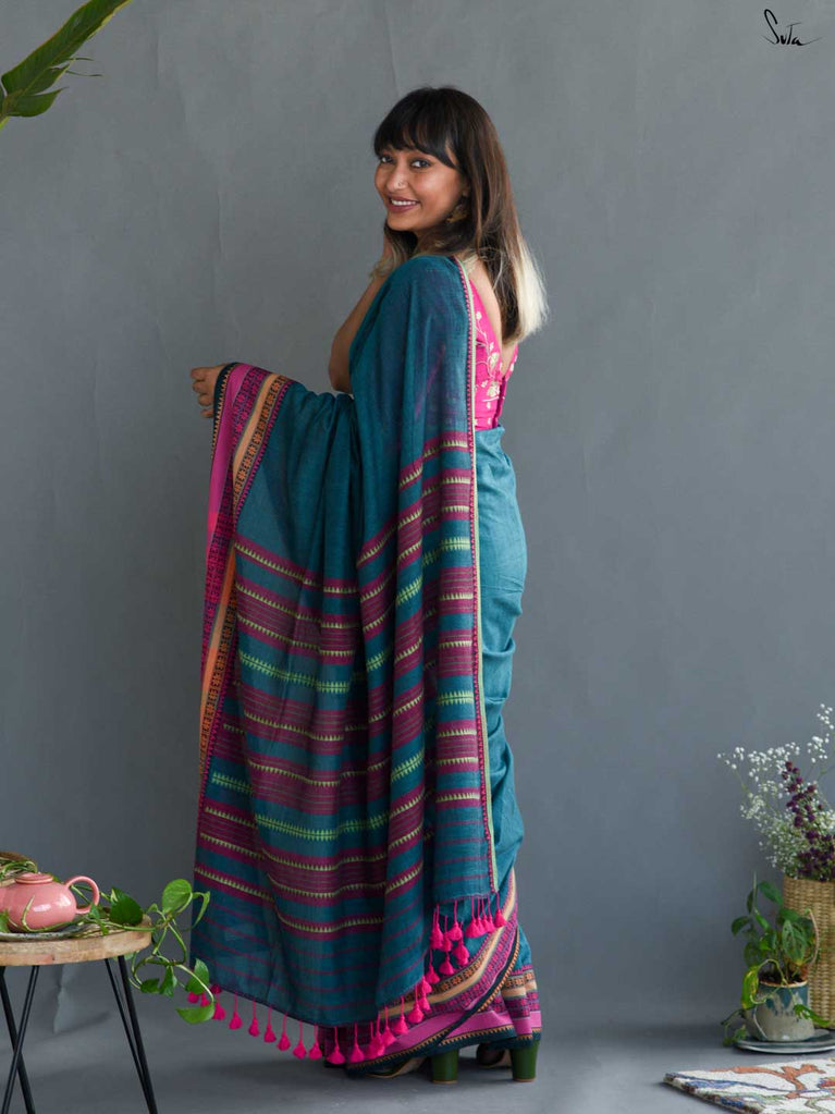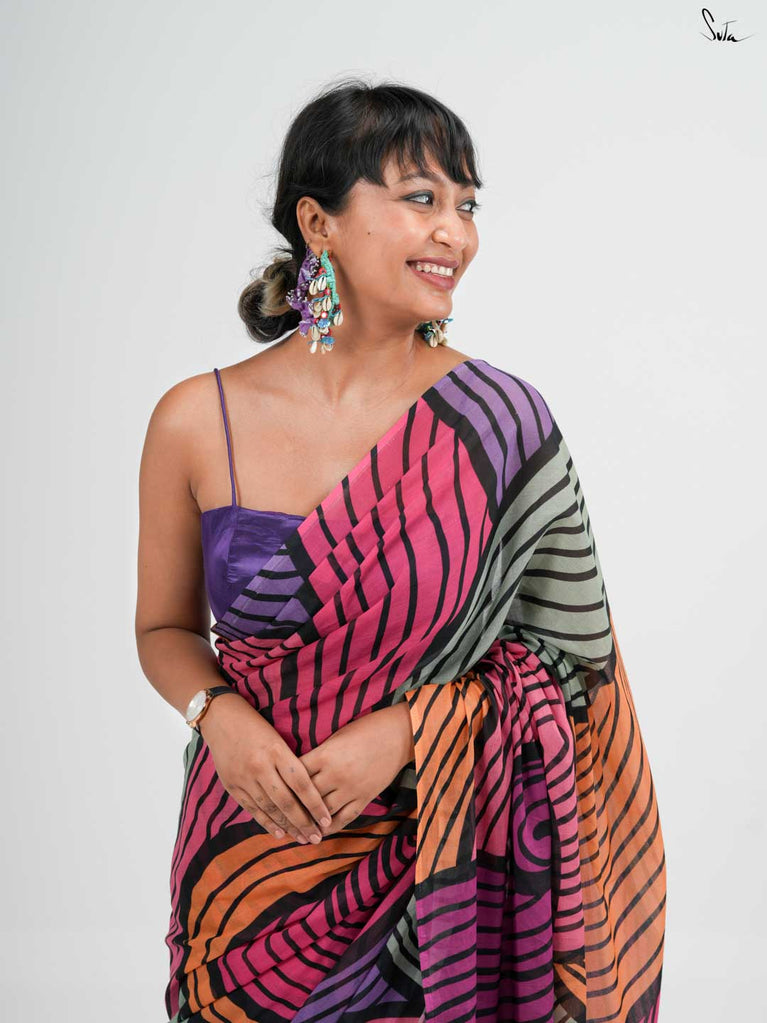A rainbow of tradition, this multicolored mul khesh saree captures the essence of Holi in its vibrant, handwoven stripes. Each handwoven thread tells a story of craftsmanship passed down through generations, woven with care and joy. The playful jhalar tassels, like droplets of color, swing with every step, carrying a mischievous wink that only the festival of colors can bring. Wrapped in this saree, you’re wearing the spirit of an age-old tradition, reimagined for today’s celebrant.